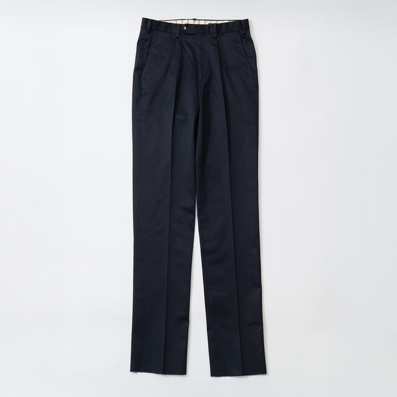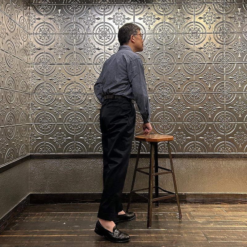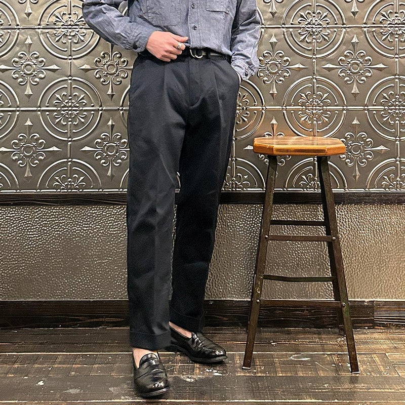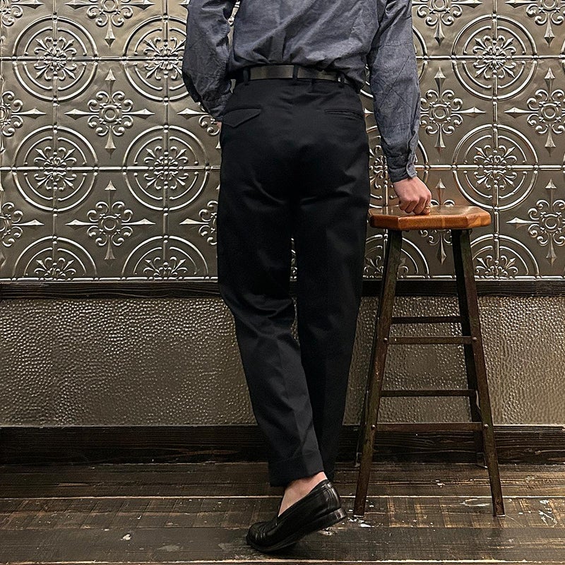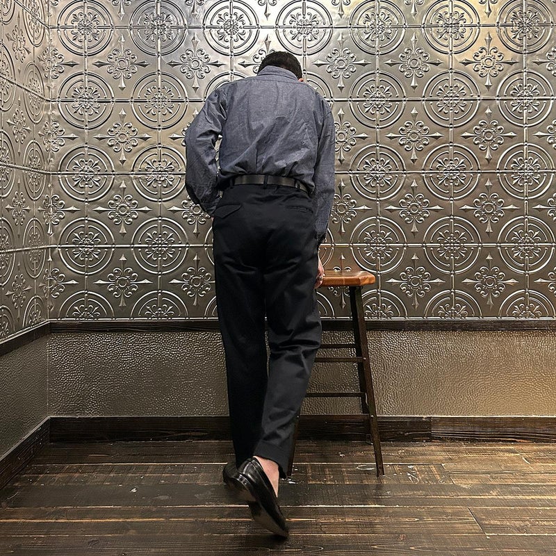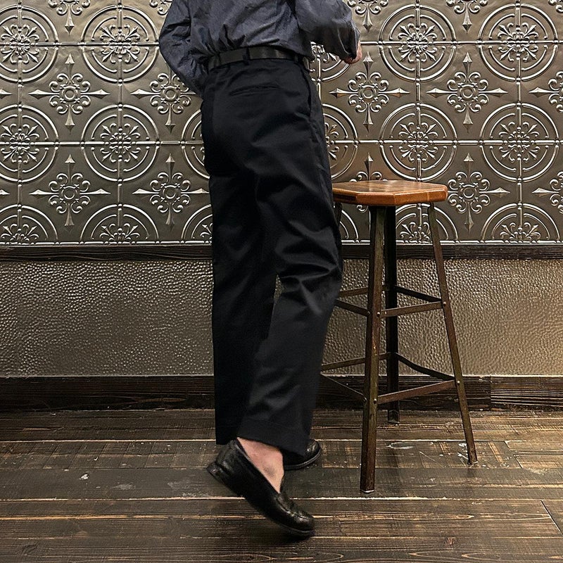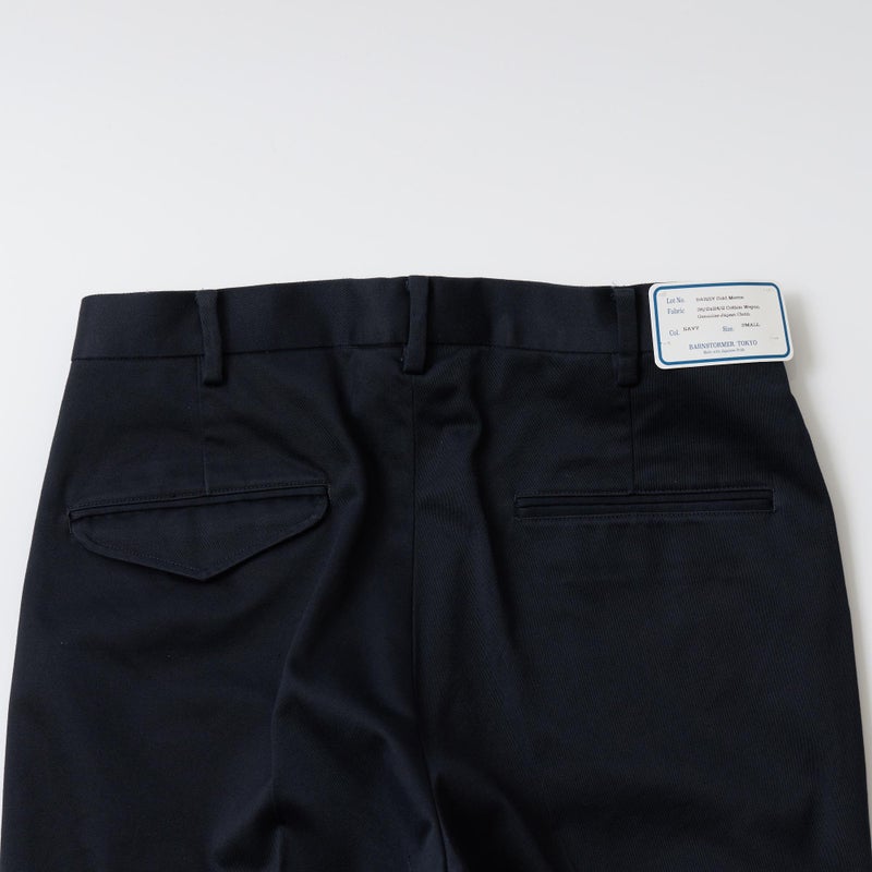 BARNSTORMER(バーンストーマー)の"BARRY" COLD MERCERISED WEST POINT CHINO CLOTH。当店がバーンストーマーに型から完全別注した「BARRY バリー」。某アメリカの有名ブランドのチノをベースにアレンジを加えて型から完全別注。フロントはカジュアルさを演出する為にアウトタック仕様でゆとりのある腰回りに。ボトムに向かって緩やかにテーパード。股上、ワタリ、裾幅まで細かい修正を何度も繰り返した渾身の一本。着用するスタイルを選ばない穿き易いシルエット。前立てはジップフロント、バックポケットは向かって左側がフラップ付きポケット。右側はフラップなし。アメリカのスラックス専業ブランドを彷彿とさせる紙のフラッシャーも別注のポイント。素材はアメリカの陸軍士官学校の制服に由来するウェストポイント(通称ウェポン)生地を使用。更にその生地に「コールドマーセ」という今では幻の技術と言われる加工が施されています。コールドマーセは樹脂を-16度で凍らせながら浸透させる技術。フラットで美しい表面ができパリッとした質感が特徴的な素材。裾は裾上げされていない未処理(フラシ)状態。着用時には裾上げが必要になります。 納品時にワンウォッシュしてあるので洗濯による大幅な縮みの心配はございません。