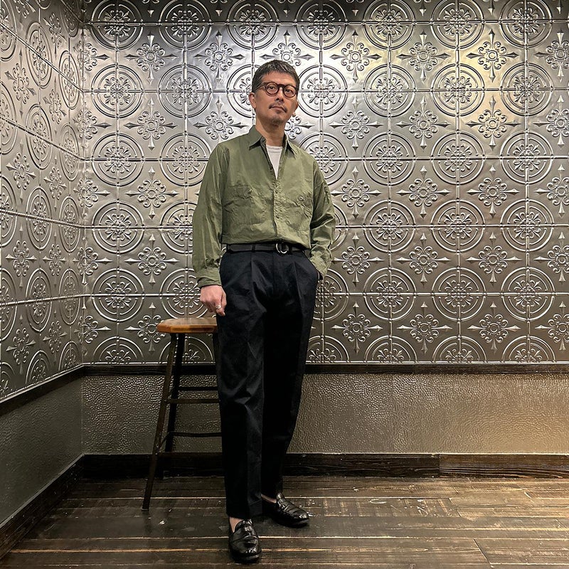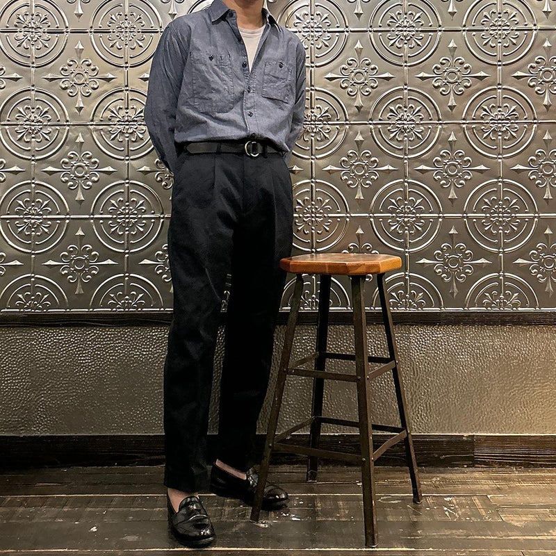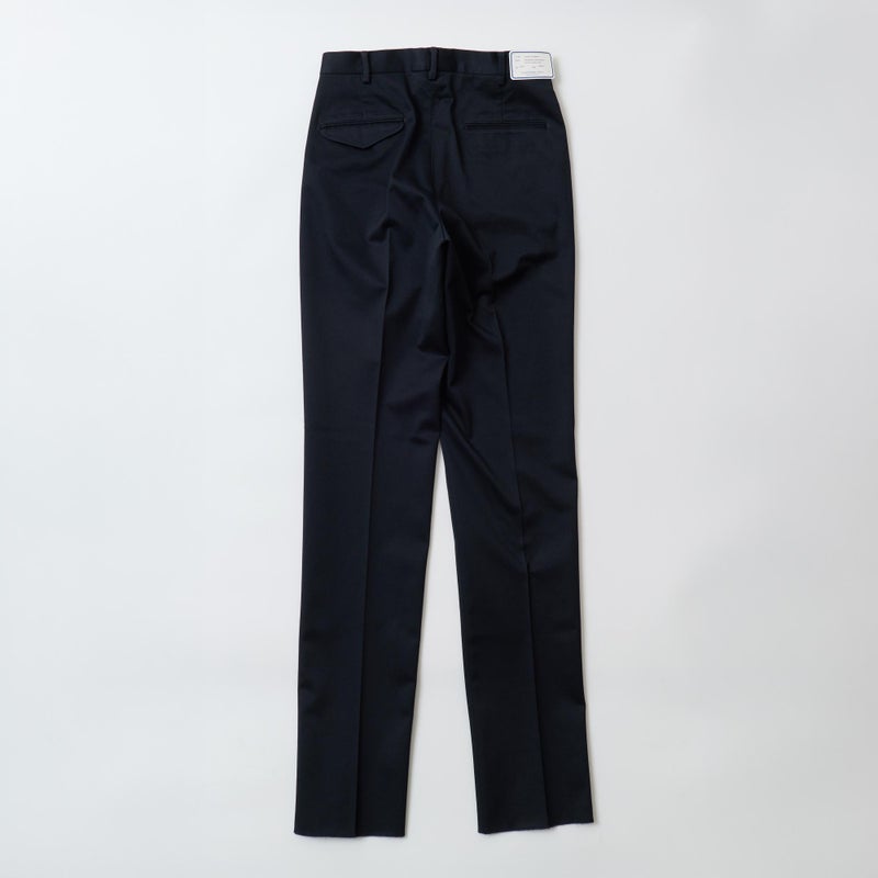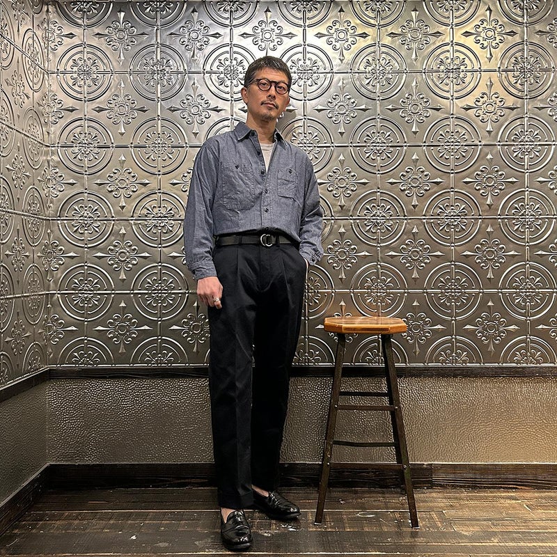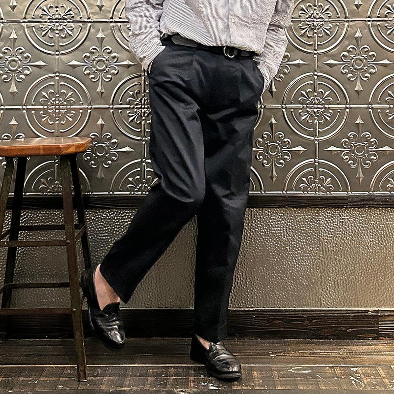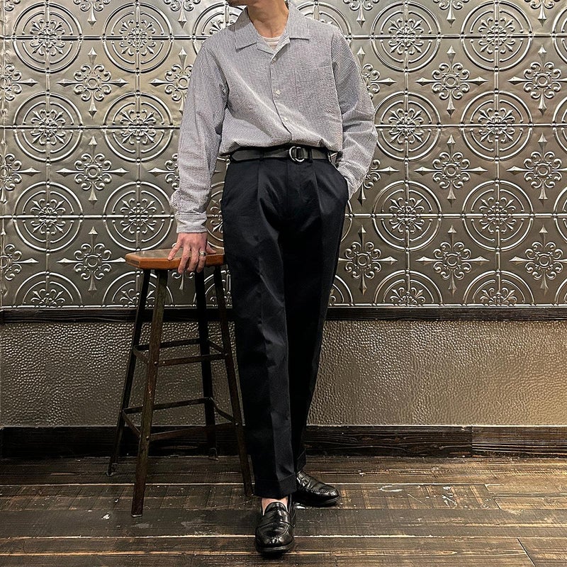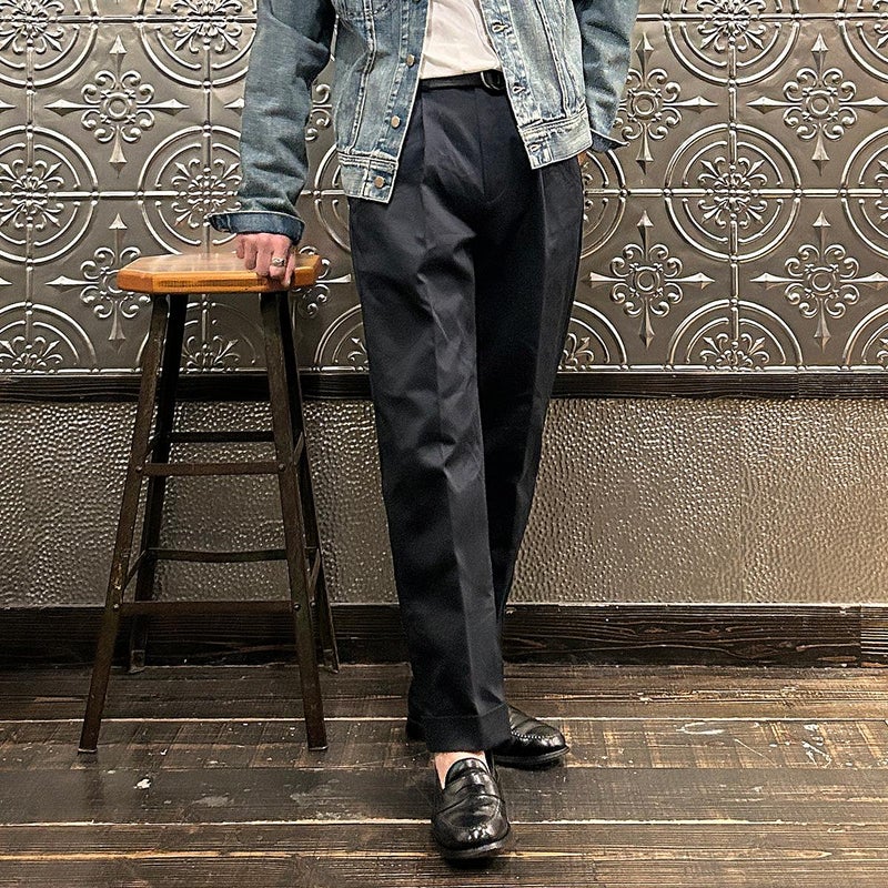 BARNSTORMER(バーンストーマー)の"BARRY" COLD MERCERISED WEST POINT CHINO CLOTH。当店がバーンストーマーに型から完全別注した「BARRY バリー」。某アメリカの有名ブランドのチノをベースにアレンジを加えて型から完全別注。フロントはカジュアルさを演出する為にアウトタック仕様でゆとりのある腰回りに。ボトムに向かって緩やかにテーパード。股上、ワタリ、裾幅まで細かい修正を何度も繰り返した渾身の一本。着用するスタイルを選ばない穿き易いシルエット。前立てはジップフロント、バックポケットは向かって左側がフラップ付きポケット。右側はフラップなし。アメリカのスラックス専業ブランドを彷彿とさせる紙のフラッシャーも別注のポイント。素材はアメリカの陸軍士官学校の制服に由来するウェストポイント(通称ウェポン)生地を使用。更にその生地に「コールドマーセ」という今では幻の技術と言われる加工が施されています。コールドマーセは樹脂を-16度で凍らせながら浸透させる技術。フラットで美しい表面ができパリッとした質感が特徴的な素材。裾は裾上げされていない未処理(フラシ)状態。着用時には裾上げが必要になります。 納品時にワンウォッシュしてあるので洗濯による大幅な縮みの心配はございません。
