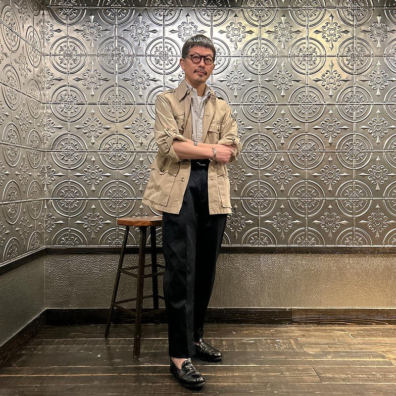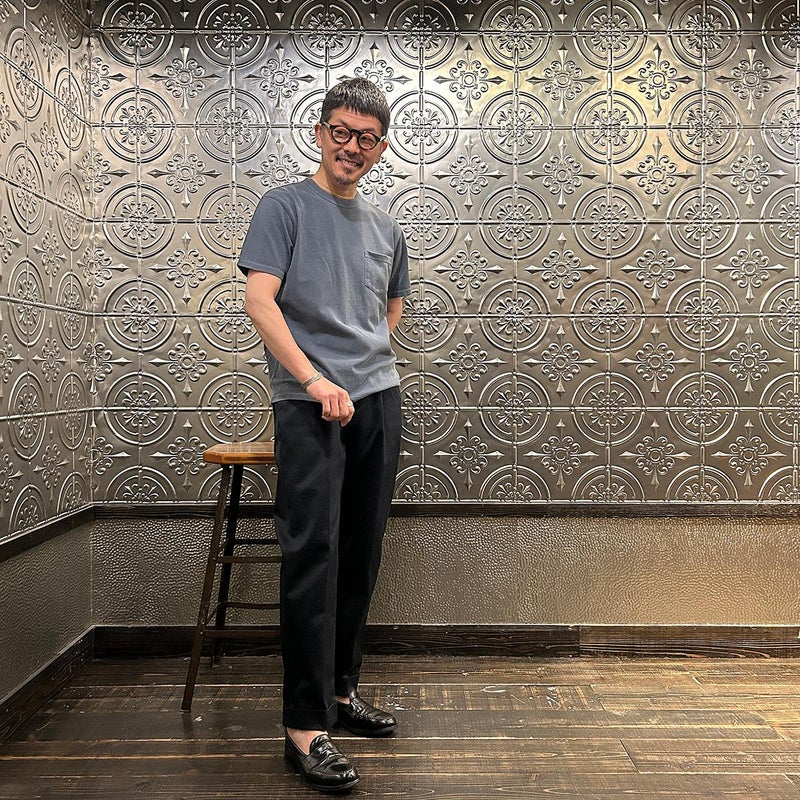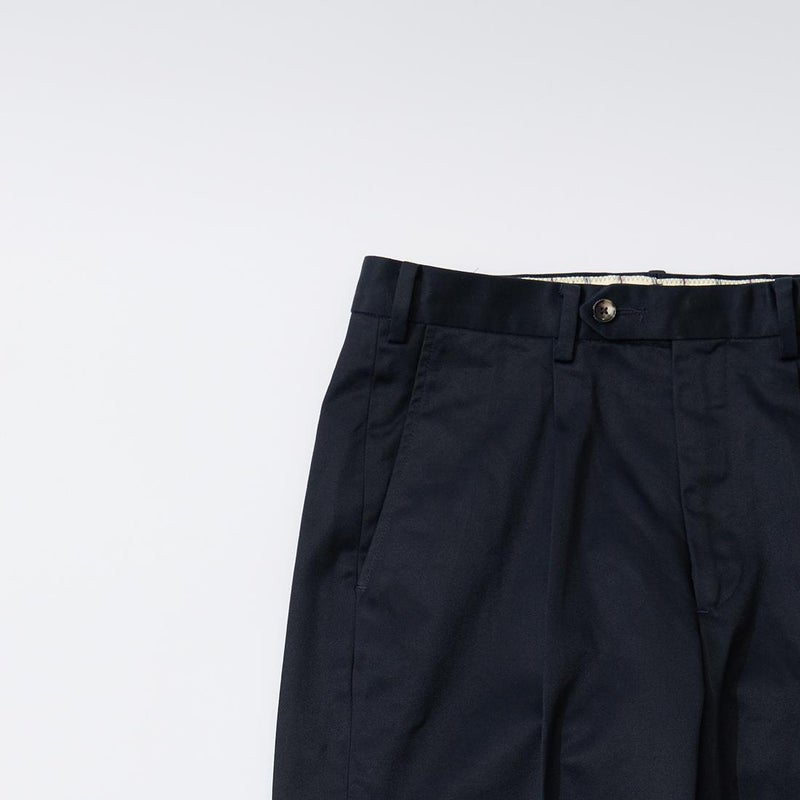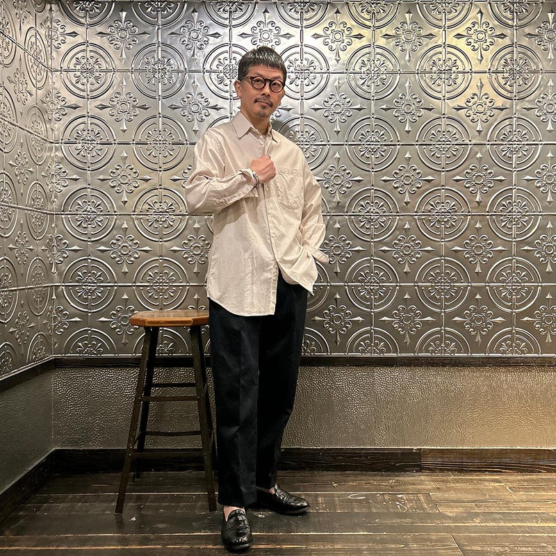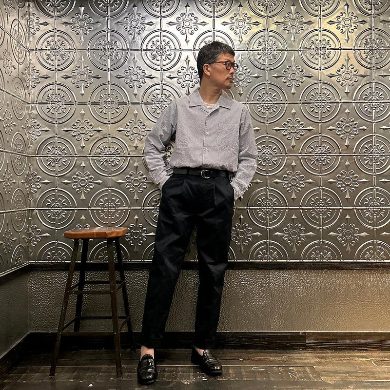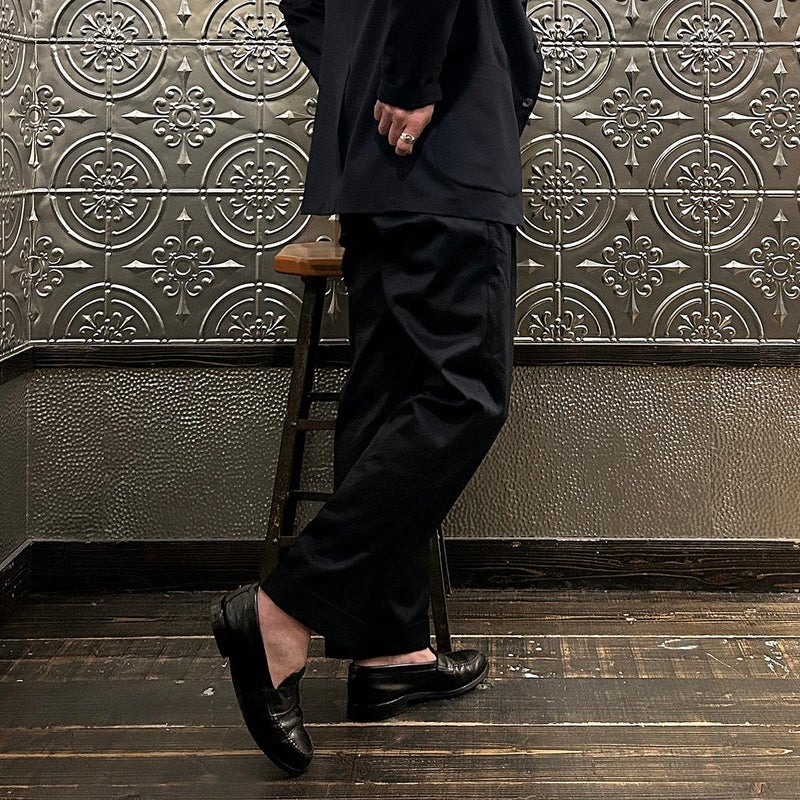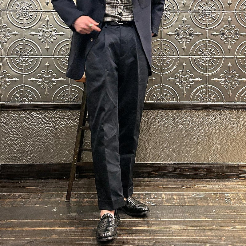 BARNSTORMER(バーンストーマー)の"BARRY" COLD MERCERISED WEST POINT CHINO CLOTH。当店がバーンストーマーに型から完全別注した「BARRY バリー」。某アメリカの有名ブランドのチノをベースにアレンジを加えて型から完全別注。フロントはカジュアルさを演出する為にアウトタック仕様でゆとりのある腰回りに。ボトムに向かって緩やかにテーパード。股上、ワタリ、裾幅まで細かい修正を何度も繰り返した渾身の一本。着用するスタイルを選ばない穿き易いシルエット。前立てはジップフロント、バックポケットは向かって左側がフラップ付きポケット。右側はフラップなし。アメリカのスラックス専業ブランドを彷彿とさせる紙のフラッシャーも別注のポイント。素材はアメリカの陸軍士官学校の制服に由来するウェストポイント(通称ウェポン)生地を使用。更にその生地に「コールドマーセ」という今では幻の技術と言われる加工が施されています。コールドマーセは樹脂を-16度で凍らせながら浸透させる技術。フラットで美しい表面ができパリッとした質感が特徴的な素材。裾は裾上げされていない未処理(フラシ)状態。着用時には裾上げが必要になります。 納品時にワンウォッシュしてあるので洗濯による大幅な縮みの心配はございません。