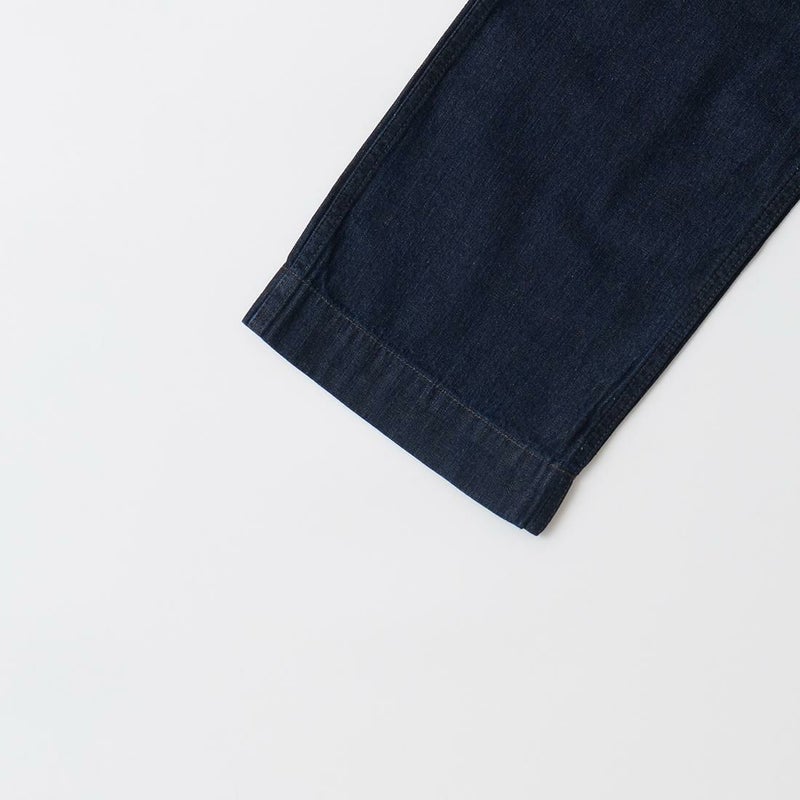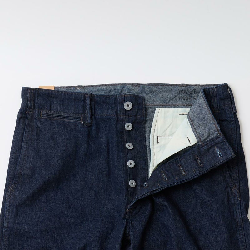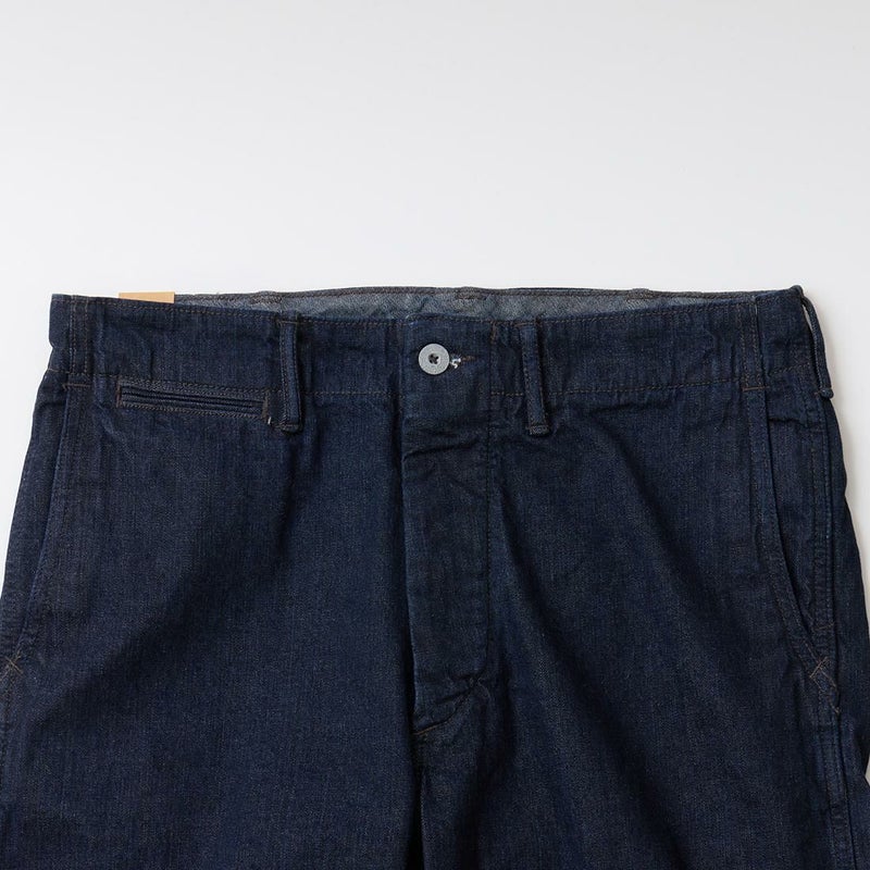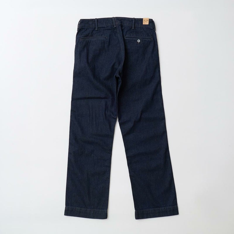 Double RL(ダブル アール エル)のFIELD CHINO FLAT PANT。1940年代のミリタリーパンツがデザインソースとされたパンツ。ボタンフライフロント。左右にスラッシュポケット。右腰にコインポケット。バックの左右にもポケットを配置。コインポケットとバックポケットは両玉縁仕上げ。インディゴ染めを施した11オンスのデニムを使用。経年変化も楽しみな1本。