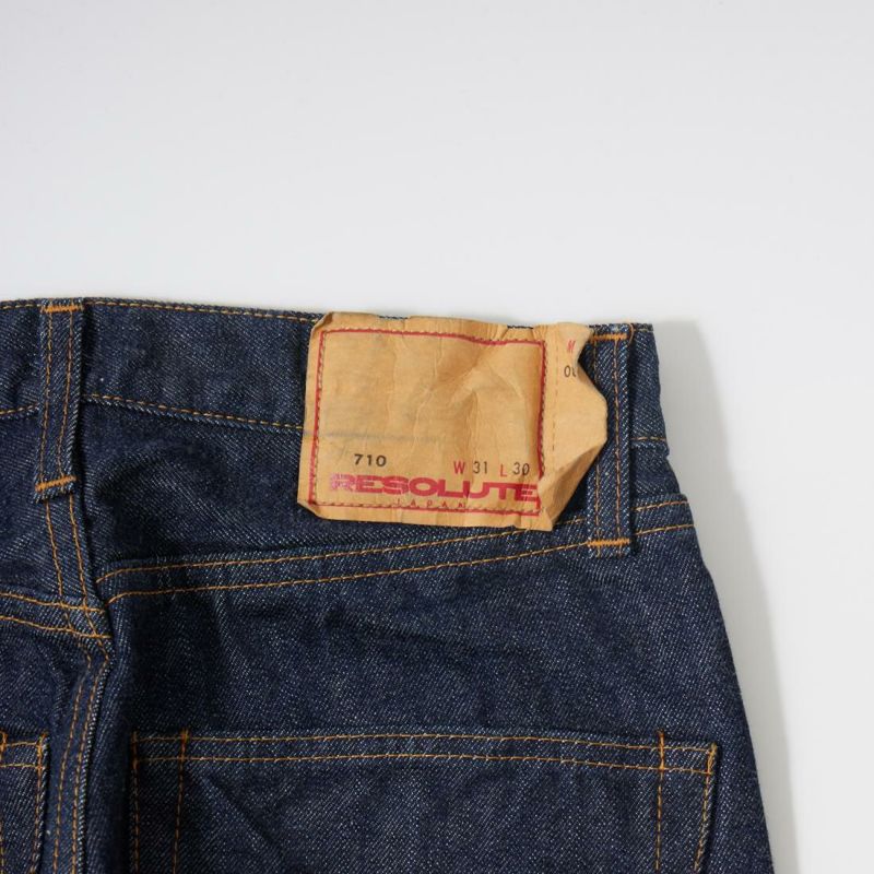 「RESOLUTE(リゾルト)」の基本となる定番モデル「710」。洗うたびに毛羽立つ1960年代のデニム生地を再現した、細めのストレート。通称「66」と呼ばれているLEVI'S 501のデザインとシルエットを踏襲。フロントはボタンフライで、ウエストのパッチは紙パッチ。裾はチェーンステッチ仕上げ。ボタンはすべてオリジナルのボタンを使用。表には特にアイコンとなるデザインが施されておらず、ウエストの内側に控えめに「R」というロゴが縫い付けられています。備後地方で生産されるオリジナルの生地は、ヴィンテージの様な独特の毛羽立ちとザラつきがあり、穿き込む程に絶妙な色落ちが生まれます。ヴィンテージをベースに少しだけ現代のエッセンスを加えて穿き易く仕上げた、コダワリが詰まったデニムパンツです。