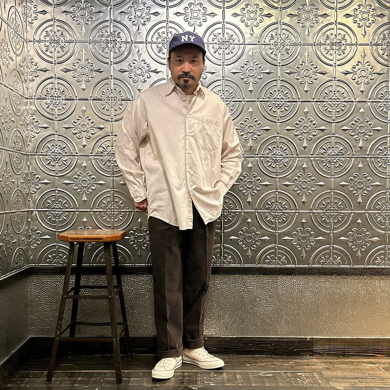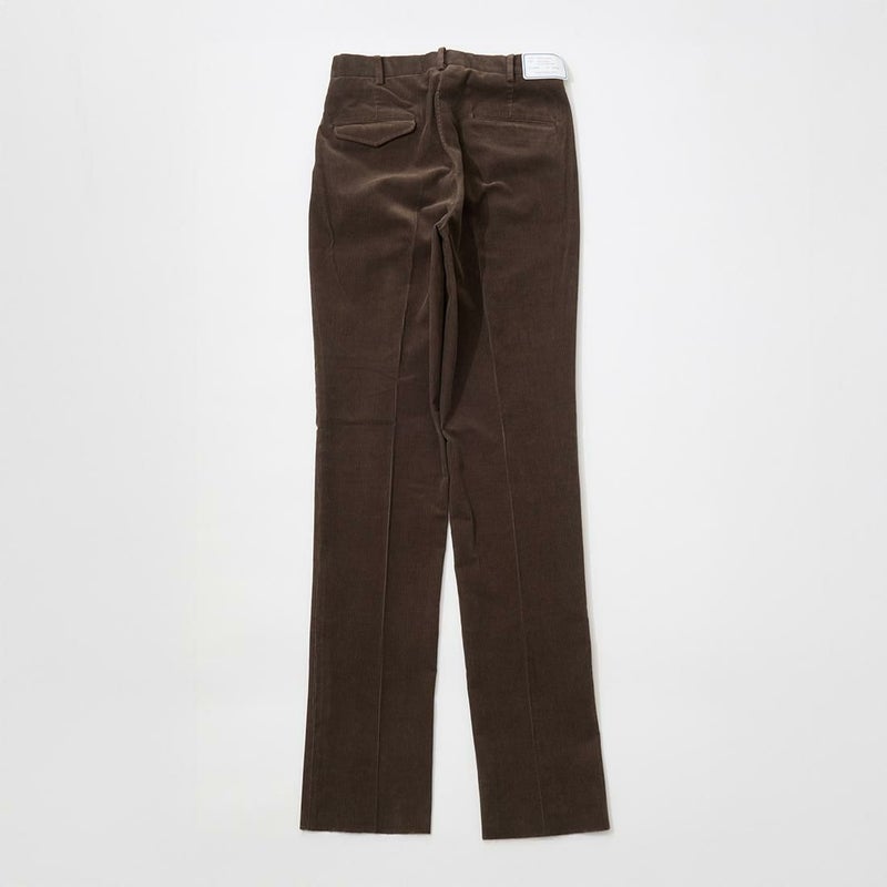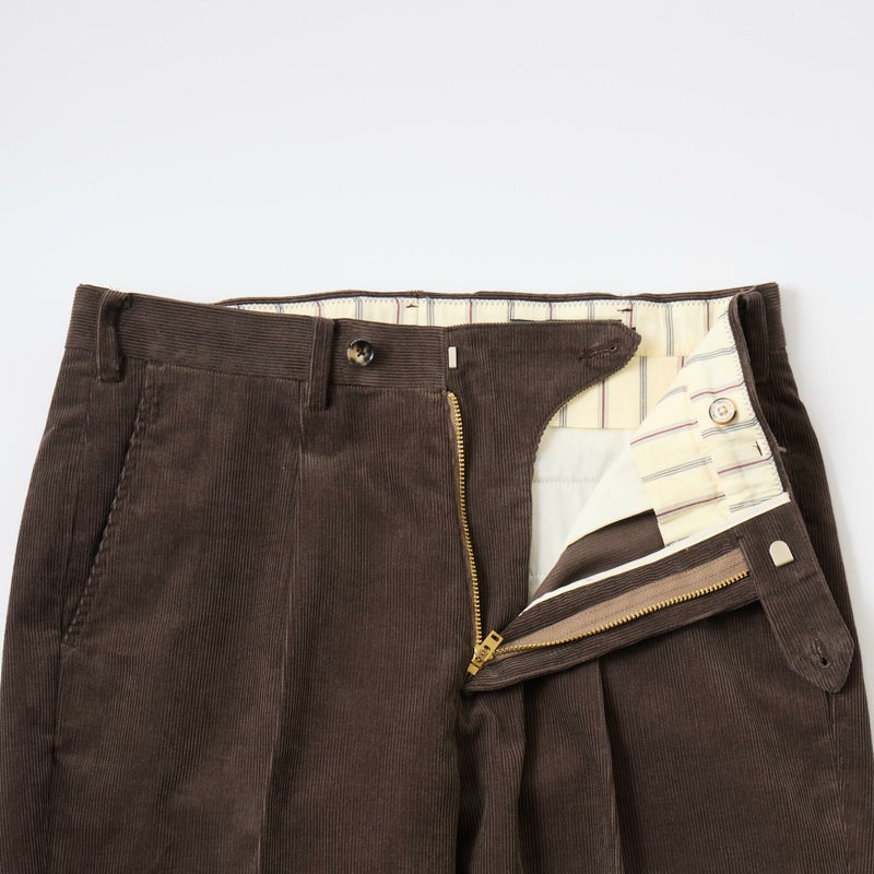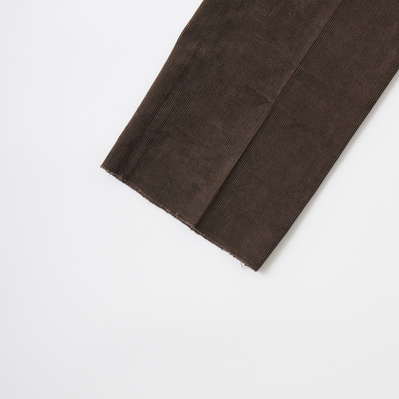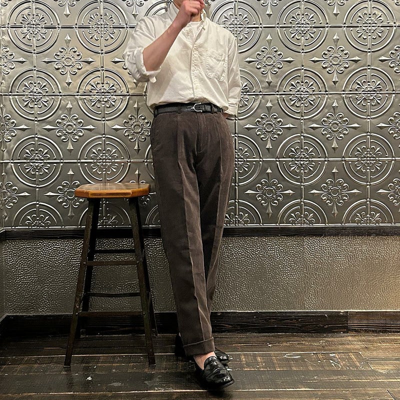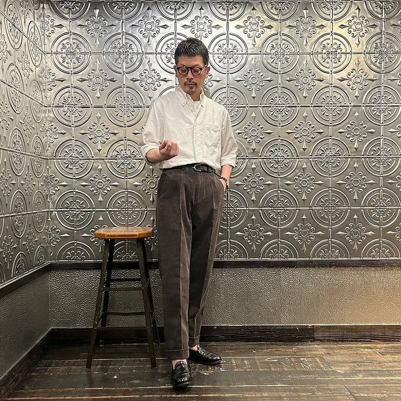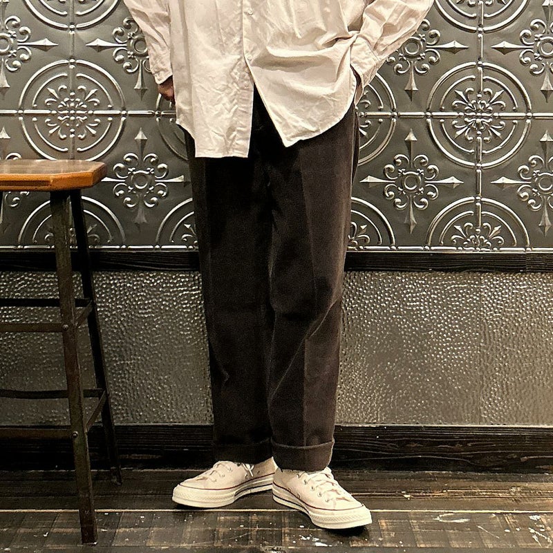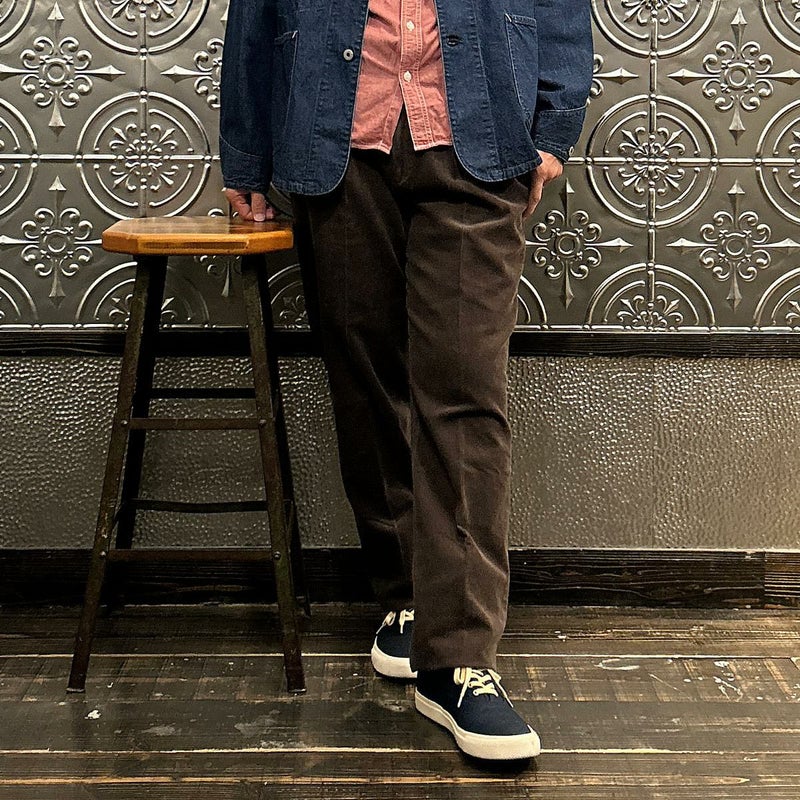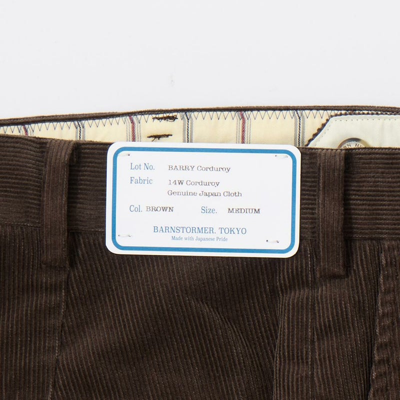 BARNSTORMER(バーンストーマー)の"BARRY" CORDUROY TROUSER。当店がバーンストーマーに完全別注した「BARRY バリー」。某アメリカの有名ブランドのチノをベースにアレンジを加えて型から完全別注。フロントはカジュアルさを演出する為にアウトタック仕様でゆとりのある腰回りに。ボトムに向かって緩やかにテーパード。股上、ワタリ、裾幅まで細かい修正を何度も繰り返した渾身の一本。最初に作ったチノツイルをベースに秋冬向けにコーデュロイで別注。着用するスタイルを選ばない穿き易いシルエット。前立てはジップフロント、バックポケットは向かって左側がフラップ付きポケット。右側はフラップなし。アメリカのスラックス専業ブランドを彷彿とさせる紙のフラッシャーも別注のポイント。素材は細畝のコットンポリエステル混紡のコーデュロイ。あえてポリ混のコーデュロイを選んだのは長くキレイなシルエットをキープする為。裾は裾上げされていない未処理(フラシ)状態。着用時には裾上げが必要になります。
