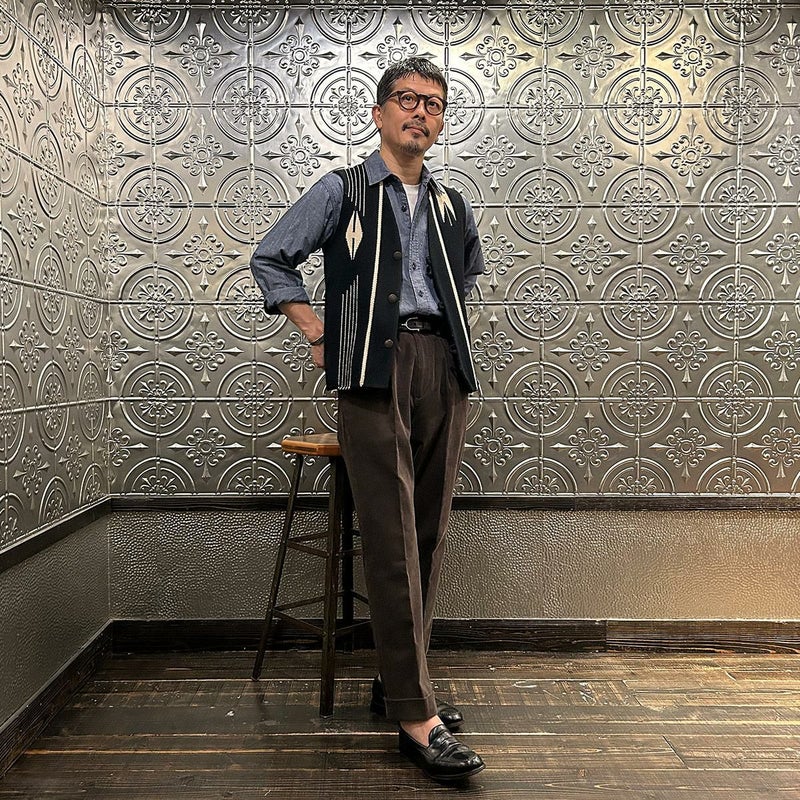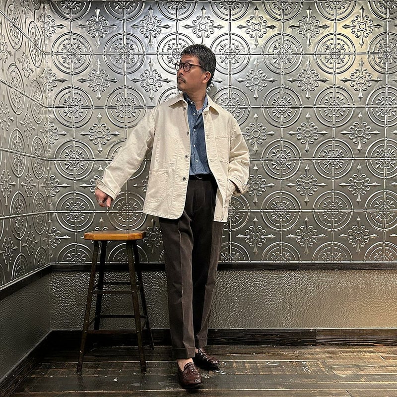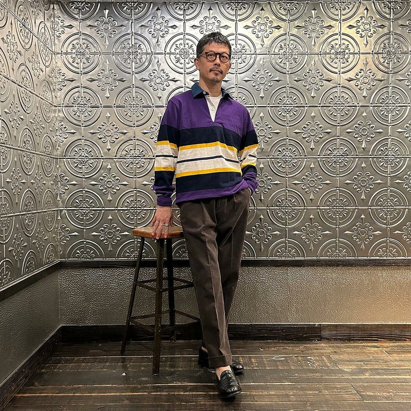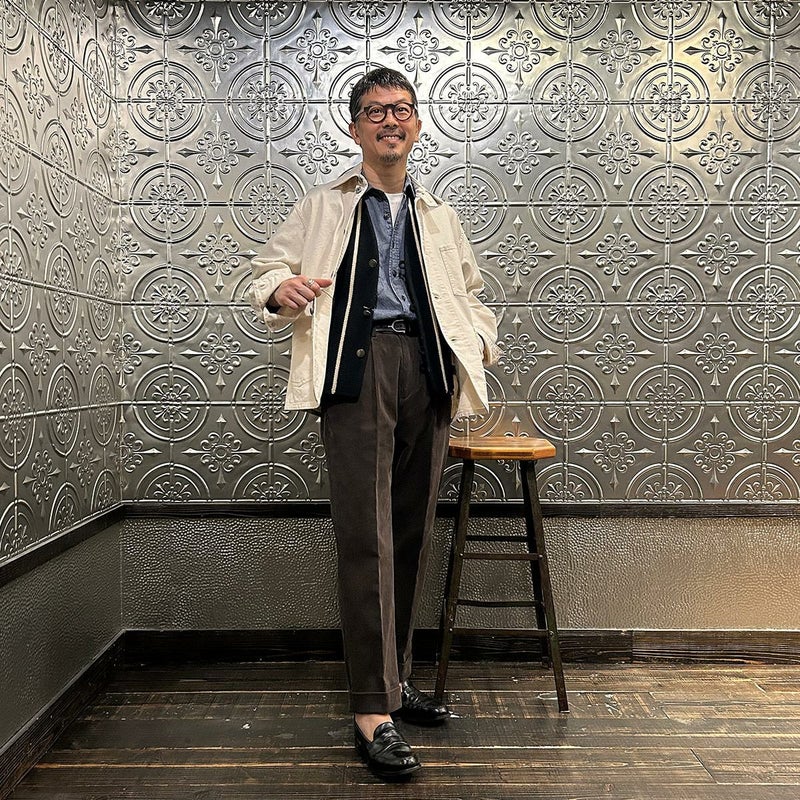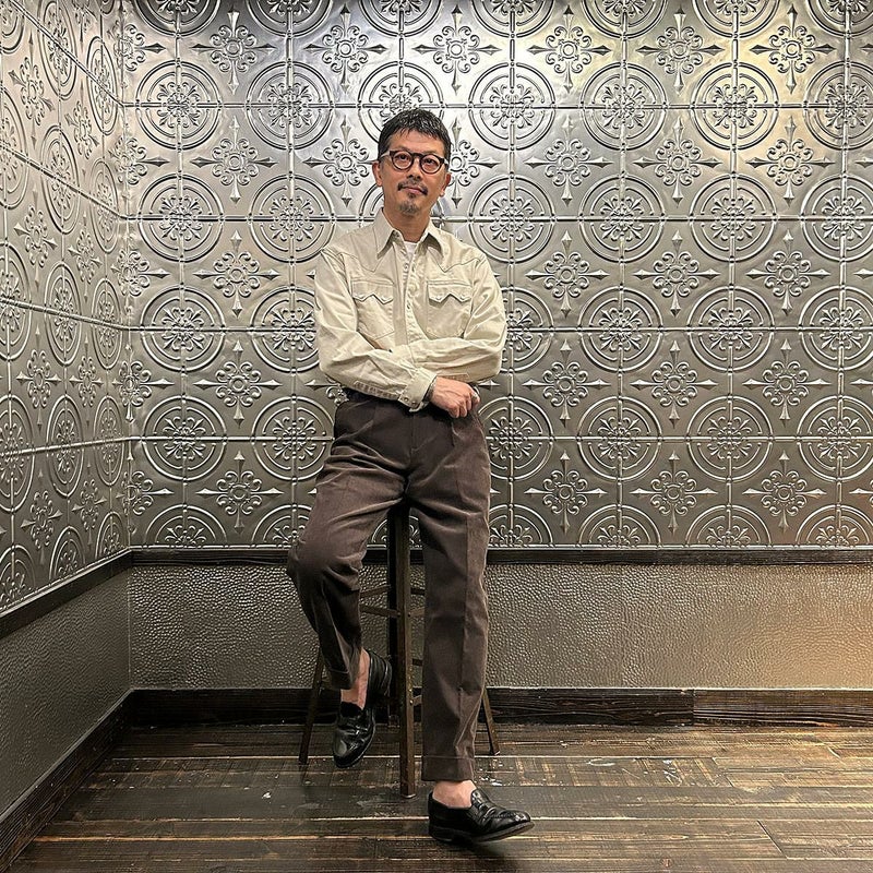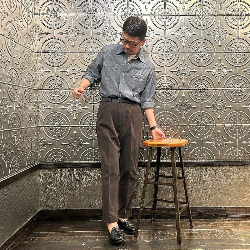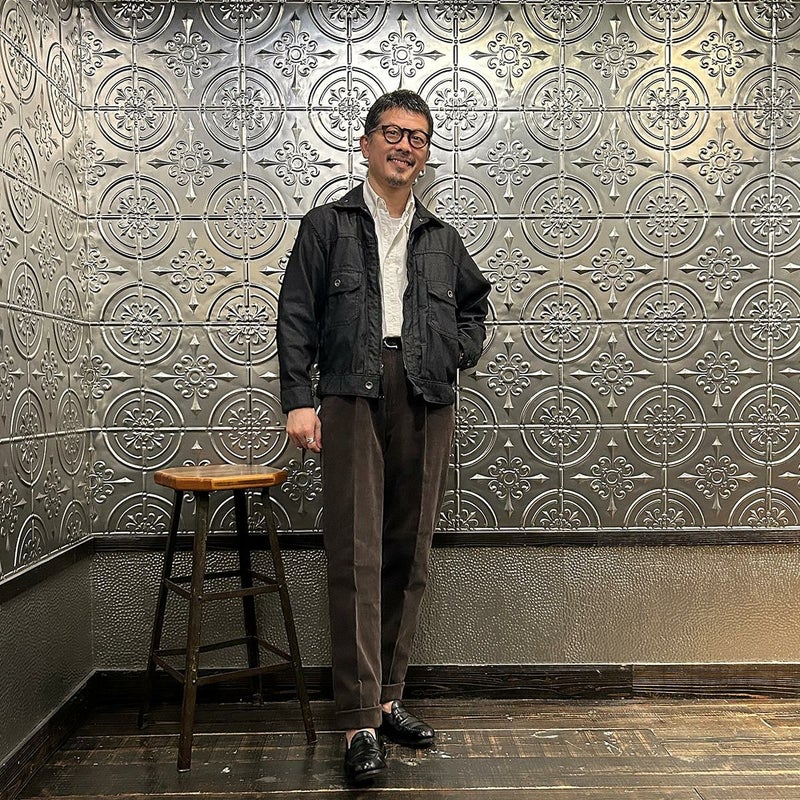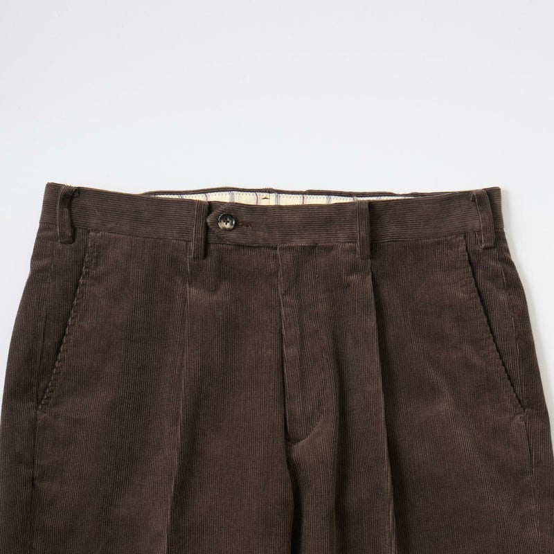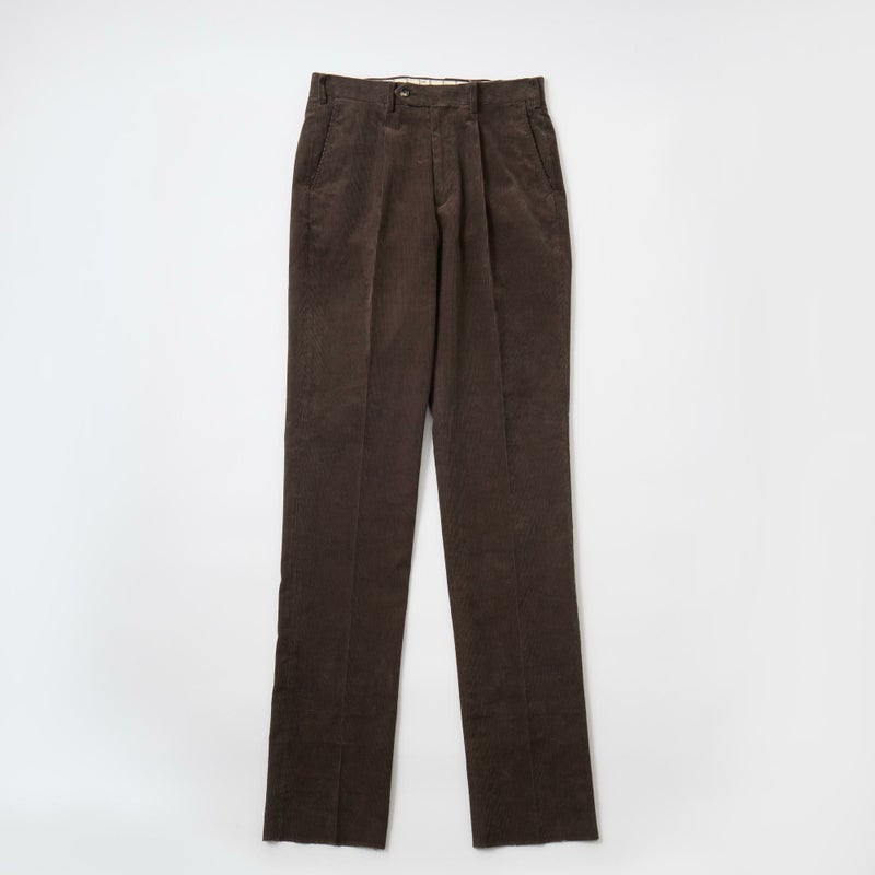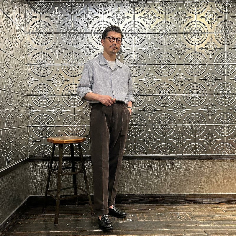 BARNSTORMER(バーンストーマー)の"BARRY" CORDUROY TROUSER。当店がバーンストーマーに完全別注した「BARRY バリー」。某アメリカの有名ブランドのチノをベースにアレンジを加えて型から完全別注。フロントはカジュアルさを演出する為にアウトタック仕様でゆとりのある腰回りに。ボトムに向かって緩やかにテーパード。股上、ワタリ、裾幅まで細かい修正を何度も繰り返した渾身の一本。最初に作ったチノツイルをベースに秋冬向けにコーデュロイで別注。着用するスタイルを選ばない穿き易いシルエット。前立てはジップフロント、バックポケットは向かって左側がフラップ付きポケット。右側はフラップなし。アメリカのスラックス専業ブランドを彷彿とさせる紙のフラッシャーも別注のポイント。素材は細畝のコットンポリエステル混紡のコーデュロイ。あえてポリ混のコーデュロイを選んだのは長くキレイなシルエットをキープする為。裾は裾上げされていない未処理(フラシ)状態。着用時には裾上げが必要になります。