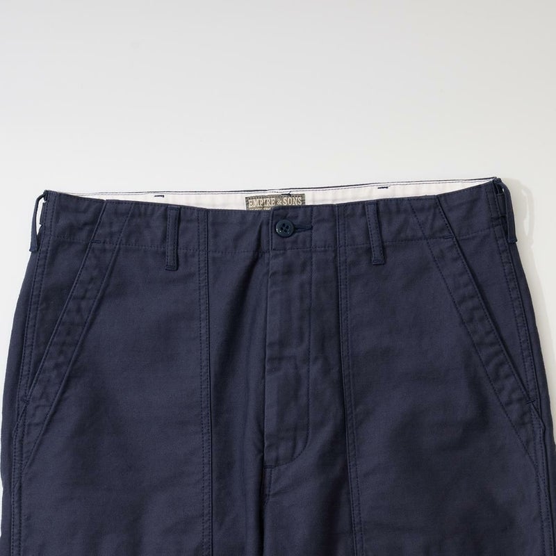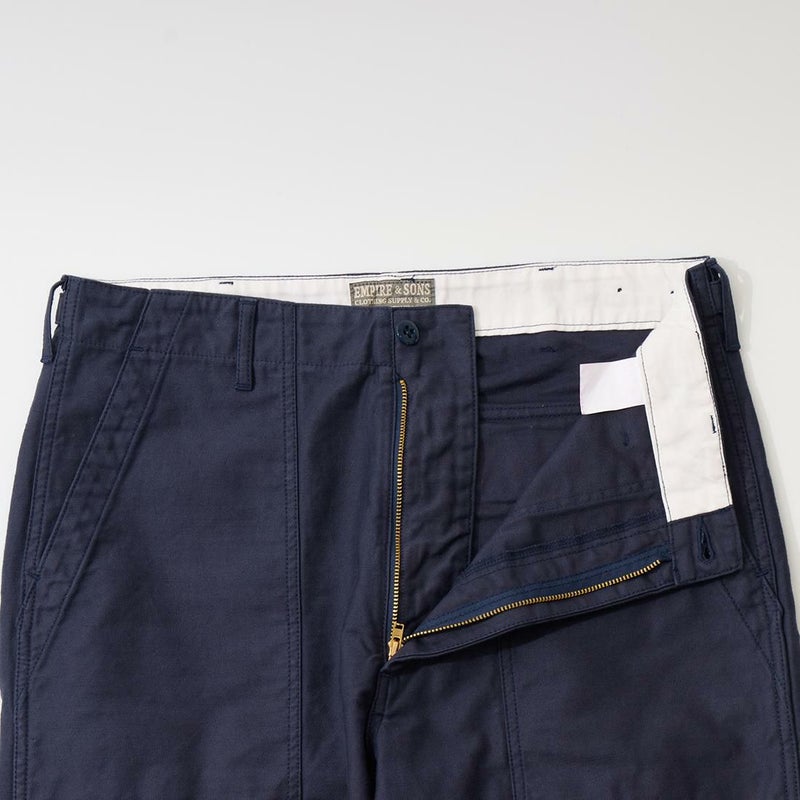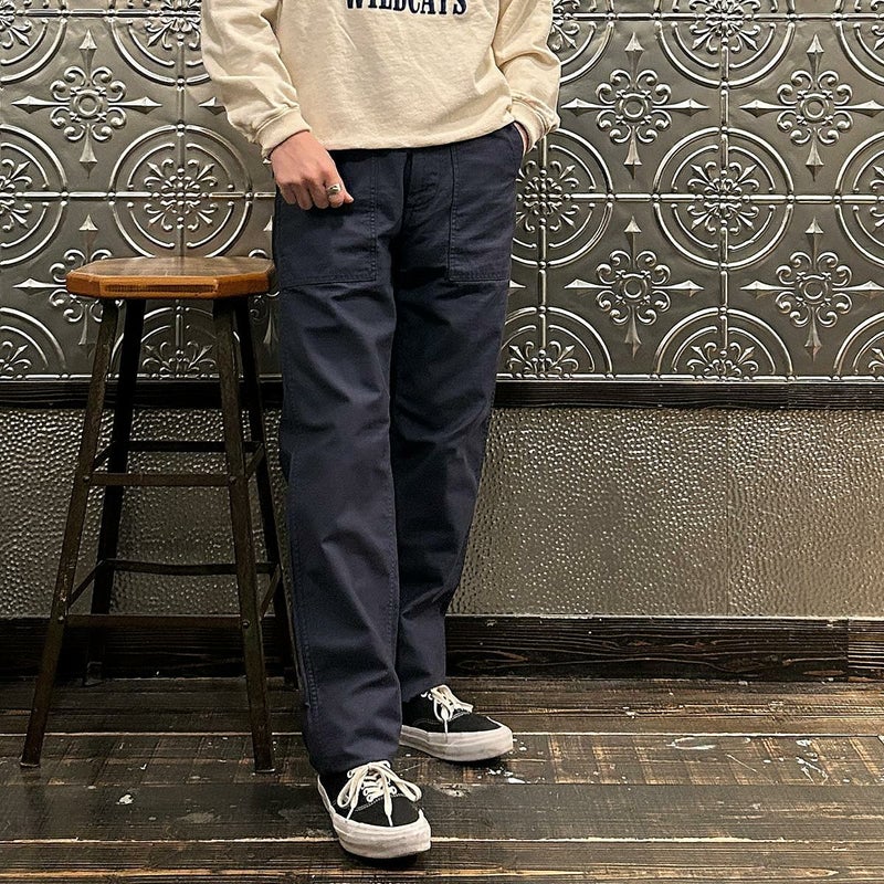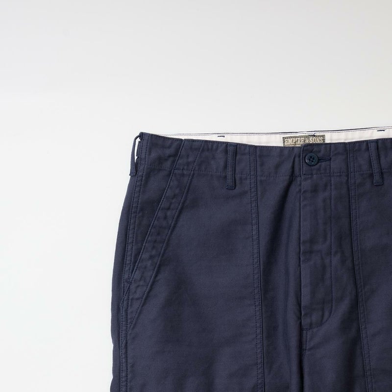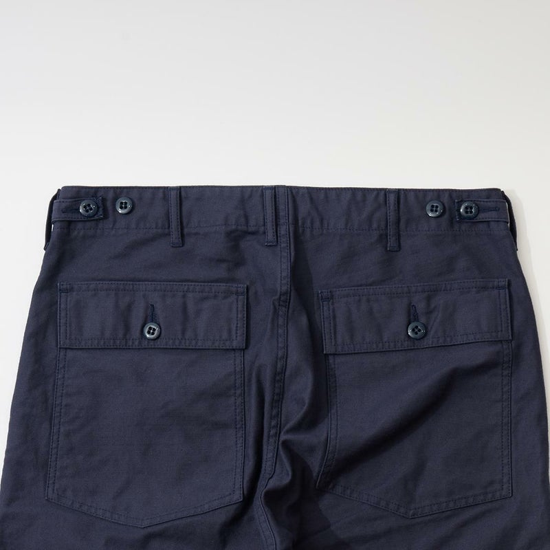 EMPIRE&SONS(エンパイアアンドサンズ)のFATIGUE PANT MILITARY SLUB BACK SATEEN。バックサテン生地をを使用したファティーグパンツ。ジップフロント仕様。フロントの大きなパッチポケットが特徴的なディテール。バックも大きめフラップポケットを装備。腰回りはややゆったり目、裾に向かって緩やかにテーパードされた綺麗なシルエット。1950-70年代、アメリカ軍のファティーグパンツに採用されえていた生地をイメージして作られたバックサテン生地。スラブ感の強い生地でエイジングも楽しみな1本。