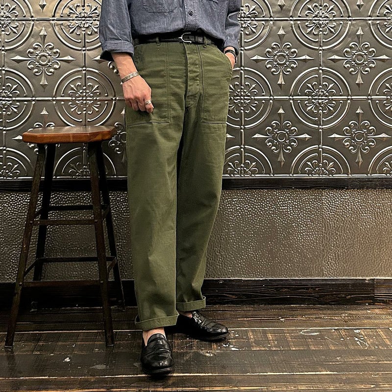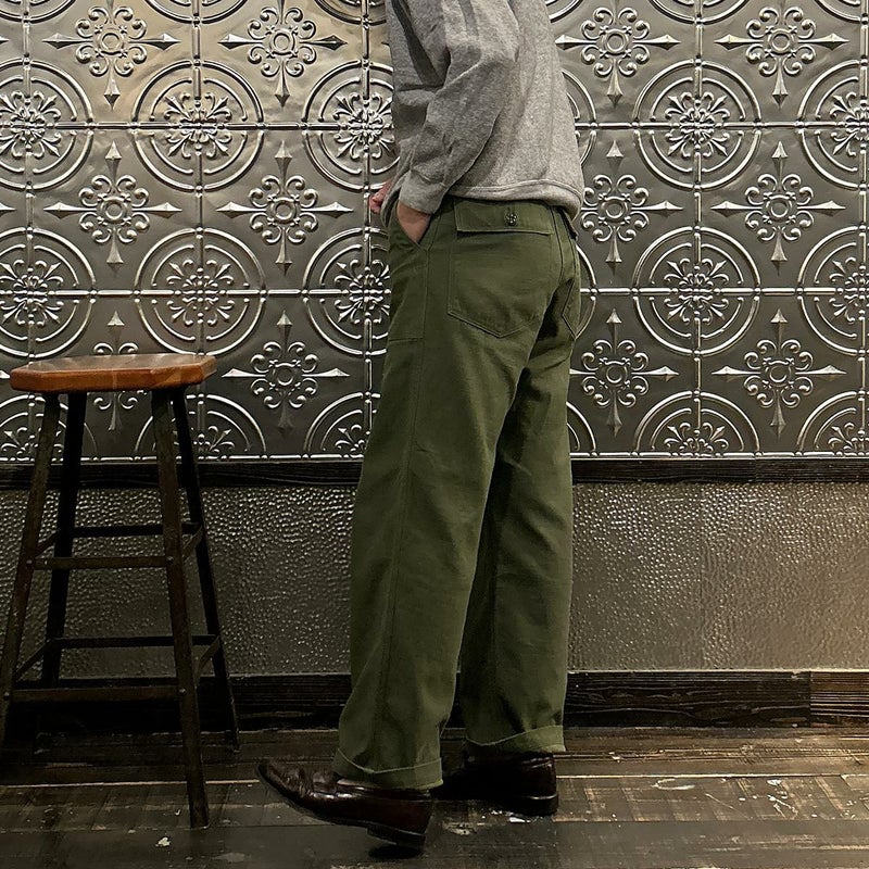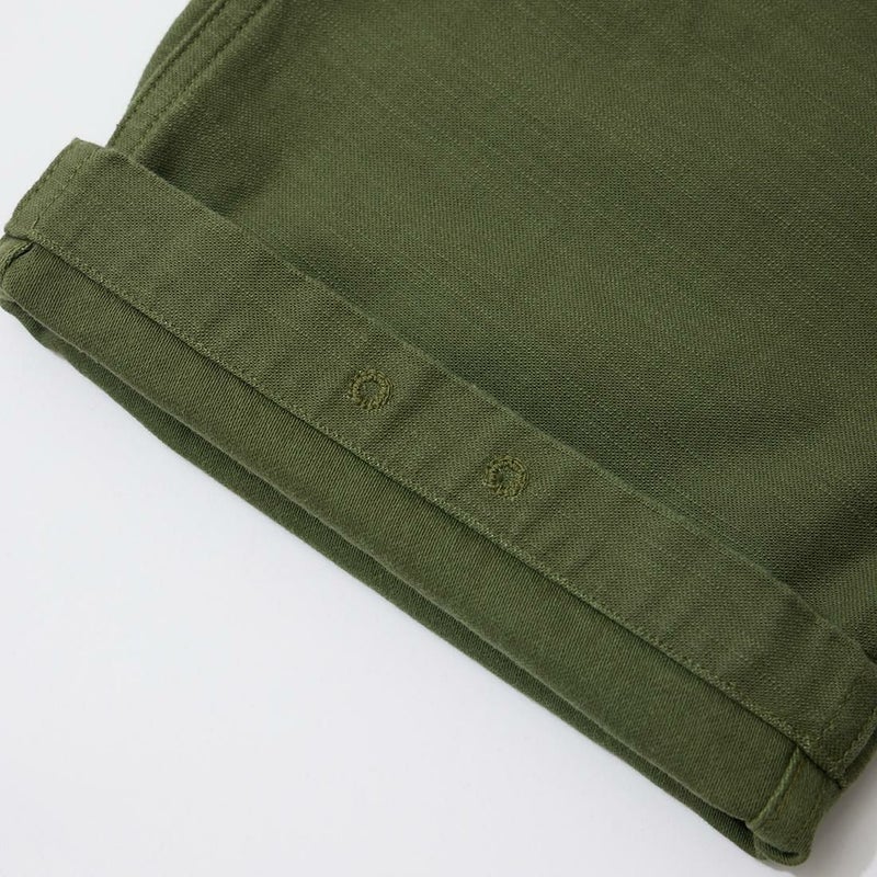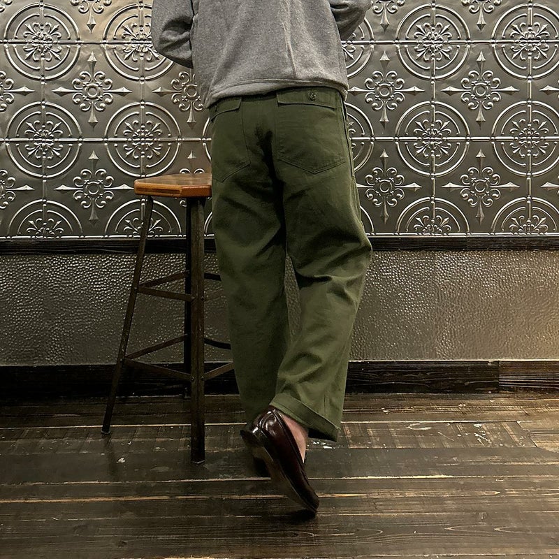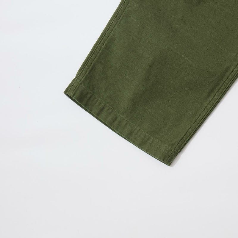 RESOLUTE(リゾルト)のデザイナー林 芳亨氏が監修したFAR EAST MANUFACTURING(ファーイーストマニュファクチャリング)のUTILITY PANT。バックサテンを使用したユーティリティーパンツ。アメリカ軍の60年代半ばのユーティリティパンツ(ベイカーパンツ)がデザインソース。フロントの大きめのパッチポケットが特徴の股上深めのストレートシルエット。オリジナルで開発したバックサテンはスレン染めで洗濯や日光への堅牢度が強く、オリーブカラーを残しながら褪色。着るほどに体に馴染み、着用を重ねるごとに味わいが深くなる1本。