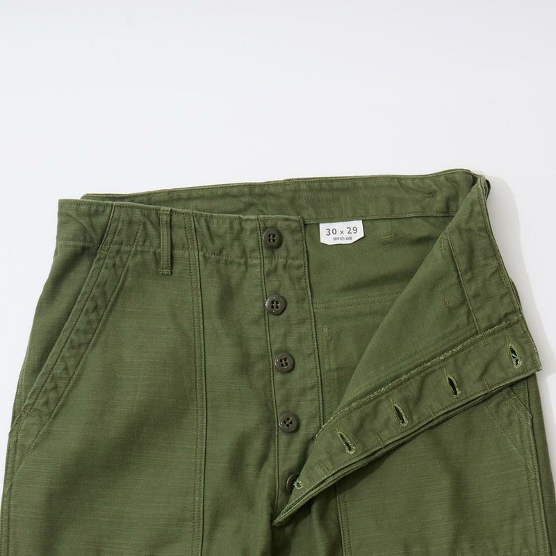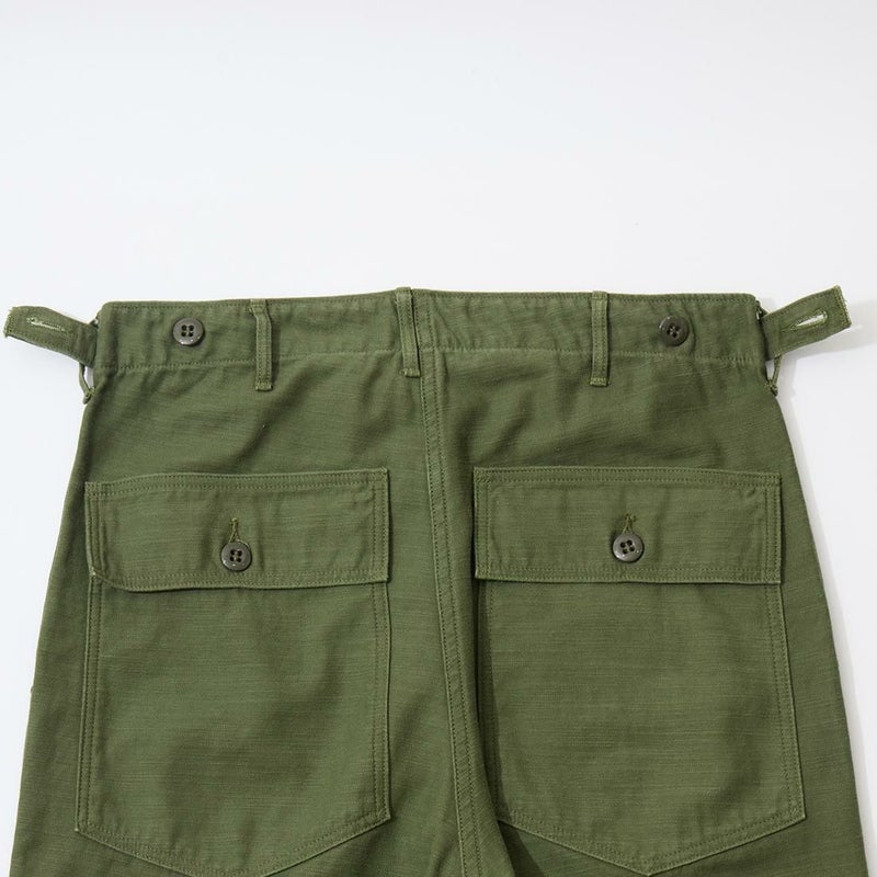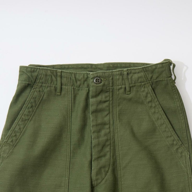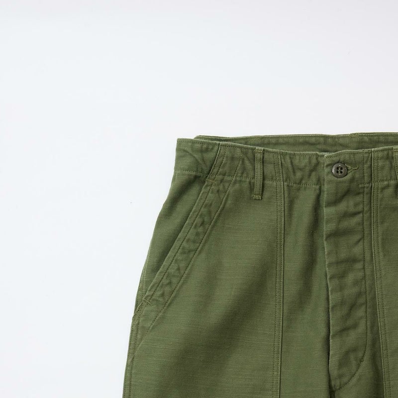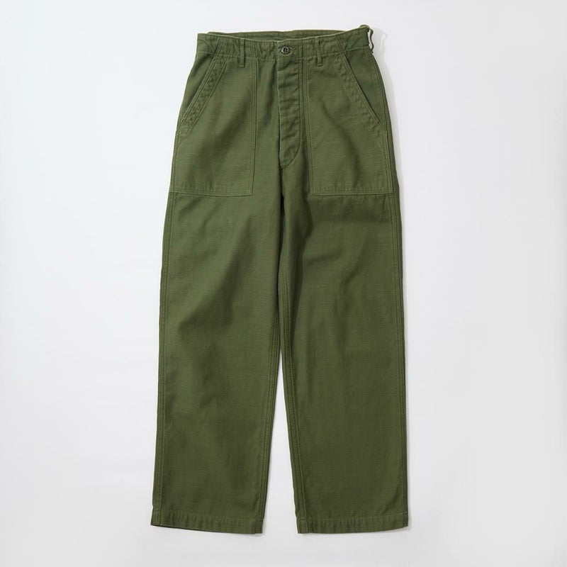 RESOLUTE(リゾルト)のデザイナー林 芳亨氏が監修したFAR EAST MANUFACTURING(ファーイーストマニュファクチャリング)のUTILITY PANT。バックサテンを使用したユーティリティーパンツ。アメリカ軍の60年代半ばのユーティリティパンツ(ベイカーパンツ)がデザインソース。フロントの大きめのパッチポケットが特徴の股上深めのストレートシルエット。オリジナルで開発したバックサテンはスレン染めで洗濯や日光への堅牢度が強く、オリーブカラーを残しながら褪色。着るほどに体に馴染み、着用を重ねるごとに味わいが深くなる1本。