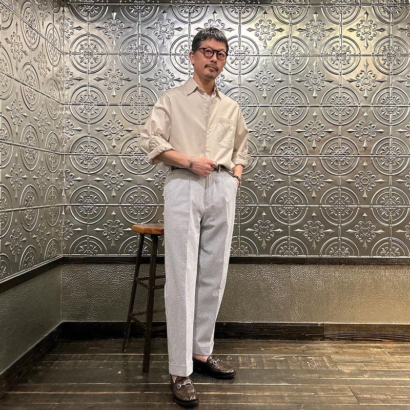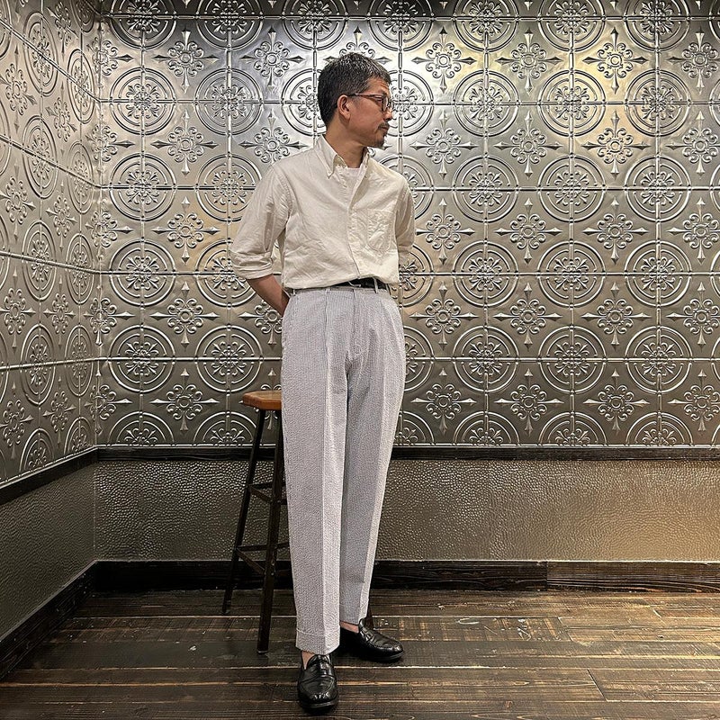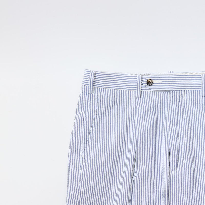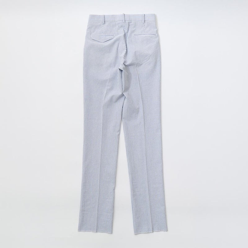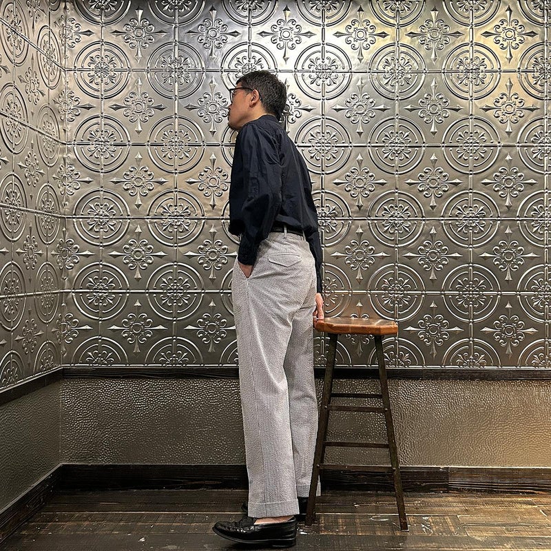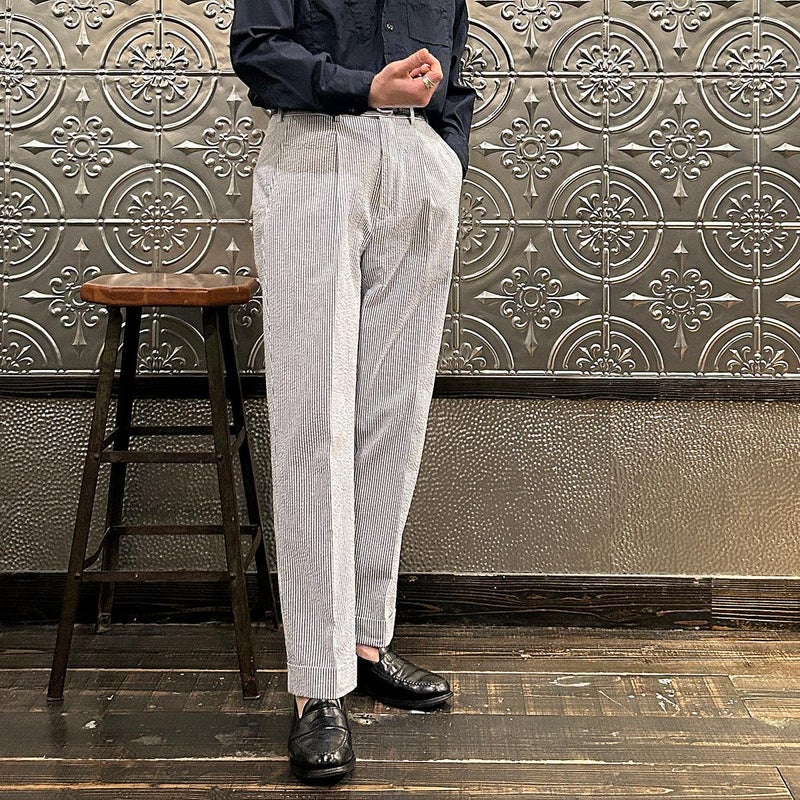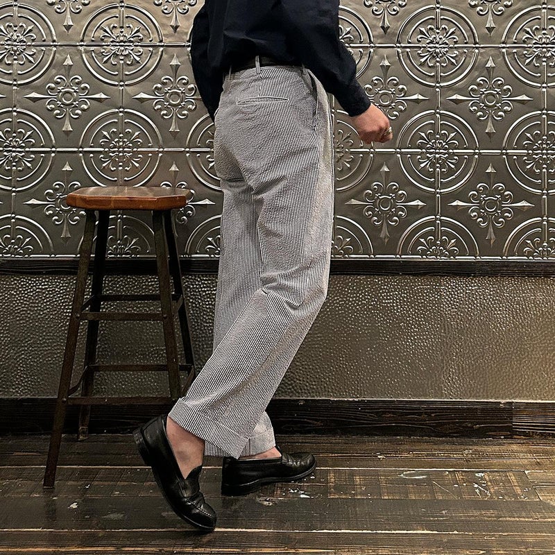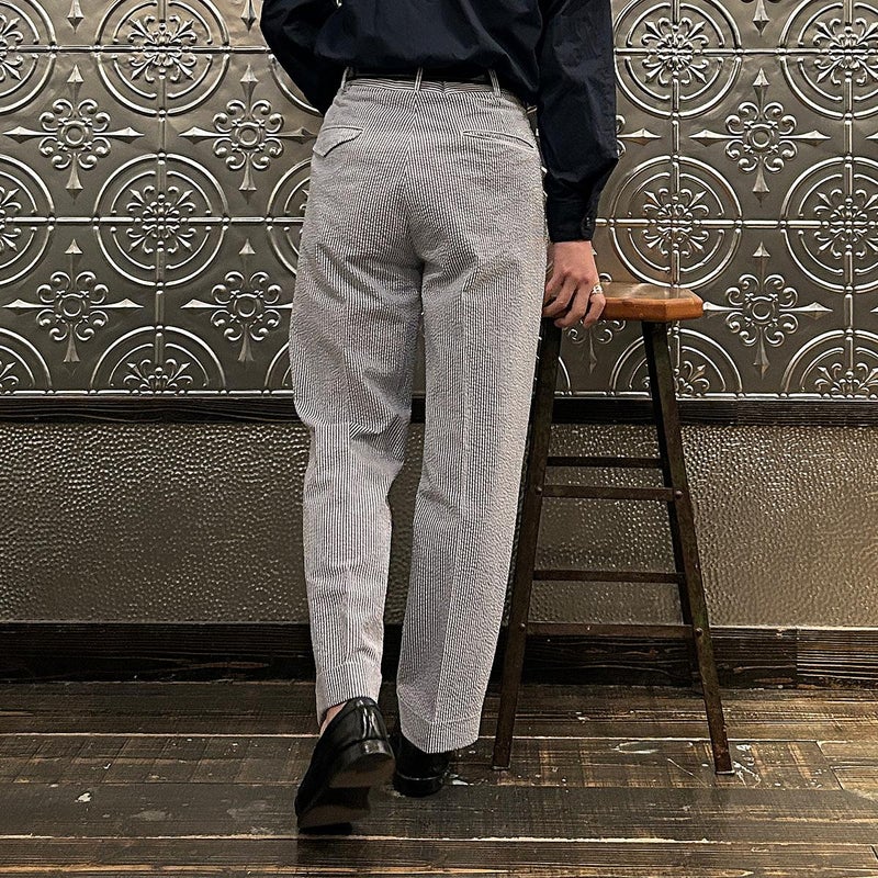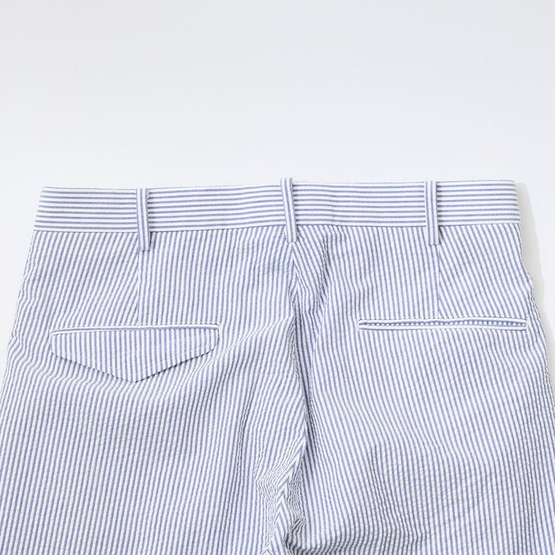 BARNSTORMER(バーンストーマー)の"BARRY" SEERSUCKER。当店がバーンストーマーに型から完全別注した「BARRY バリー」。某アメリカの有名ブランドのチノをベースにアレンジを加えて型から完全別注。フロントはカジュアルさを演出する為にアウトタック仕様でゆとりのある腰回りに。ボトムに向かって緩やかにテーパード。股上、ワタリ、裾幅まで細かい修正を何度も繰り返した渾身の一本。着用するスタイルを選ばない穿き易いシルエット。前立てはジップフロント、バックポケットは向かって左側がフラップ付きポケット。右側はフラップなし。アメリカのスラックス専業ブランドを彷彿とさせる紙のフラッシャーも別注のポイント。素材はメンズトラッドの春夏の装いには欠かせないコットンのシアサッカー素材。ドライタッチで生地の凹凸が肌への接地面を少なくする事から天然の機能素材として重宝される生地。夏でもショーツを穿かない方、汗をかいたら気兼ねなく自宅で洗濯したい方には最適な生地。裾は裾上げされていない未処理(フラシ)状態。着用時には裾上げが必要になります。 納品時にワンウォッシュしてあるので洗濯による大幅な縮みの心配はございません
