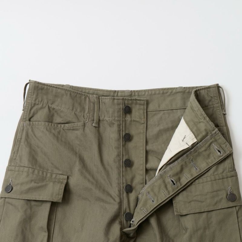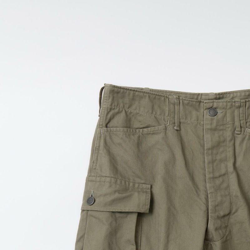 WORKERS(ワーカーズ)のM43 TROUSERS MOD。コットンヘリンボーン素材を使用したミリタリーパンツ。アメリカ陸軍に採用されていた、通称M-43タイプのトラウザースがデザインソース。大きめのサイドポケットが特徴的。本来は存在しない利便性の高いL字型のポケット。前立てはボタンフライフロント。黒塗りの13STARボタン。深めの股上。ゆったりとしたワタリ幅で裾幅も広い無骨なシルエット。経年変化も楽しみな1本。