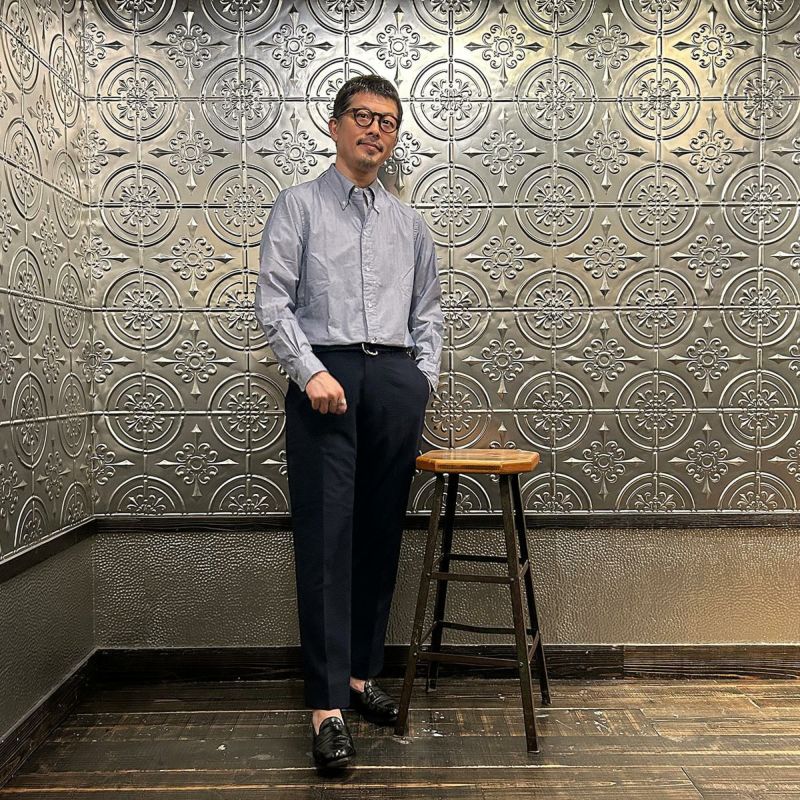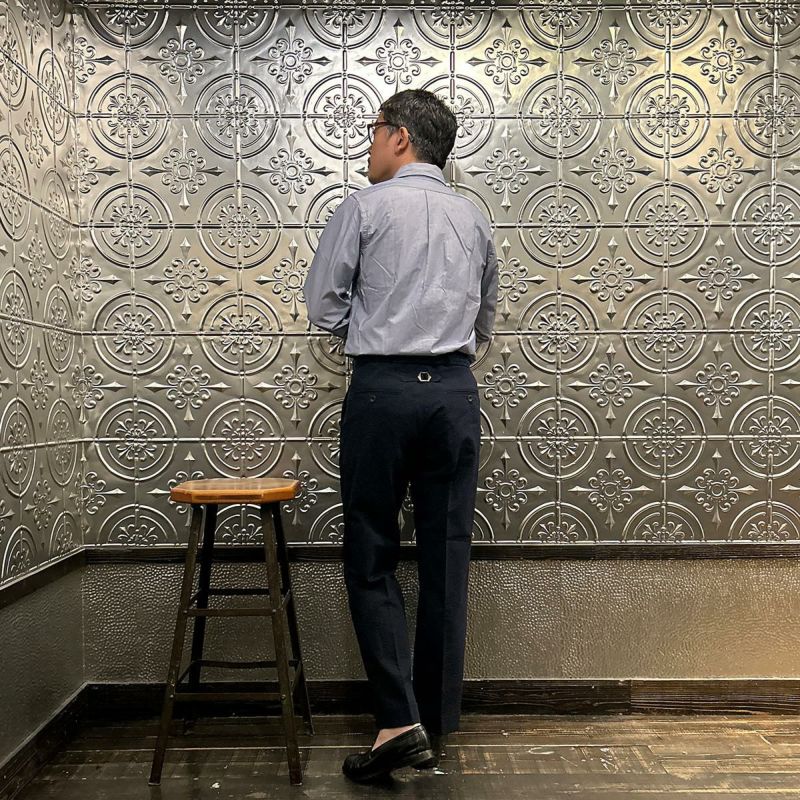 172センチ60キロで「46」でウェストに少しゆとりのあるサイズ感です。普段は30インチを基準にパンツを穿いています。「44」でも穿けるのですがシルエット的に「46」ぐらいの方が好みだったので自分が穿くのであれば「46」を選びます。背面の尾錠を締めればウェストが少し緩くてもお尻の上部分で引っかかる感覚で特に問題はありません。同ブランドの定番のアメリカントラウザーは直線と曲線のバランスが非常に良いパンツ。いい意味での大量生産時代のアメリカのトラウザーズのイメージでしょうか。夏にも快適に穿ける天然の機能素材「シアサッカー」をお楽しみください