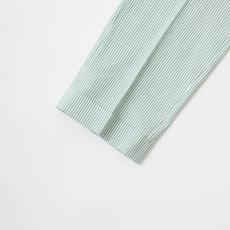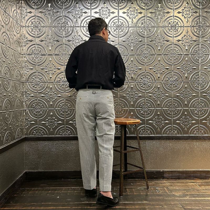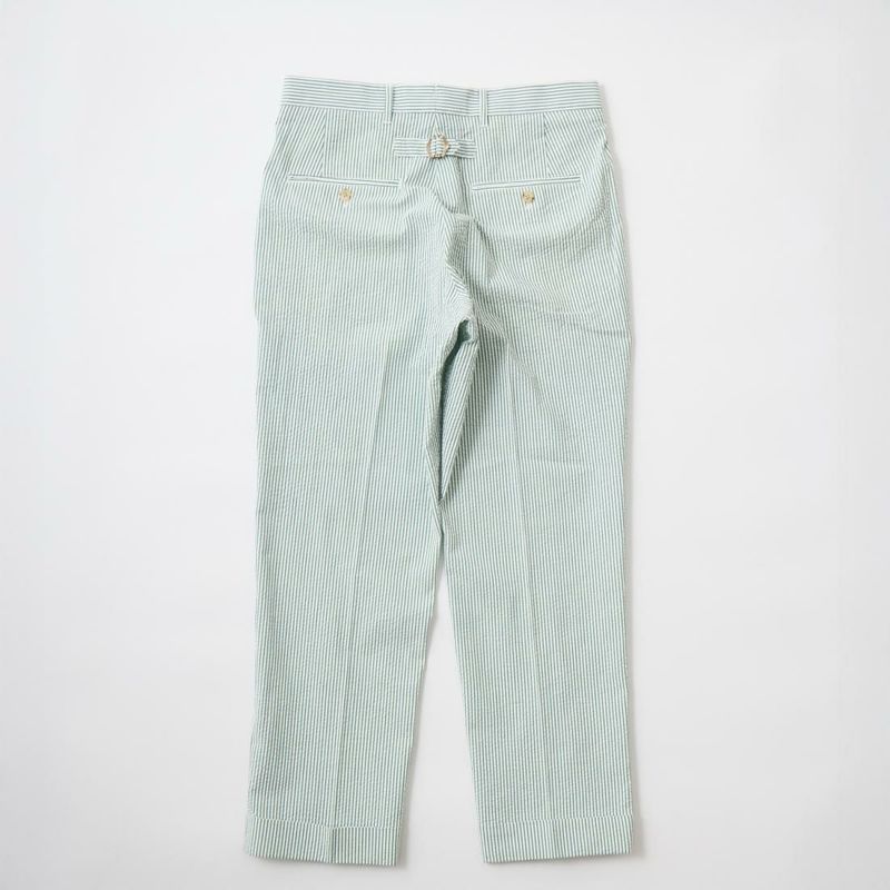 国内ブランドD.C. WHITE(ディーシーホワイト)のSEERSUCKER AMERICAN TROUSER。古き良きアメリカのチノトラウザーがデザインソース。凝った前立てや両玉縁のヒップポケット、タコ足つけのベルトループ、バックシンチなどの拘りのディテール。内股、外、ヒップなどを割縫いにすることにより、フラットなドレスパンツをイメージ。コットン100%のシアサッカー素材を採用。織りによって生まれる独特の凹凸が肌との接地面を減らし、通気性と速乾性を高めることで、盛夏でも快適に着用可能。天然素材ならではの風合いがカジュアルな素材でありながら上品な雰囲気。