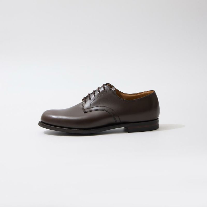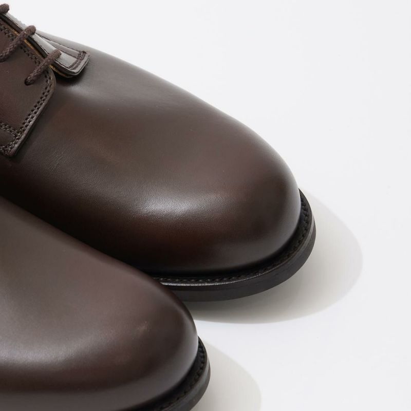 イギリス発「CROCKET&JONES(クロケットアンドジョーンズ)」のMIDHURST 4 Single Dainite Sole。ぽってりとした膨らみを持たせたラウンドトゥや懐古的なフォルムが特徴的なデザインのプレーントゥシューズ。ラストはつま先周辺を含む前方のフォルムはミリタリーラスト210をそのまま踏襲し、ヒールカップ(踵部)をややタイトに絞って踵のフィットを向上させた2024年リリースの【ラスト394】を採用。長時間履いても疲れにくい履き易さです。ソールは英国 Harboro Rubber Company のダイナイトスタッズソール。歩き易く、耐久性にも優れた仕様。素材はオイルを含ませることでしなやかさと耐水性を持たせたワックスカーフを使用。汚れや小雨程度の天候にも気にせず履ける点も魅力的です。様々なシーンやスタイルにも合わせられる汎用性に優れた1足。