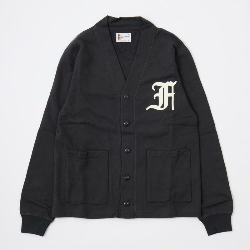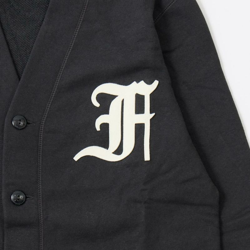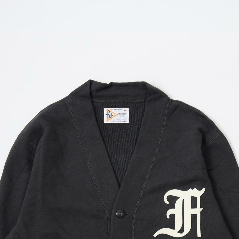 FELCO (フェルコ) 12oz TERRY V NECK BUTTON LETTERED CARDIGAN W/OLD FONT F FELT - BLACK