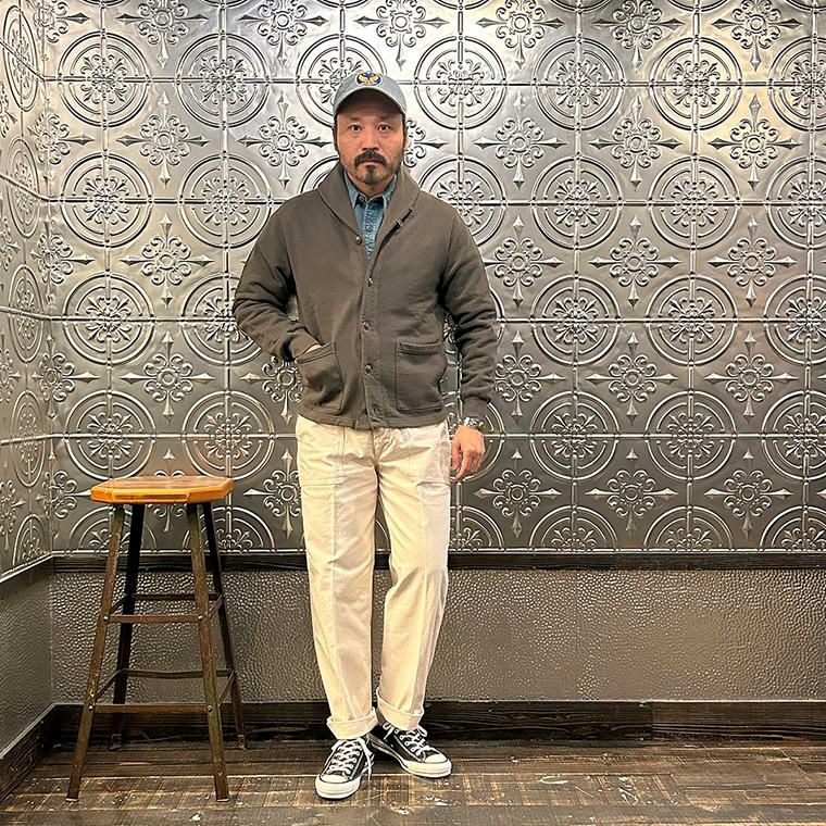 FELCO(フェルコ)の16oz TERRY SHAWL COLLAR CARDIGAN。程よい厚みとコシのある16オンスのヘビーウェイトのフレンチテリー(裏起毛していないスウェット生地)素材を使用したボタンフロントのショールカラーカーディガン。ショールカラーの雰囲気のある襟元や腰部分の左右のパッチポケットが特徴的なディテールのアイテム。アウターとしての使用は勿論ですが、ダウンベストなどのインナーアイテムとしても使って頂ける汎用性も高いアイテム。着込み、洗い込む事のより生まれるスウェット素材の経年変化も楽しみな1着です。
