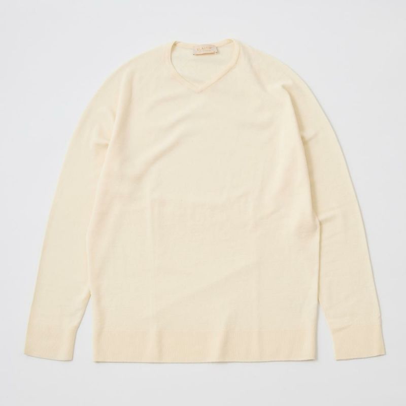 イギリスを拠点にブランドを展開しているブランドSLAITH (スレイス)。生産自体もイギリスで行っています。フィッティングはスッキリとしたスリムフィット。こちらの生地に使用している糸は上質なメリノウール。ラグランスリーブになっている部分の縫い付けは職人によるハンドリンキング。その為、縫い合わせのストレスを回避できる非常に着心地の良い一着となっています。それに加え開きの少ないVネックはドレッシーな場面でも活用して頂けます。