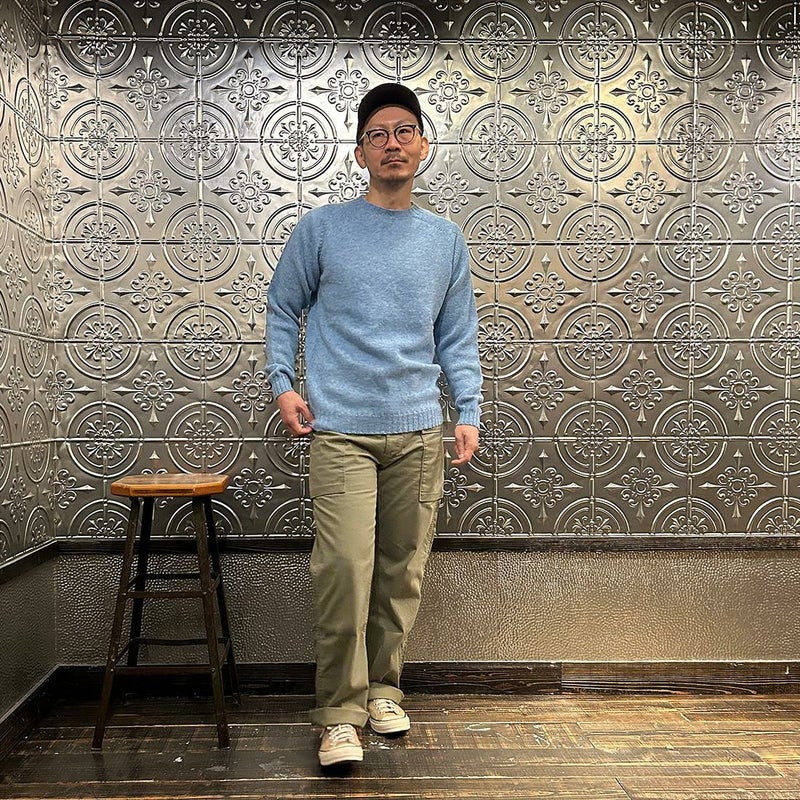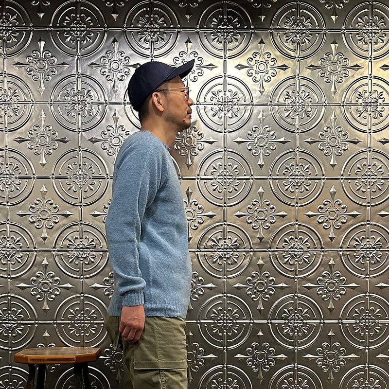 確かなクオリティとインポートブランドながらもコストパフォーマンスに優れたアイテムを数多くリリースするHARLEY OF SCOTLAND(ハーレーオブスコットランド)。縫い目のない一つ凪で作られるシームレス製法が特徴。ウールの温かみが感じられるミドルゲージの編地。こちらは着丈、袖丈を2.5センチ程度長く変更してもらった別注モデルになります。