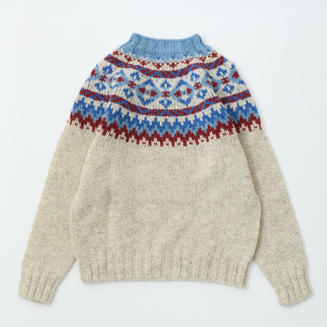 HARLEY OF SCOTLAND(ハーレーオブスコットランド)のFAIRISLE YOKE CREW SWEATER 100%WOOL。肩部分にフェアアイル柄が入ったハイネック(モックネック風)セーター。多色糸で柄を表現。シンプルになりがちな冬のコーディネートのアクセントに最適。縫い目の無い(シームレス)製法で仕上げられているので着心地も抜群。ミドルゲージで保温力と着易さ、着まわしの良さが備わったニット。