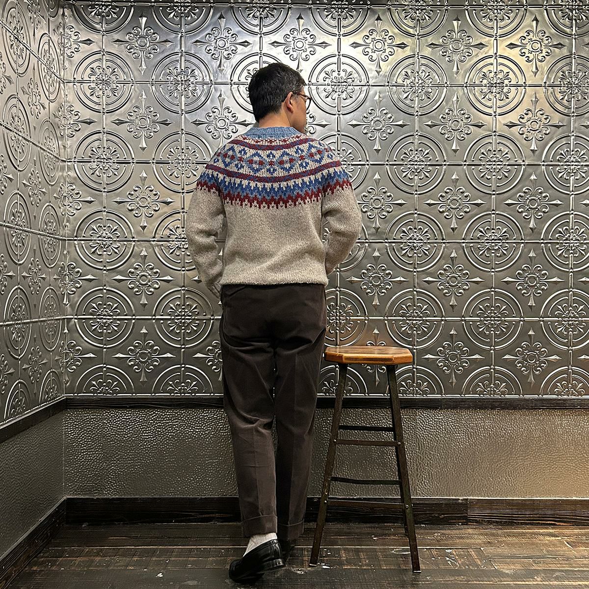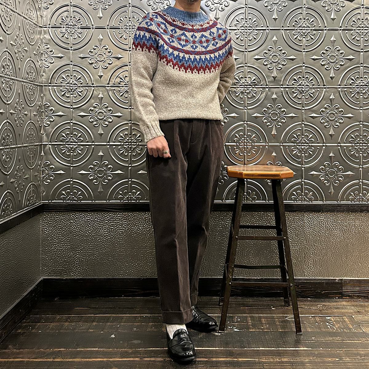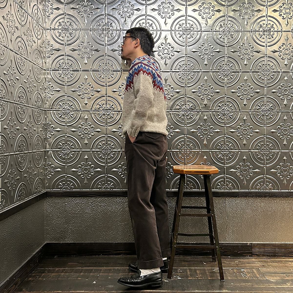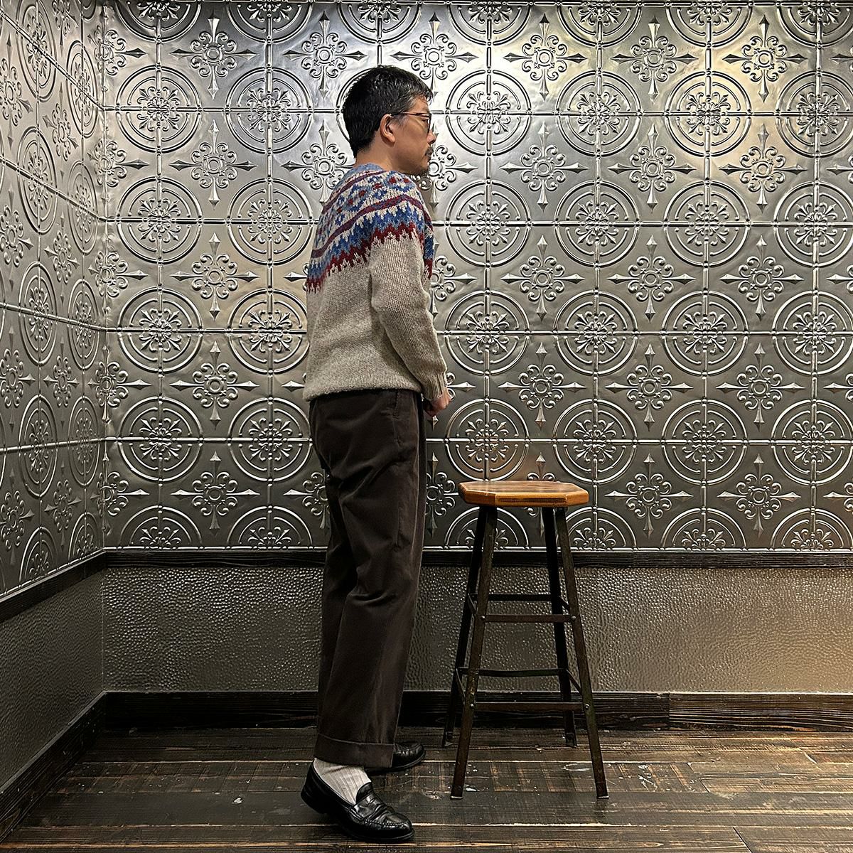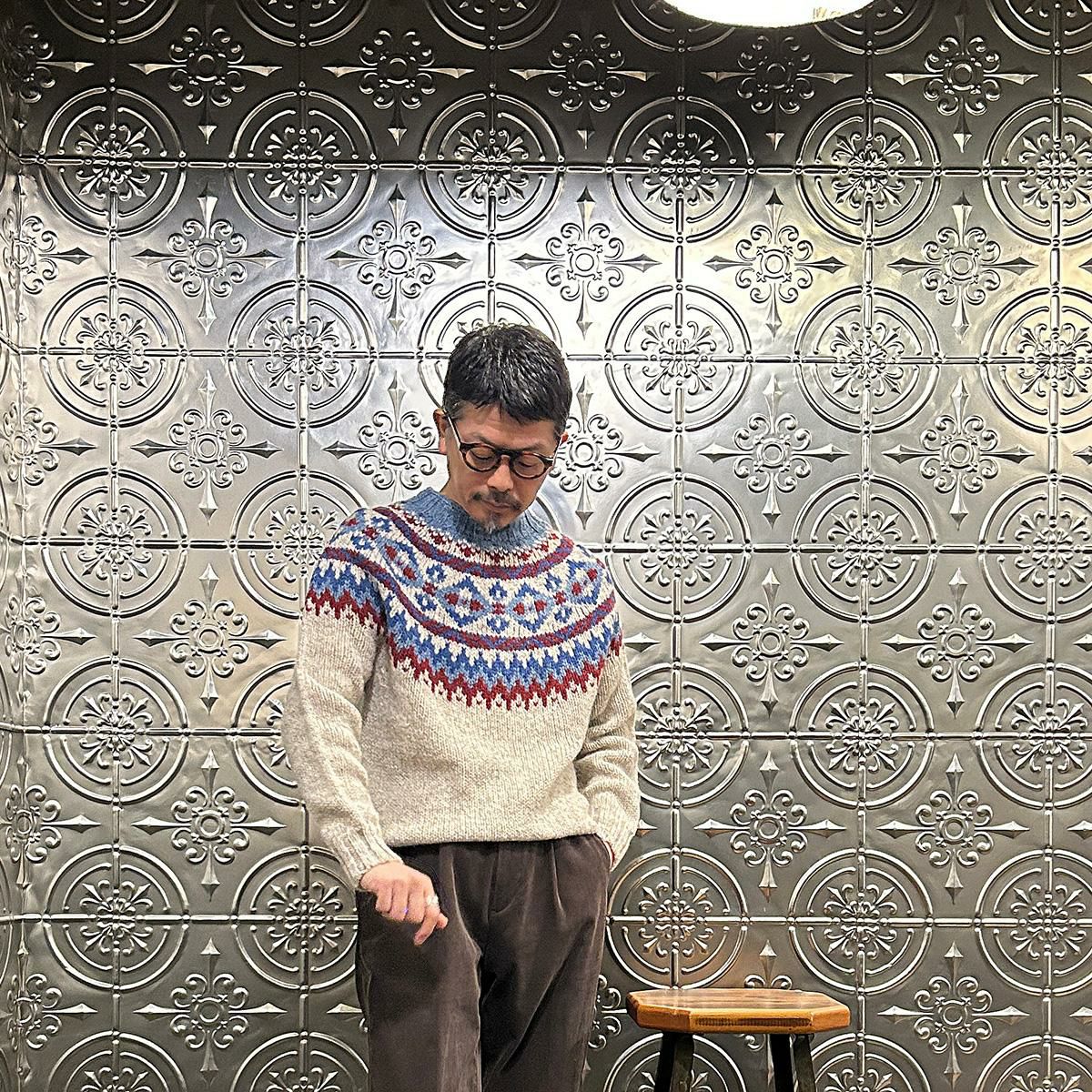 170センチ68キロでサイズは40サイズで丁度良いサイズです。胸元辺りに施されたフェアアイル柄はインナー使いには最適なアイテム。中厚の生地感に暖かみのある雰囲気。軽くて着易いので男女関係なくオススメしたいですね。