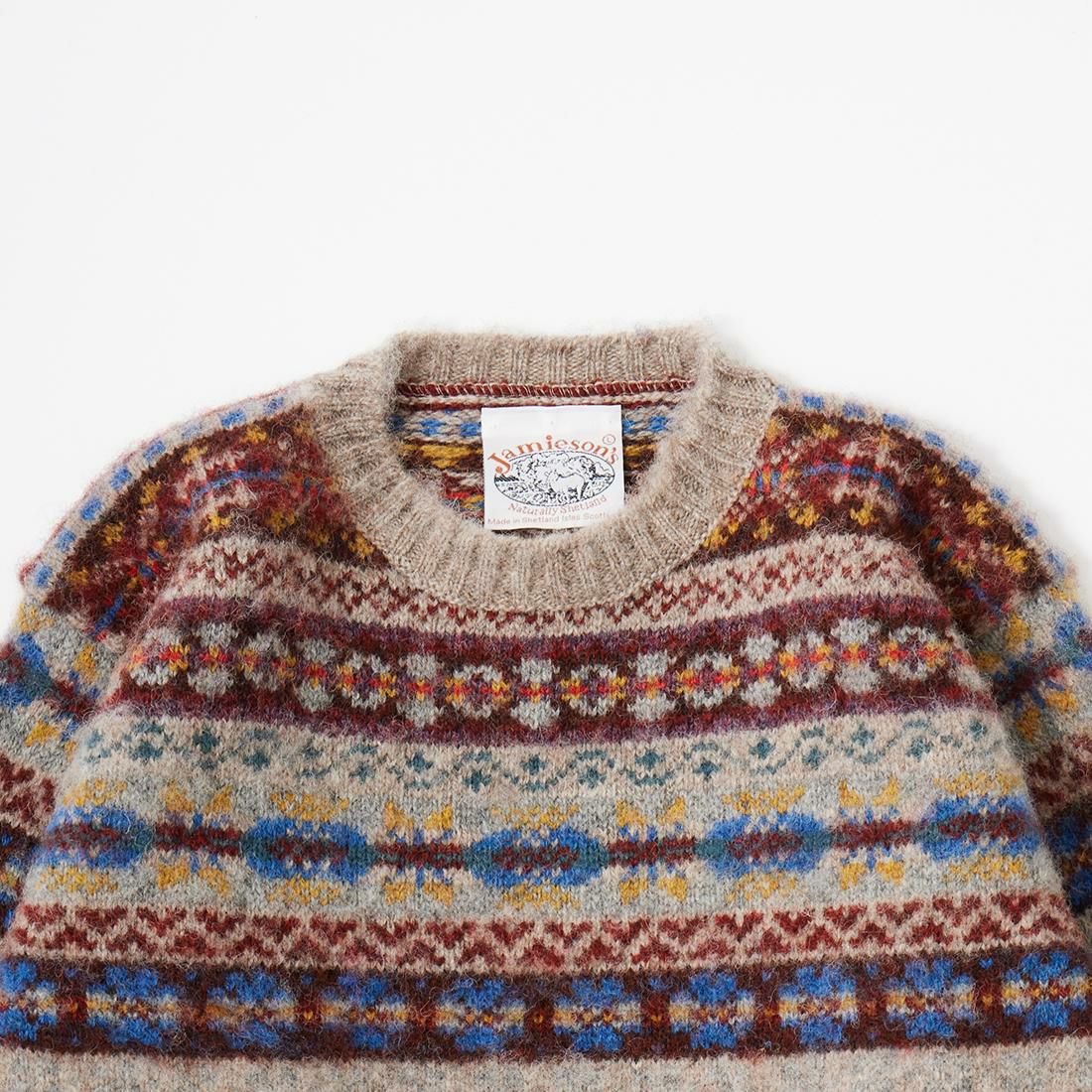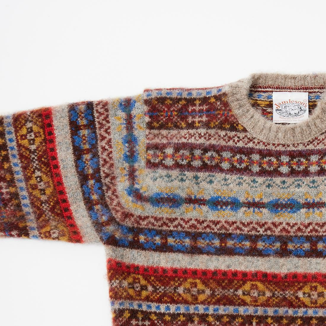JAMIESON'S(ジャミーソンズ)のAOFI CREW NECK PULLOVER BRUSHED。クルーネックのフェアアイル柄のニット。スコットランド・シェットランド諸島産の上質な羊毛を植物染色し、色鮮やかな幾何学模様に編み立てたフェアアイルニット。 美しい発色とナチュラルな柔らかい風合い、軽くて暖かい着心地が特徴的なセーター。未だにアザミの棘で生地の表面を起毛する伝統的な手法を踏襲。通称シャギードッグセーター。フェアアイル柄のカラフルでパキッとした表情が起毛によって柔らかいボケた雰囲気に変化。柄物に苦手意識がる方でも取り入れやすいように別注しました。