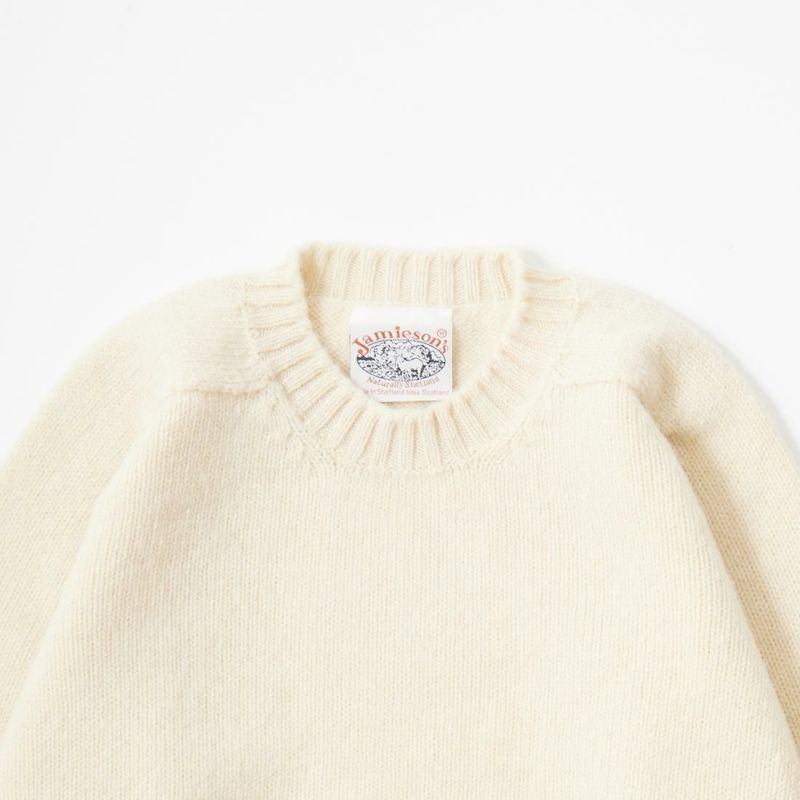 JAMIESON'S(ジャミーソンズ)の3PLY PLAIN SADDLE SHOULDER CREW NECK。3本撚りの太い糸で編まれたしっかりとしたシェットランドセーター。肩はラグランスリーブの一種のサドルショルダー。肩部分が平行でラグランスリーブより切り替えの形が角張った形。鞍(サドル)をかけたような見た目が由来。袖と脇のサイドシームが無いホールガーメントで編み上げたシームレス仕様。スタンダードなデザインでスタイルを選ばない使い勝手の良い1着です。