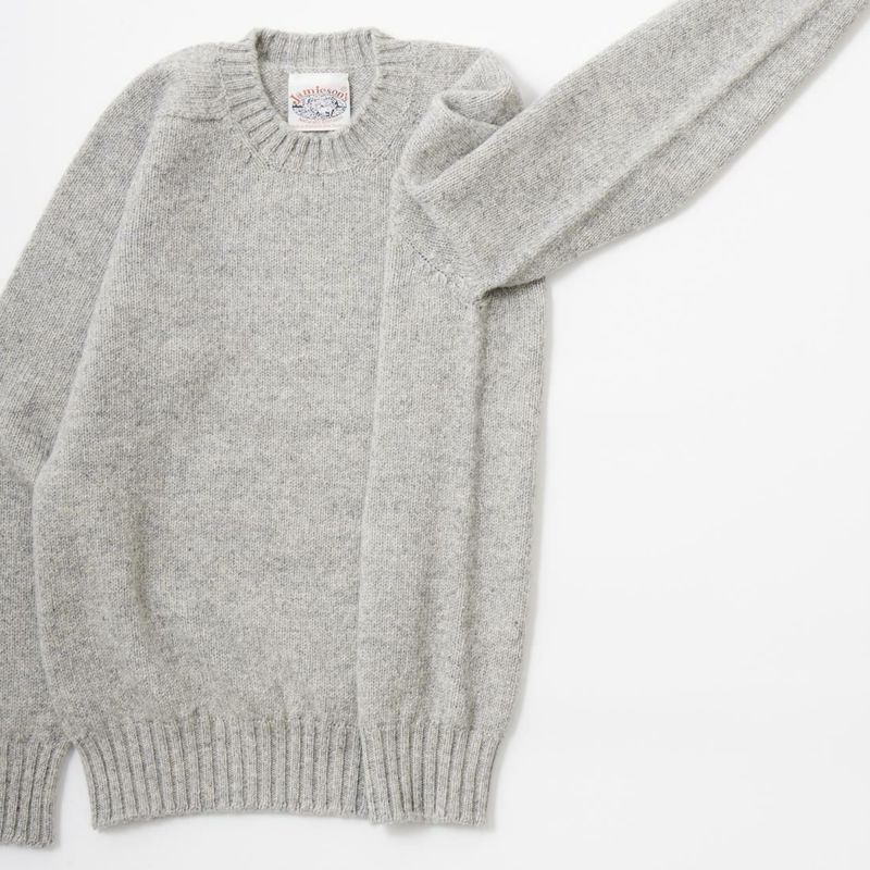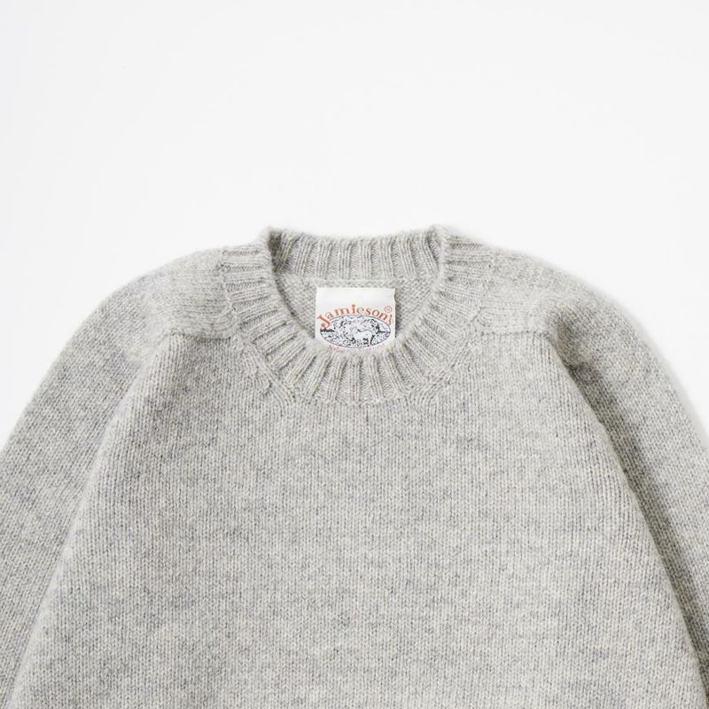 JAMIESON'S(ジャミーソンズ)の3PLY PLAIN SADDLE SHOULDER CREW NECK。3本撚りの太い糸で編まれたしっかりとしたシェットランドセーター。肩はラグランスリーブの一種のサドルショルダー。肩部分が平行でラグランスリーブより切り替えの形が角張った形。鞍(サドル)をかけたような見た目が由来。袖と脇のサイドシームが無いホールガーメントで編み上げたシームレス仕様。スタンダードなデザインでスタイルを選ばない使い勝手の良い1着です。