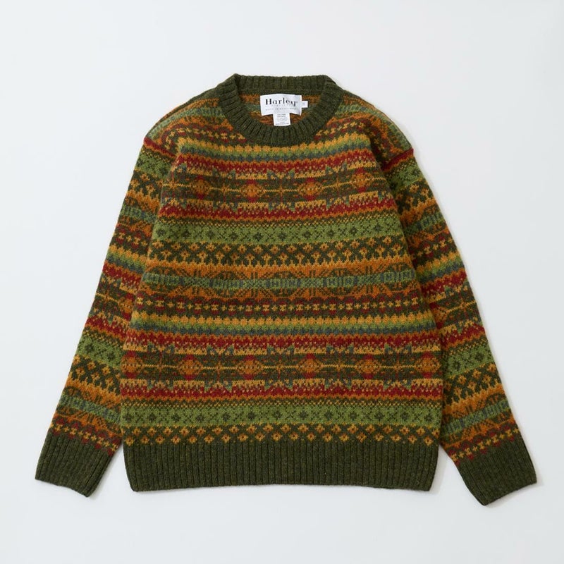 HARLEY OF SCOTLAND(ハーレーオブスコットランド)のALL OVER FAIRISLE CREW SWEATER。全面フェアアイル柄のクルーネックニット。ハーレーオブスコットランドではあまりリリースされていないタイプの柄編み仕様。コーディネートのちょっとしたアクセントに最適な1着。