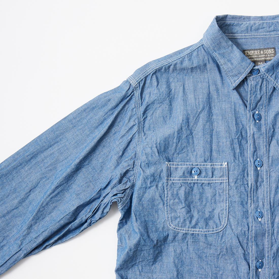 他の画像を見る ワークシャツ 5オンス オーガニックコットン セルビッチシャンブレー 日本製 EMPIRE & SONS (エンパイア アンド サンズ) L/S UTILITY WORK SHIRT 5oz ORGANIC COTTON SELVEGE CHAMBRAY - BLUE 販売価格 ¥ 18,480 税込 お気に入りに登録する