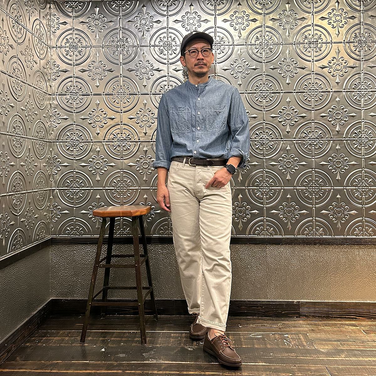 他の画像を見る バンドカラーシャツ 5オンス ヴィンテージシャンブレー 日本製 EMPIRE & SONS (エンパイア アンド サンズ) L/S BAND COLLAR SHIRT 5oz VINTAGE CHAMBRAY - BLUE_NATURAL STITCH 販売価格 ¥ 18,480 税込 お気に入りに登録する
