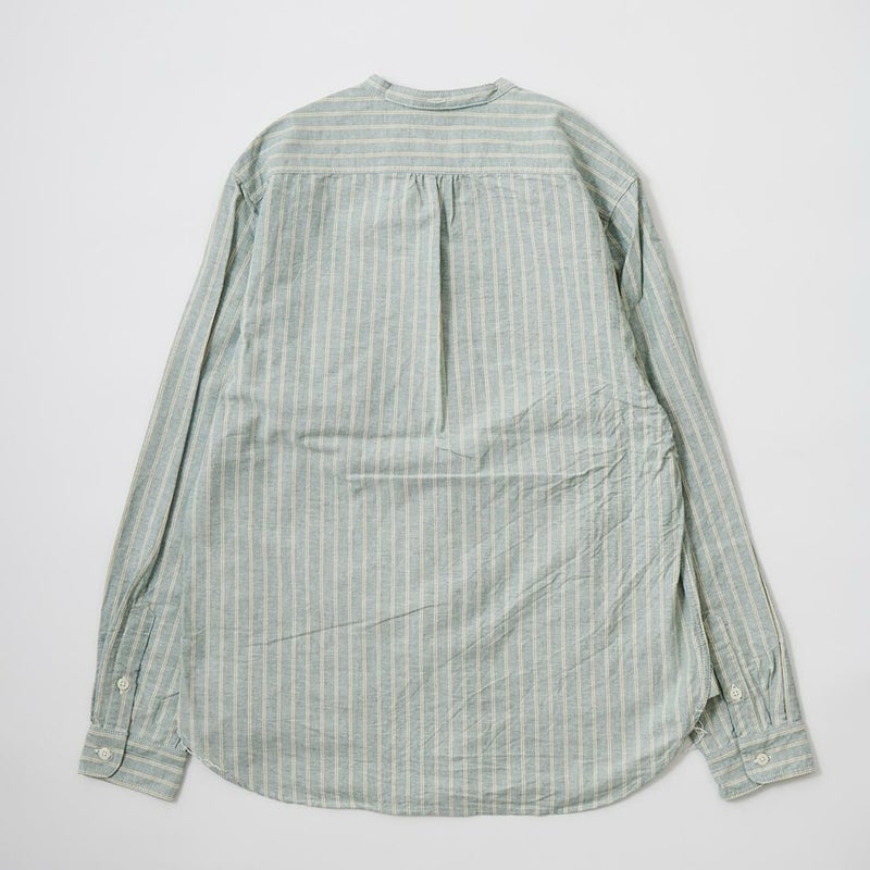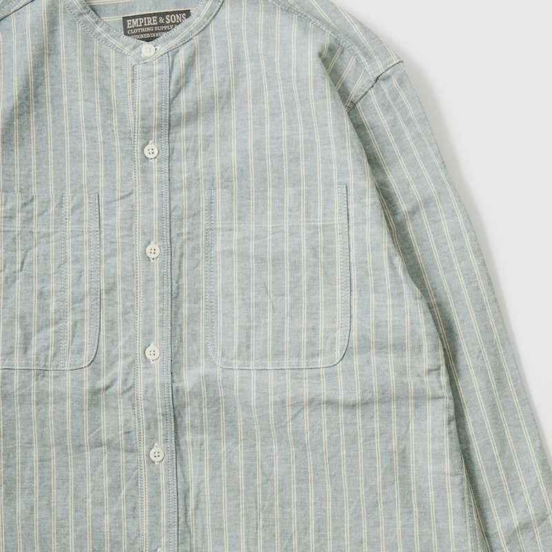 EMPIRE&SONS(エンパアアンドサンズ)のL/S CLASSIC BAND COLLAR SHIRT VINTAGE OXFORD。オックスフォードのストライプ生地を使用したバンドカラーシャツ。クラシックな色合いと風合いを持った絶妙な生地。古いミリタリーのデタッチャブルカラー(取り外し可能な襟)シャツのような低めの台襟に、身頃脇には耐久性に優れたダブルステッチ(二本針)を採用。台襟の後ろに昔の名残ともいえるボタンホールがデザインとして残っています。両胸にパッチポケットを配し、ウエストに絞りの無い、ワークシャツの様なカジュアルなシルエット。着込むことで経年変化も楽しんで頂ける1着。