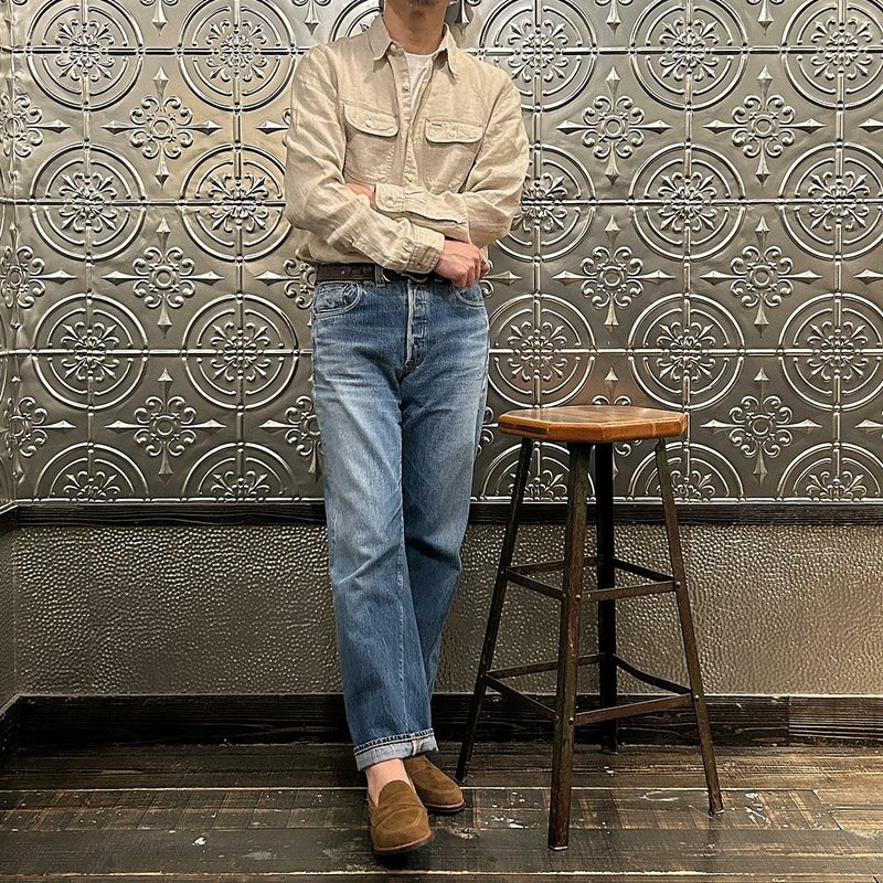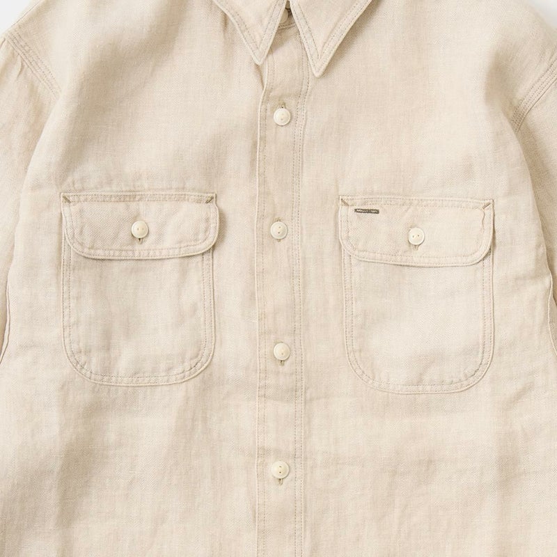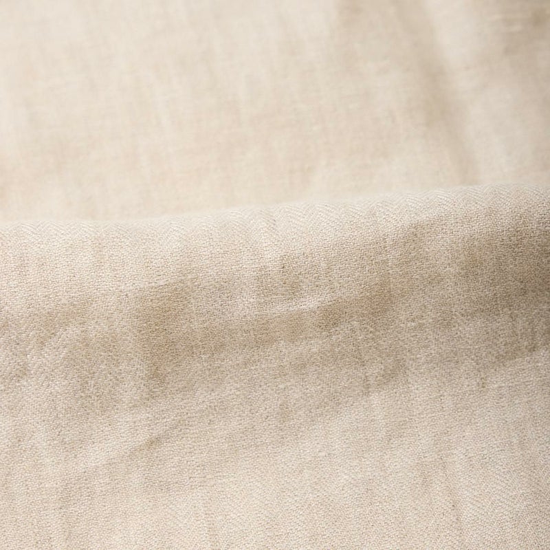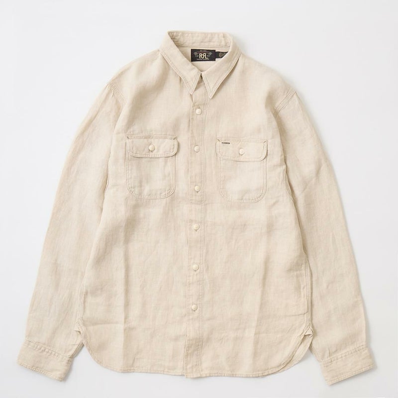 Double RL(ダブルアールエル)のMASON WS LONG SLEEVE SPORT SHIRT LINEN HBT。リネンのヘリンボーンツイルを使用したシャツ。1940年代のワークシャツがデザインソース。左右の胸にフラップ付きのパッチポケット。トリプルニードル(三本針)による縫製。脇下に補強と風通しを良くするアイレット刺繍。リネン素材をウィッシュ加工。ヴィンテージ感たっぷりの1着。