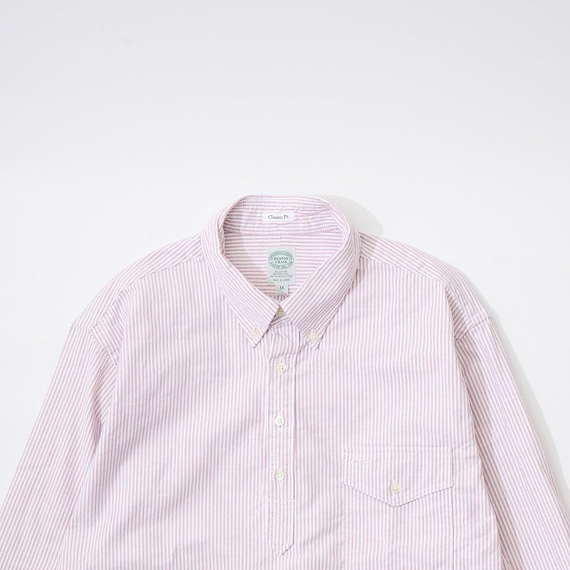 KEATON CHASE USA(キートンチェイスUSA)のL/S CLASSIC FIT PULLOVER BD SHIRT PREMIUM OXFORD LONDON STRIPE。日本生産ラインのプルオーバーの長袖ボタンダウンシャツ。左胸にフラップポケットが配置。背面はボックスプリーツ仕様。襟の後ろにはチョークボタン付き。程よいゆとりのクラシックフィット。素材はコットンオックスフォードのキャンディーストライプ。
