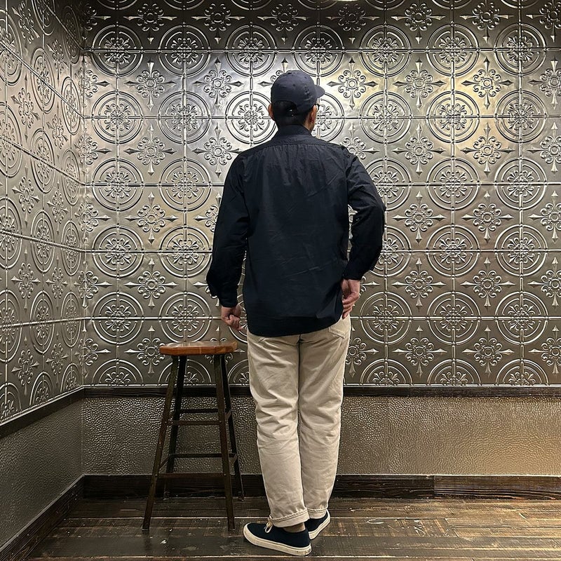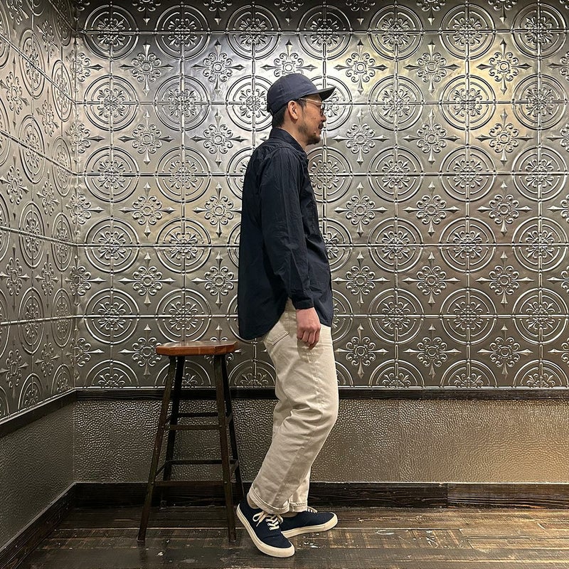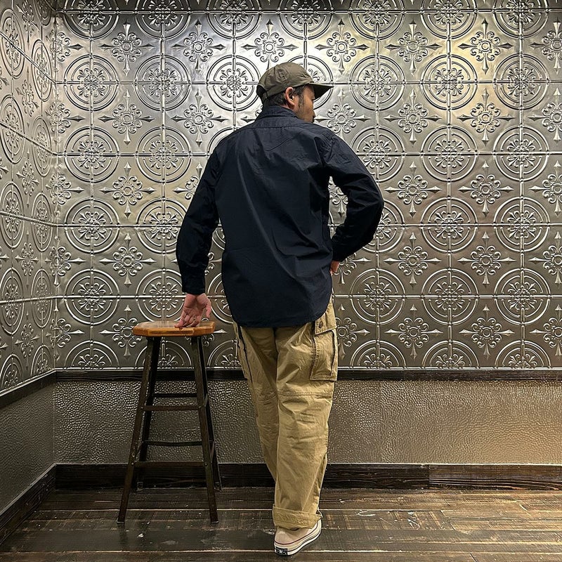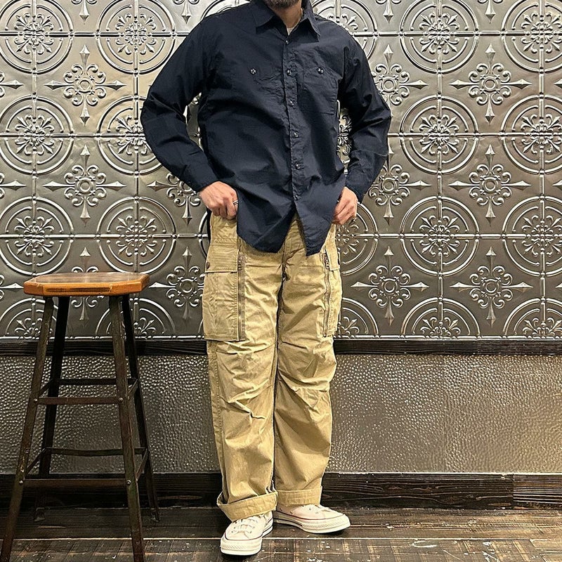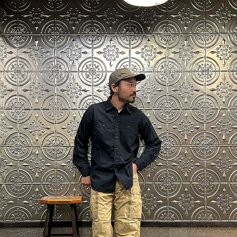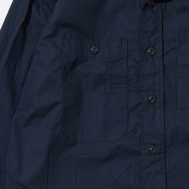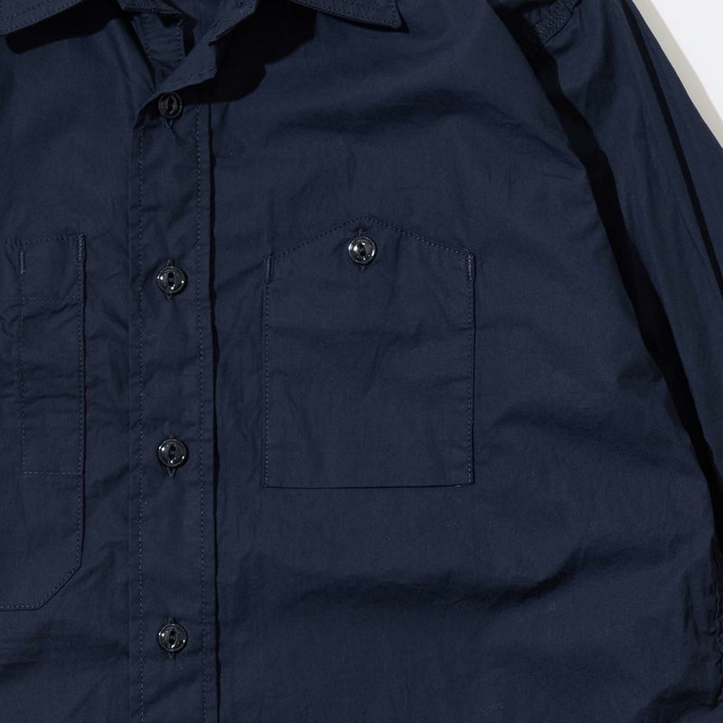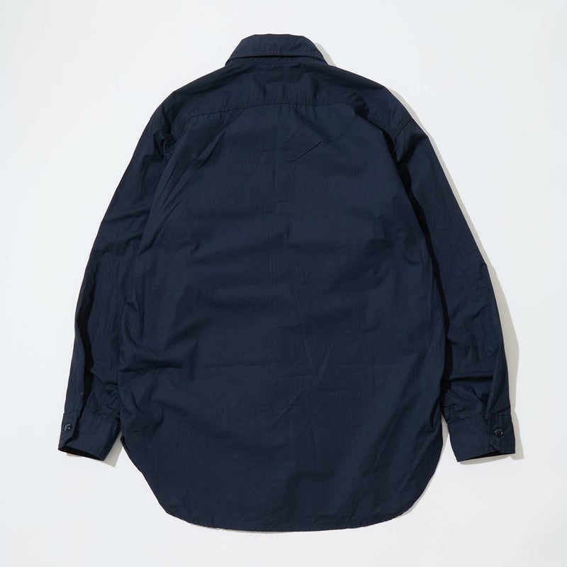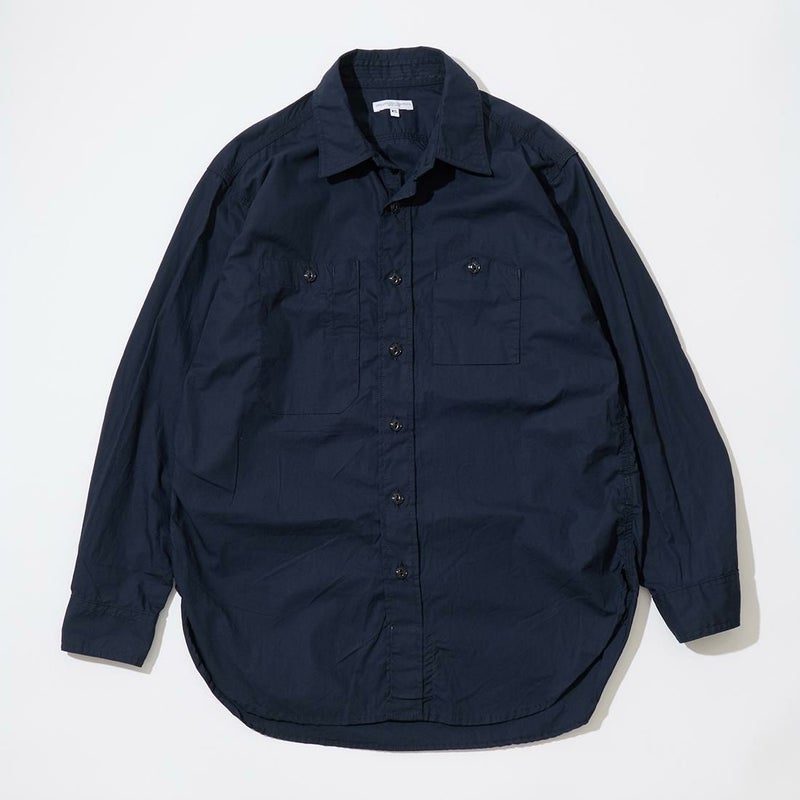 ENGINEERED GARMENTS(エンジニアド ガーメンツ)のWORK SHIRT COTTON BROADCLOTH。肩や袖、脇はトリプルニードルで縫製され、肘の当て布やサイドのガゼット、カンヌキステッチなどワークなディテールがふんだんに盛り込まれている定番シャツ。左右非対称の胸ポケット。素材は光沢があり上品な雰囲気のブロードクロスを使用。