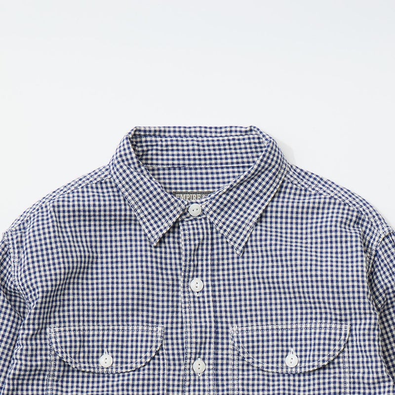 EMPIRE&SONS(エンパアアンドサンズ)のL/S UTILITY WORK SHIRT COTTON LINEN GINGHAM CHECK。アメリカ軍のユーティリティシャツがデザインソースのコットンリネン素材を使用したワークシャツ。大きめサイズの襟でトリプルニードル(三本針)による縫製。フロント左右に配置された丸みのあるフラップ付きのパッチポケット。素材は清涼感のあるコットンリネン素材。ギンガムチェックがスタイリングのポイントに。