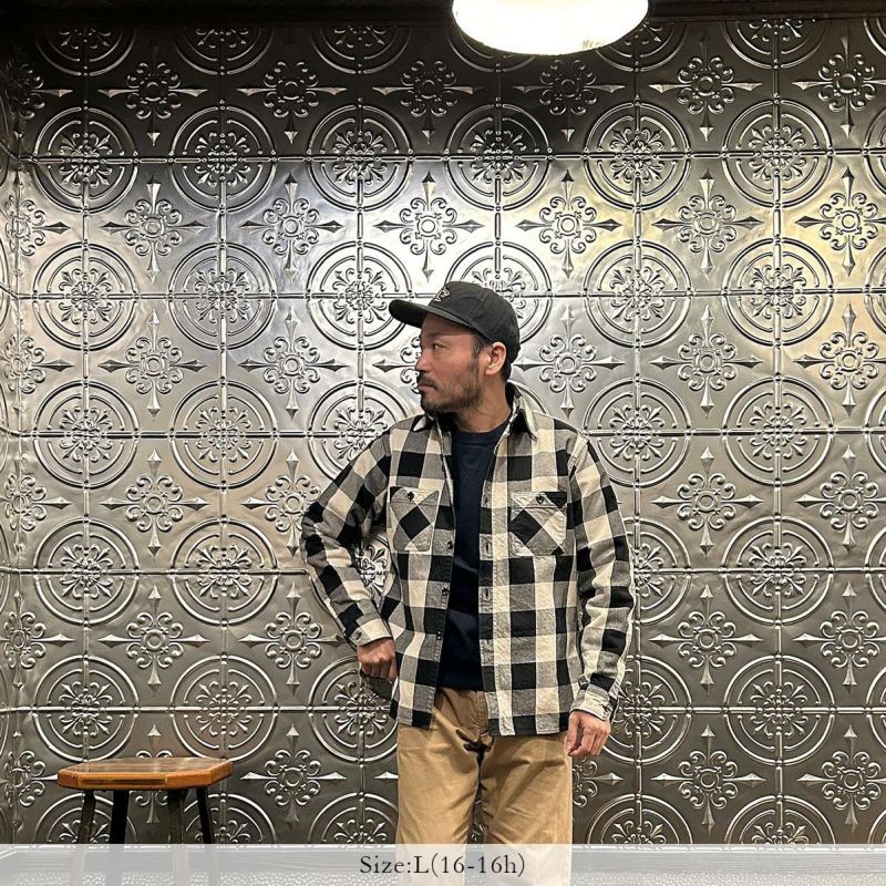 172センチ60キロで「S (14-14h)」でピッタリ目のサイズです。その場合、インナーTシャツ一枚でピッタリ目の着用感になります。少し大き目で羽織りっぽい着方をする場合は「M (15-15h)」を着ます。中にスウェットやニットなどを着る余裕があります。サイズに関しては好みでジャストかワンサイズ大き目を選ぶかという感じだと思います。生地も厚手でしっかりとしているので普段よりもワンサイズ上を選ぶ方が良いかもしれませんね。ピッタリ目でシャツっぽい着方がお好みであればいつも通りのサイズで。コットンのバッファローチェックが凄く良い雰囲気。経年変化を楽しめそうな生地感です。退色してきた頃がカッコイイでしょうね~。古着だとこの手のチェックはウールモノが多かったりするのでコットンであるという事が非常に汎用性が高いのではないかと。チクチクもしないですし、気軽にガンガン洗えますしね!