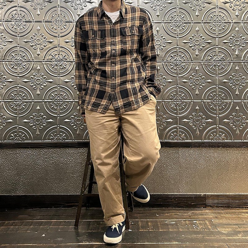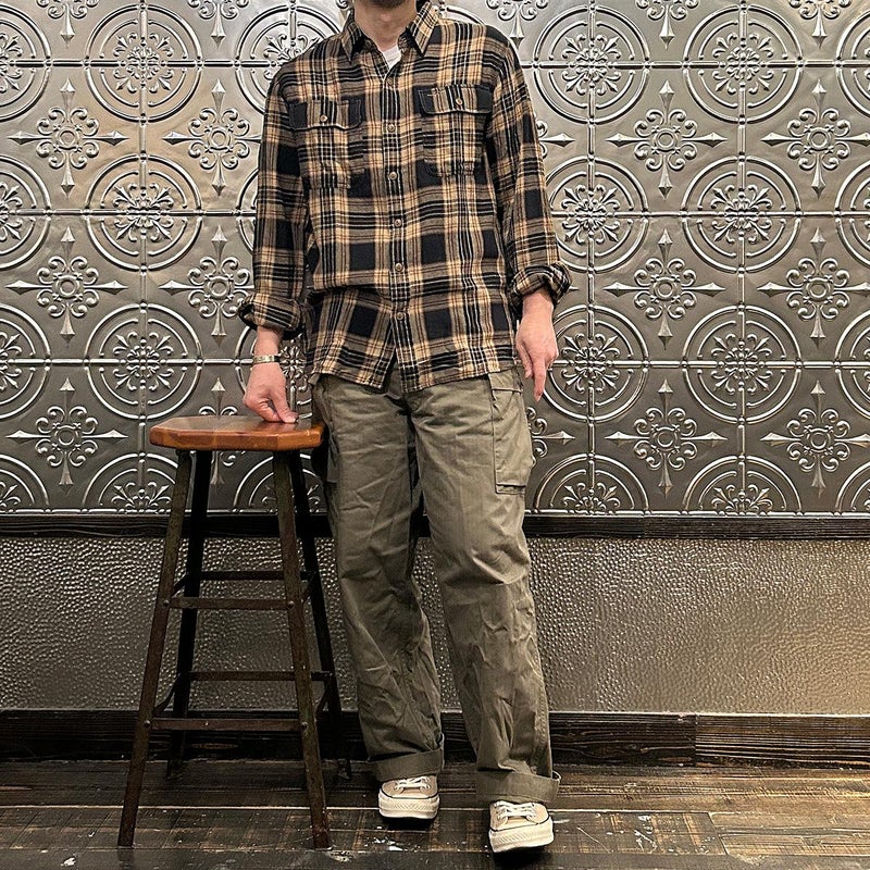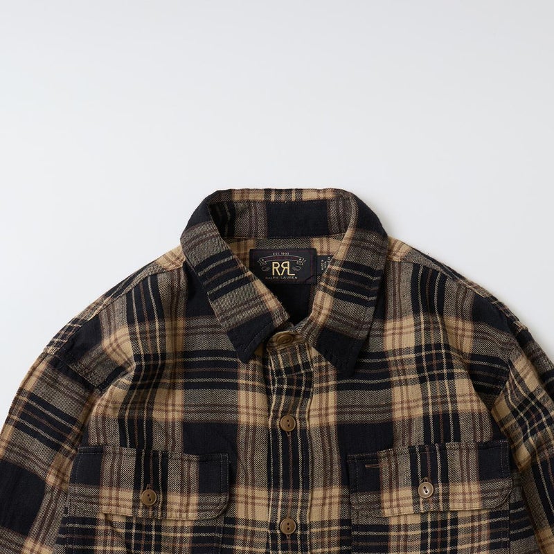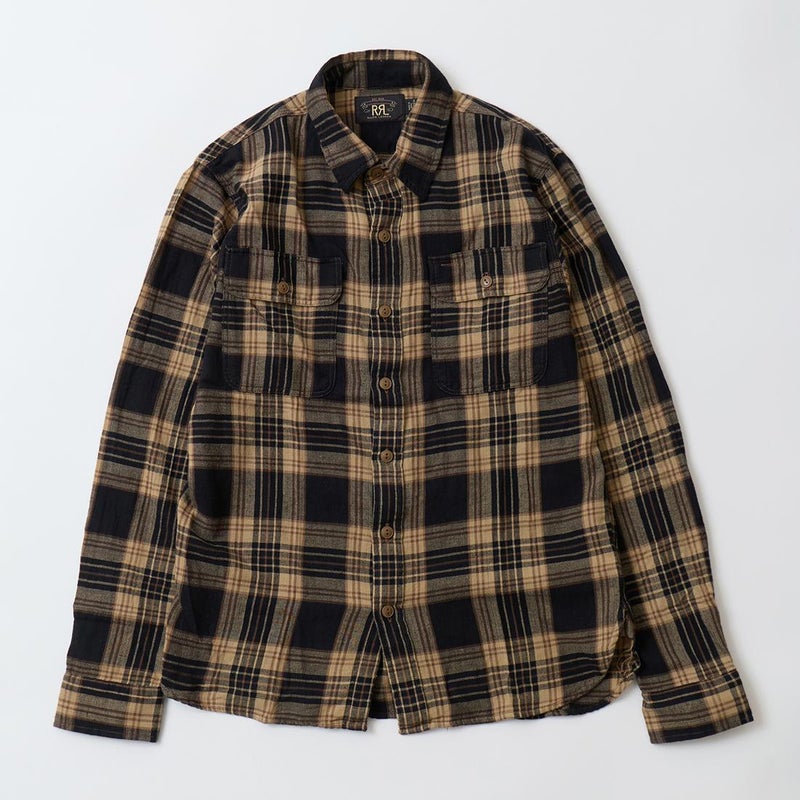 Double RL(ダブルアールエル)のGREYSON WS LONG SLEEVE SPORT SHIRT。コットンとリネンのツイルを使用したワークシャツ。1950年代のワークシャツがデザインソース。両胸に大きめのフラップ付きのパッチポケット。トリプルニードル(3本針)による縫製。マチ付きの裾。身頃と袖にゆとりを持たせたクラシックなシルエット。ガーゼのような生地で着用感も良い1着。