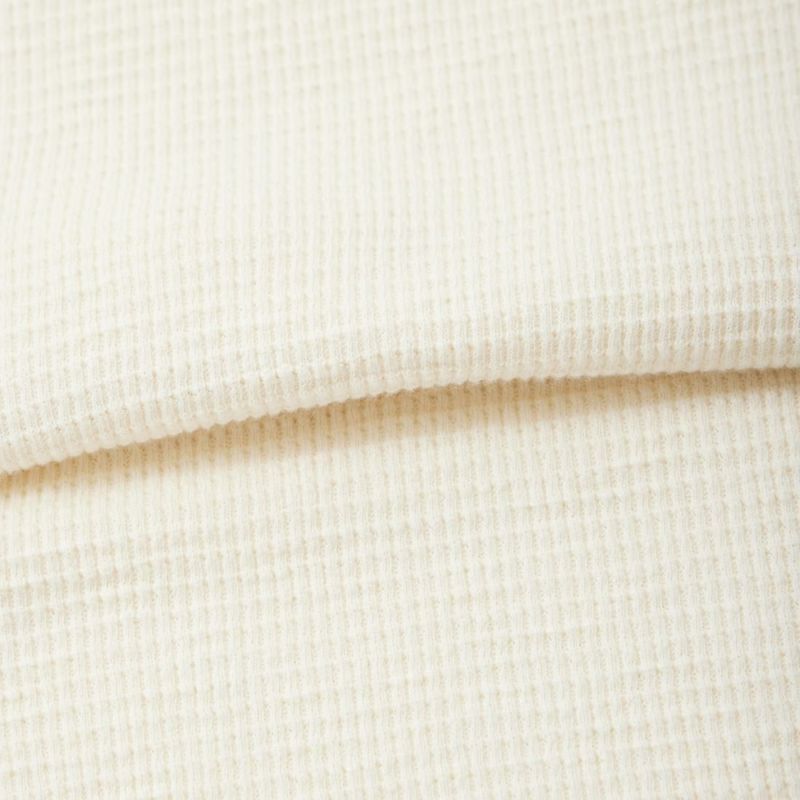 172センチ58キロでサイズはSサイズでジャストサイズです。どちらかといえば体に沿うようなピッタリ目の着用感ですね。インナーとしても使やすいサイズ感といえばいいでしょうか。柔らかくて、それでいてしっかりとした生地感のワッフル編みのヘンリーネック。シャツの首元からチラッと覗かせたり、インナーとしてもかなり使える一枚です。