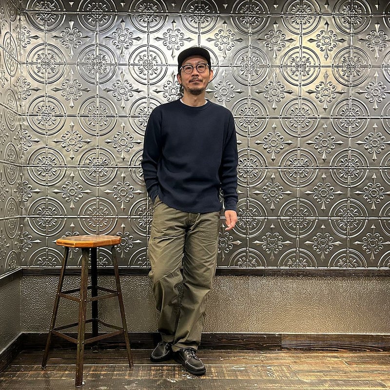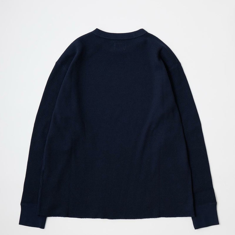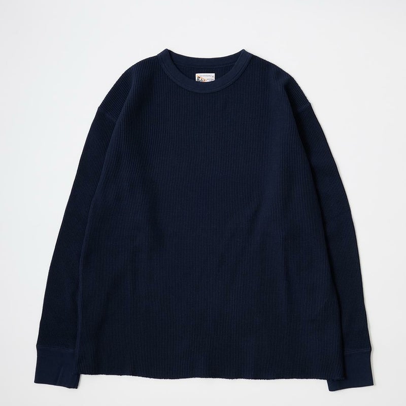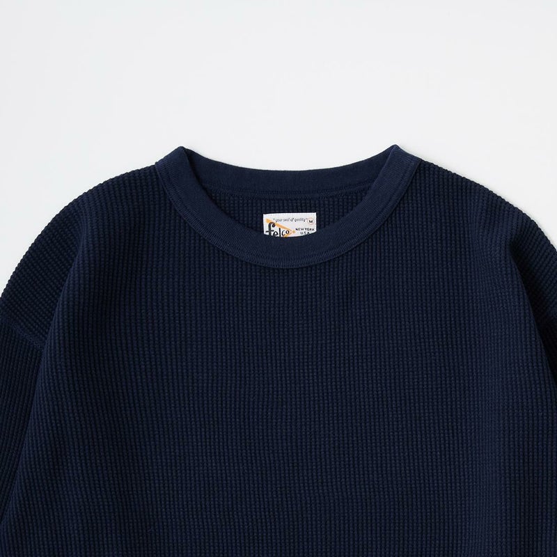 FELCO(フェルコ)のL/S THERMAL CREW MIDDLE WEIGHT。シンプルなデザインで使い勝手の良いサーマル素材のクルーネックの長袖Tシャツ。しっかりとしたバインダーネックの襟元。袖口はリブ仕上げ。程よい厚みで柔らかく伸縮性のあるコットン100%のサーマル素材を使用。ボックスシルエットで程良いゆとりがあり、インナーとしては勿論ですが単体でも活躍してくれる一枚。