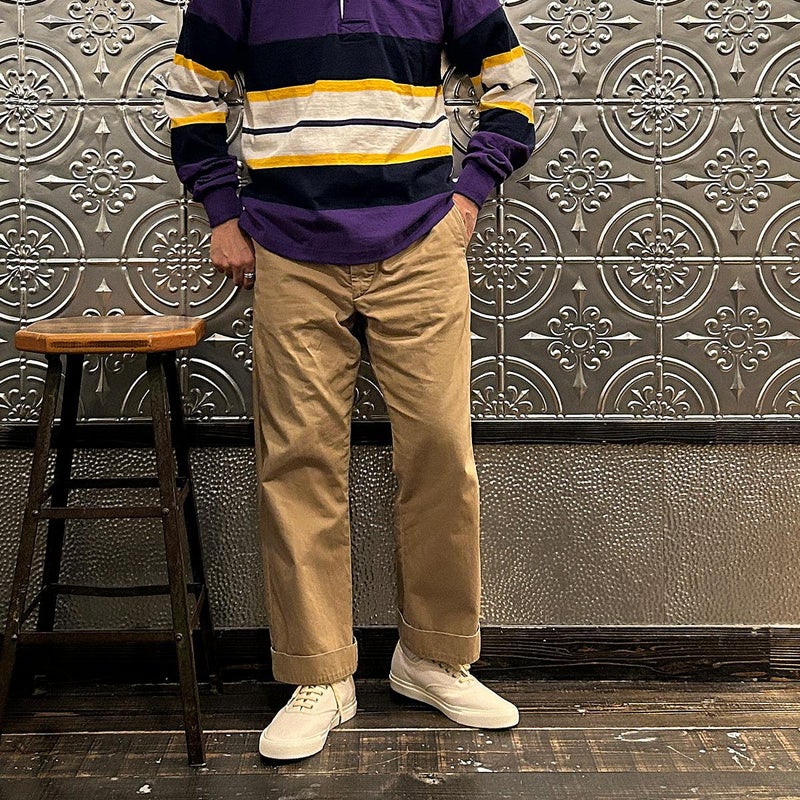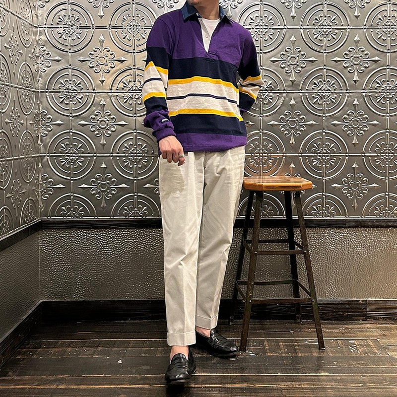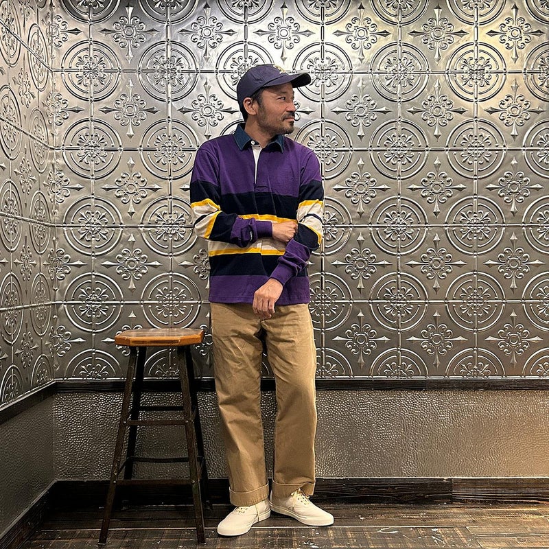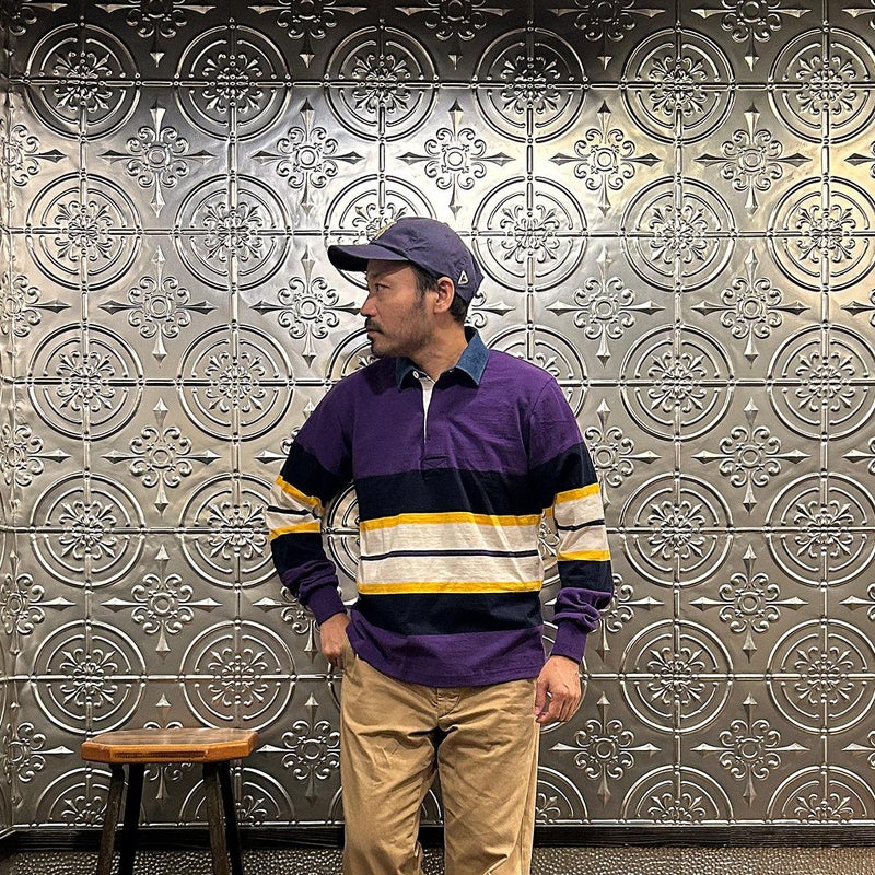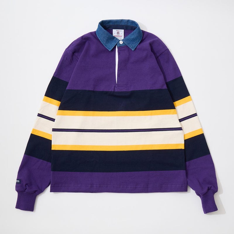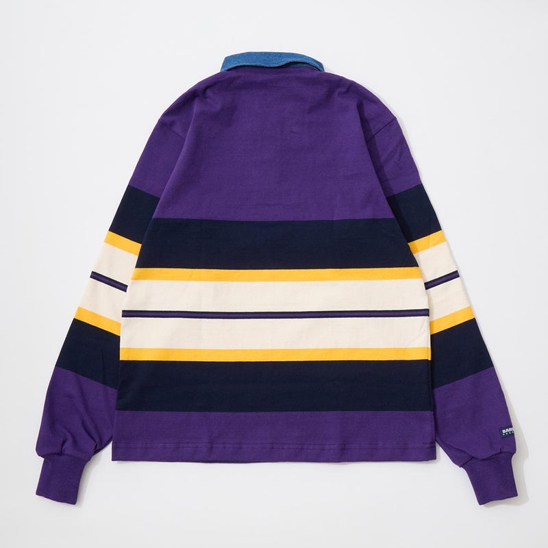 BARBARIAN(バーバリアン)のEXCLUSIVE LIGHT WEIGHT L/S RUGBY SHIRT。別注モデルの長袖ラグビーシャツ。配色から細かい仕様まで熟考して作った渾身の別注!定番の12オンスへヴィーウェイトコットンと同じ糸を使いながら、重量を約30%軽くした8オンスのライトウエイトの生地を使用。襟はデニム素材。すっきりとしたシルエットでありながら、肩幅、身幅に程良いゆとりを持たせた日本人の体形を考慮して作られたジャパンサイズスペック。着込む事で生まれる経年変化も楽しんで頂ける1着。洗濯によって着丈、袖丈が1-2センチ程度縮みます。