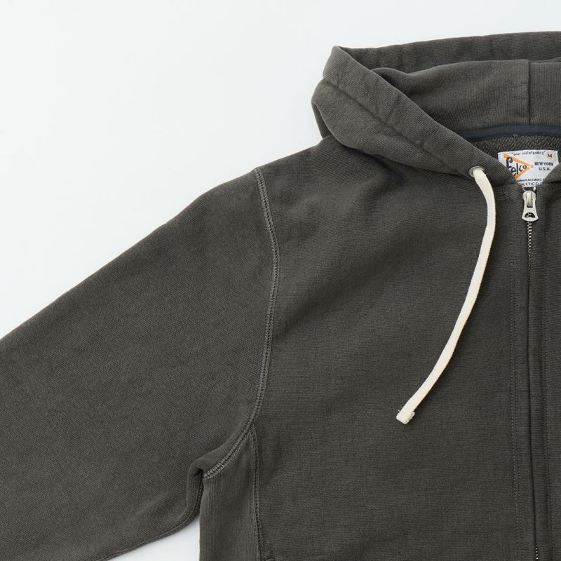 FELCO(フェルコ)の CLASSIC FIT INVERSE WEAVE FULL ZIP PARKA SLASH POCKET 16oz HEAVY WEIGHT TERRY。厚みとコシのある16オンスのヘビーウェイトのフレンチテリー(裏起毛していないスウェット生地)を使用したフルジップパーカー。生地を横向きに使用することで縦の縮みを軽減し、サイドリブが横縮み防止と動きやすさを実現したインバースウィーブの仕様。利便性の高いダブルジップ。腰部分の左右にスラッシュポケットを装備。全体的にゆとりのあるクラシックフィット。長めの袖と裾のリブ。アウター、インナーと活躍してくれる1着。