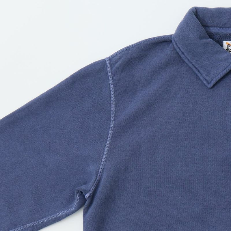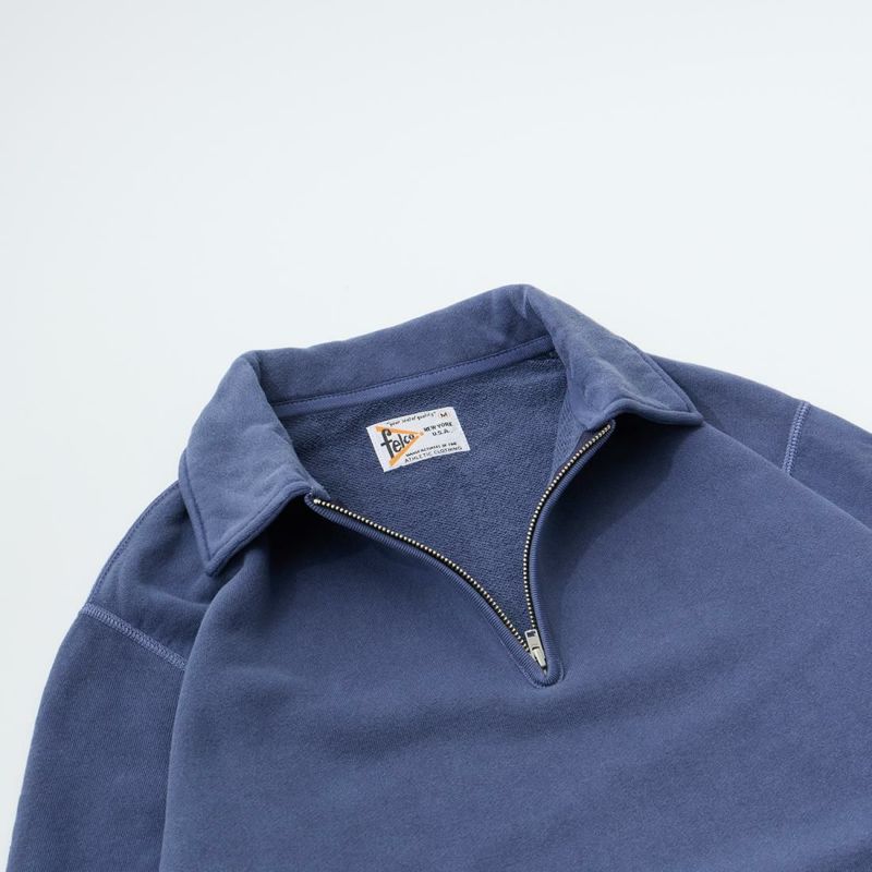 FELCO(フェルコ)の10oz LT WEIGHT FRENCH TERRY L/S HALF ZIP COLLARED SWEAT。10オンスのフレンチテリー(裏起毛していないスウェット生地)素材を使用したセットインスリーブのハーフジップのスウェットシャツ。40-50年代に多く見られるハーフジップの襟付きタイプのスウェットを現代風にモディファイ。袖口、裾はヴィンテージライクな長めのリブ仕様。肩や脇部分はフラットシーム仕上げ。特に襟周りのフィッティング、襟の立ち上がりや上着を着た時の襟の収まりに拘った一枚