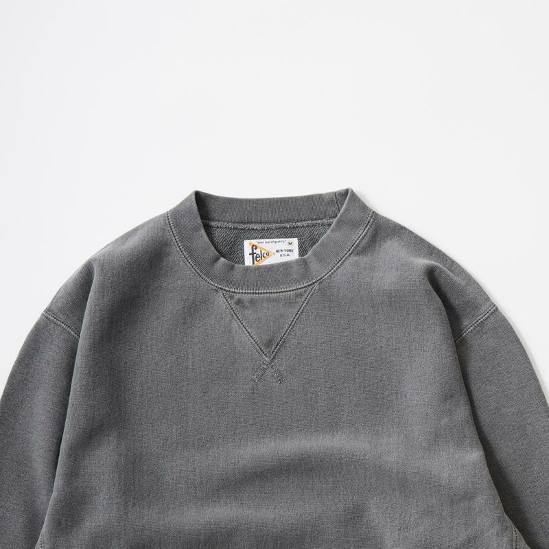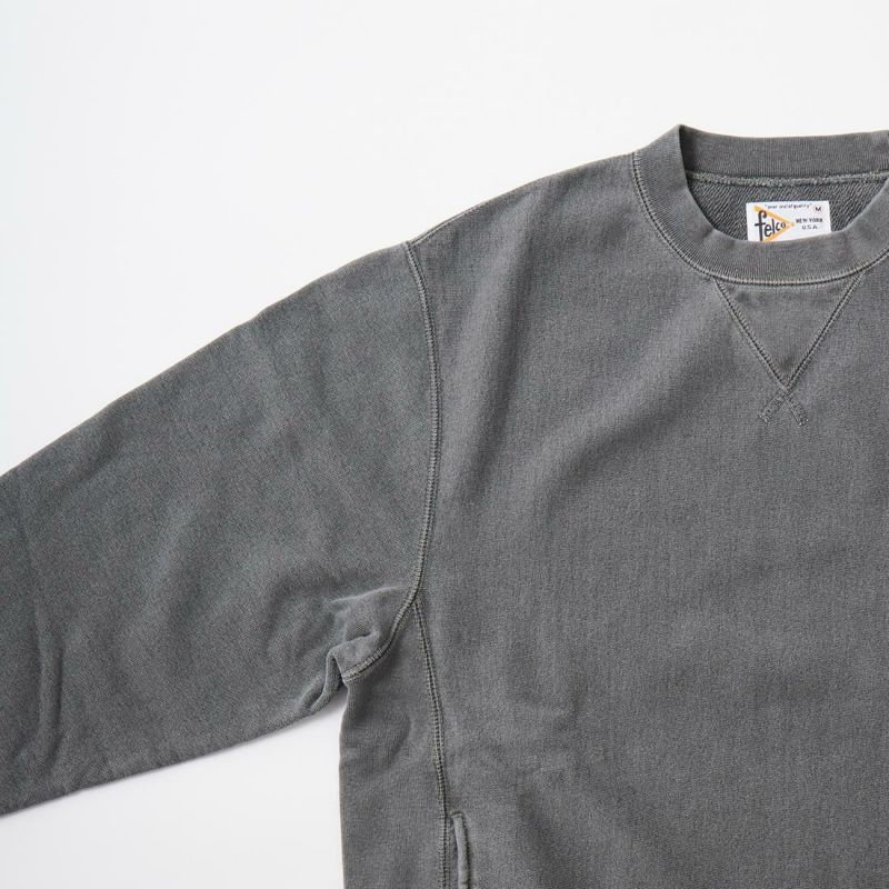 FELCO(フェルコ)のCLASSIC FIT L/S INVERSE WEAVE V GUSSET SWEAT W/SLASH POCKET 12oz MD WEIGHT FRENCH TERRY。12オンスのフレンチテリー(裏起毛していないスウェット生地)素材を使用したVガセット付の長袖クルーネックスウェット。生地を横向きに使用することで縦縮みを軽減し、サイドのリブが横縮み防止と動きやすさを実現したインバースウィーブ仕様。裾はヴィンテージライクな長めのリブ仕様。従来のモデルよりも全体的にゆとりを持たせたクラシックフィット。身幅と腕回りはゆったりとしていますがルーズ過ぎない計算されたバランス。ヴィンテージスウェットを彷彿とさせる1着。