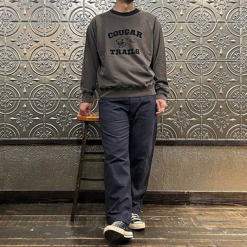 MIXTA(ミクスタ)のL/S CREW NECK RAGLAN SWEAT SHIRT COUGAR。プリントのデザインや生地の風合いにヴィンテージ感のあるラグランスリーブのプリントスウェット。柔らかい生地感で分厚すぎず、インナー使いもしやすい裏起毛のミドルウエイト。使用する糸の段階から最終的なプリントの行程まで、全てアメリカの自社工場にて行われています。また、プリントは一枚一枚すべてハンドメイド。70~80年代の古着のプリントTシャツからアレンジしたデザインが採用されています。
