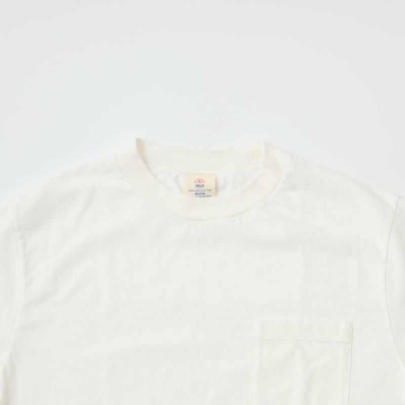 アメリカ発「FELCO(フェルコ)」のS/S HI CREW TEE USA COTTON。クラシックサーフをテーマに掲げるコレクションラインからのリリース。太めのネックリブで首元の詰まった、ハイクルーが特徴的なポケットTです。やや短めの着丈、身幅の広めのボックスシルエットになっています。サラッとした肌触りのテキサスコットンを使用しており、薄手で通気性も良くインナーとしても最適です。