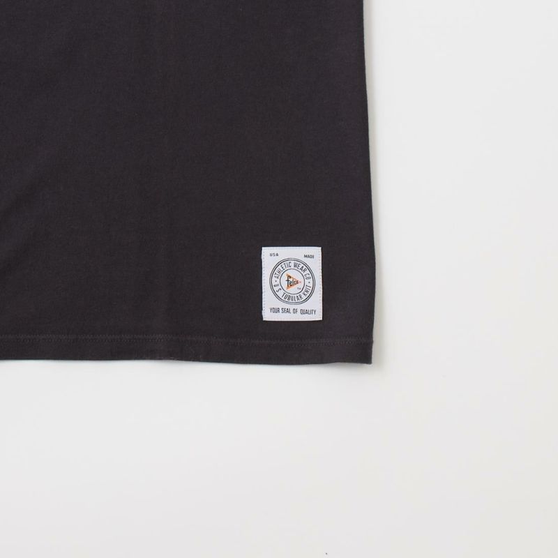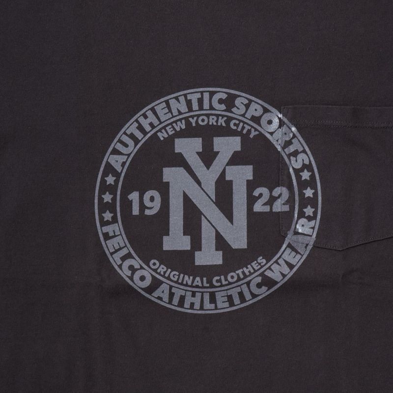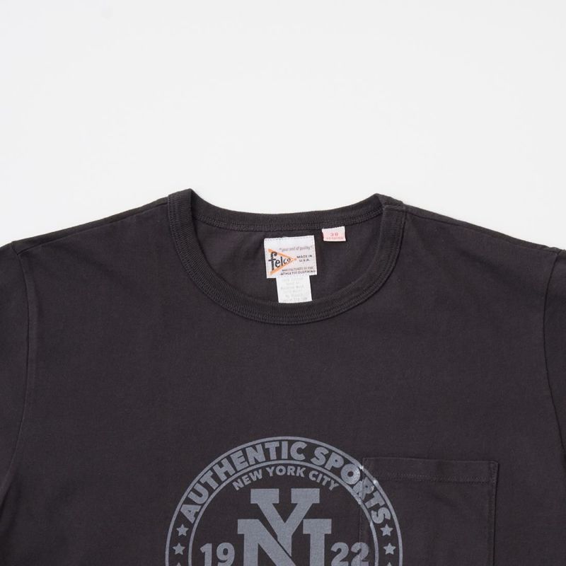 アメリカ発「FELCO(フェルコ)」のS/S CREW NECK POCKET T W/PRINT - NY CIRCLE FRONT。縫い目のない丸胴ボディのクルーネックポケットT。フロント中央に大きくプリントされています。やや短めの着丈でリラックス感のある、アメリカらしいボックスシルエットが特徴です。年々減少しつつあるアメリカ製というのも大きな魅力。クルーネックはバインダーの仕様で伸びにくく、ヘビーに使って頂けます。さらっとした生地感で地厚過ぎず、袖もやや細身な為、ジャケットやカーディガンなど小綺麗なアウターのインナーにも最適です。