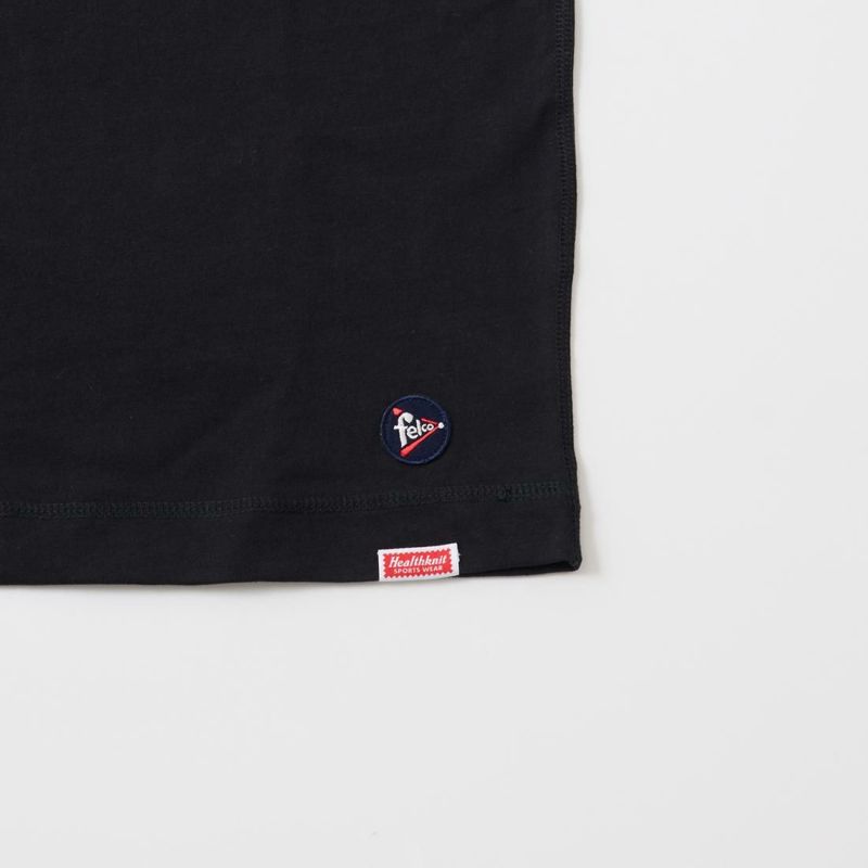 HEALTH KNIT(ヘルスニット)とFELCO(フェルコ)のダブルネームのS/S CREW NECK POCKET T SHIRT U.S.COTTON OPEN END JERSEY。オーソドックスなクルーネックのポケットTシャツ。幅が広めのバインダーネックがクラシカルな雰囲気。左胸にはFELCO(フェルコ)のアイコン的なディテールのポケットを装備。風合いの良いU.Sコットンを特注で編み立てた生地を使用。吸水性と速乾性に優れ、抗菌、防臭効果も備えた優れもの。左裾に付けられたFELCO(フェルコ)のワッペンが全体のアクセントになっています。