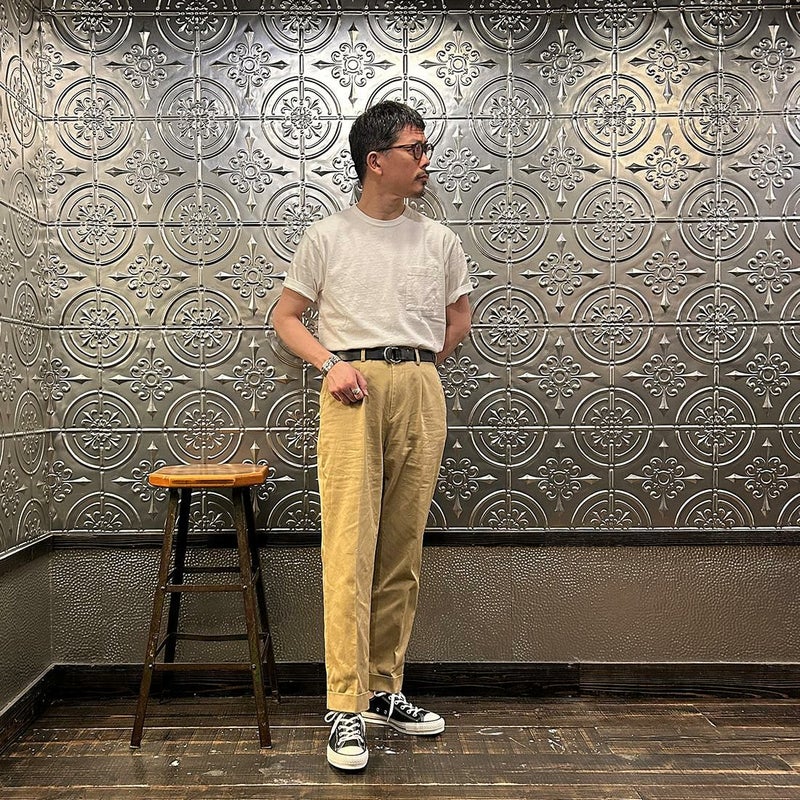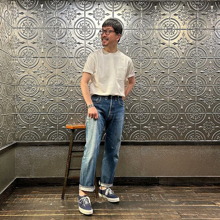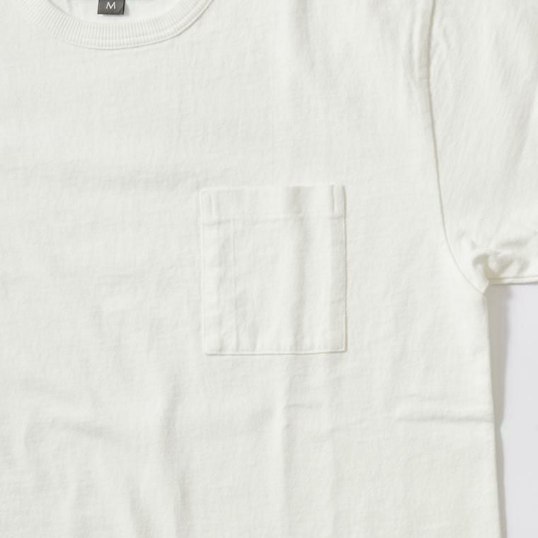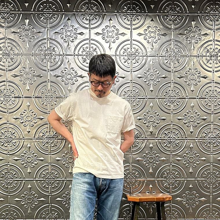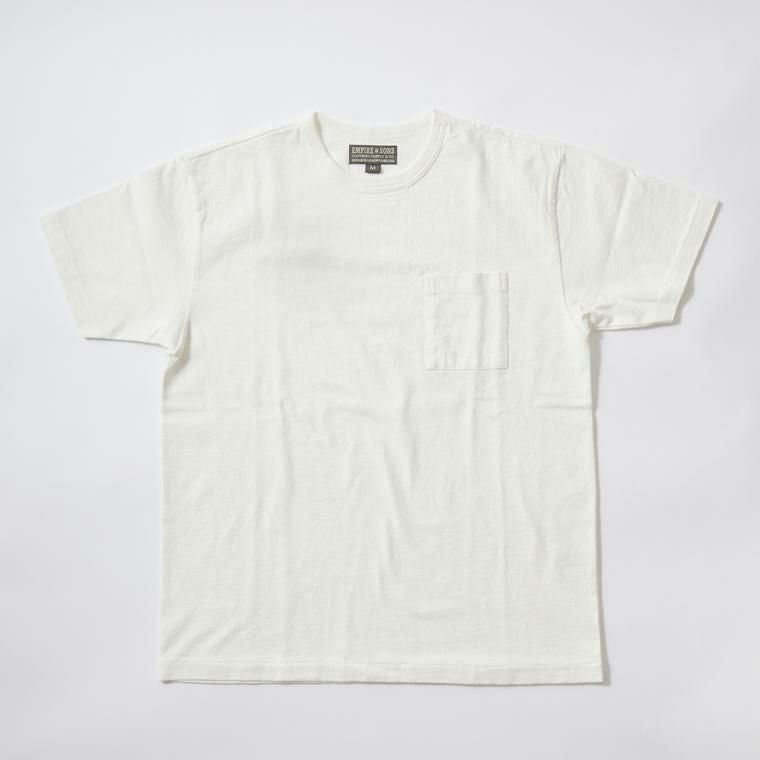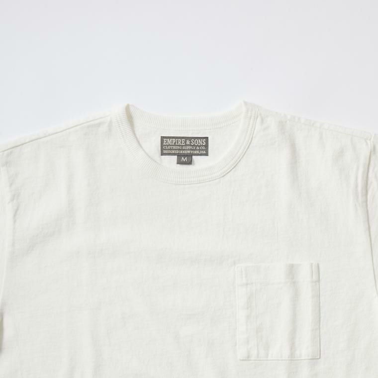 EMPIRE&SONS(エンパイアアンドサンズ)のS/S CREW POCKET TEE US COTTON SINGLE STITCH。ミドルウエイトのコットン素材を使用したTシャツ。細めのバインダーネックで広すぎず、狭すぎない絶妙な開き具合のネックライン。左胸にパッチポケットを配置。1枚で着用した時のポイントに。程よいリラックス感のあるシルエット。製品にしてからの洗い加工による古着のTシャツのような風合いもポイント。スタイリングの幅が広く、インナー用途としても単体でも活躍。
