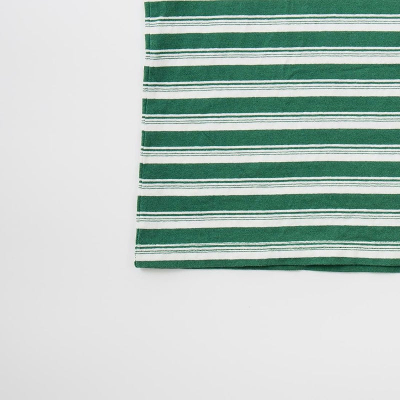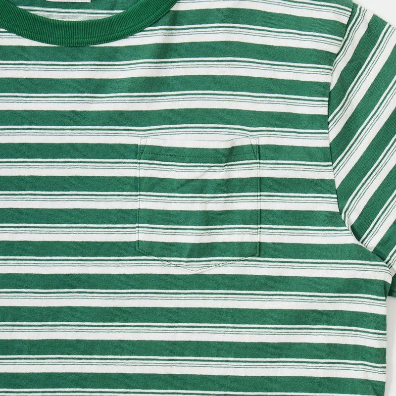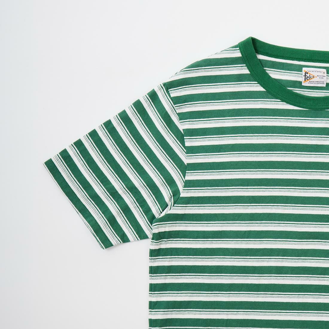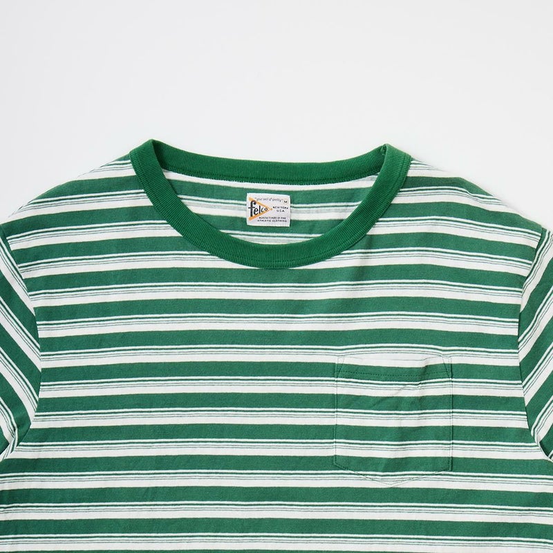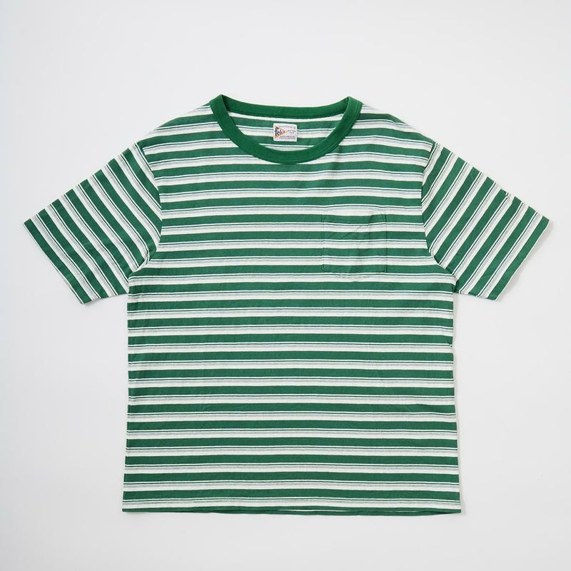 FELCO(フェルコ)のS/S BINDER CREW NECK STRIPE POCKET TEE AMERICAN DRY JERSEY STRIPE2。ストライプ柄のコットン素材を使用したクルーネックの半袖Tシャツ。しっかりとしたバインダーネックの襟元や胸のポケット、リブなしの袖口が特徴的なディテール。アメリカブランドらしい身幅には程良いゆとりがあり、着丈がやや短めとなるボックスシルエットのTシャツ。単体でもインナーとしても活躍してくれる丁度良いウエイトのコットン素材。ストライプ柄がシンプルなスタイリングのアクセントになってくれる1着です。