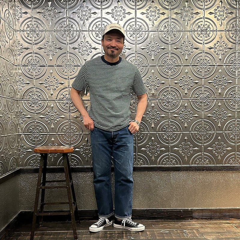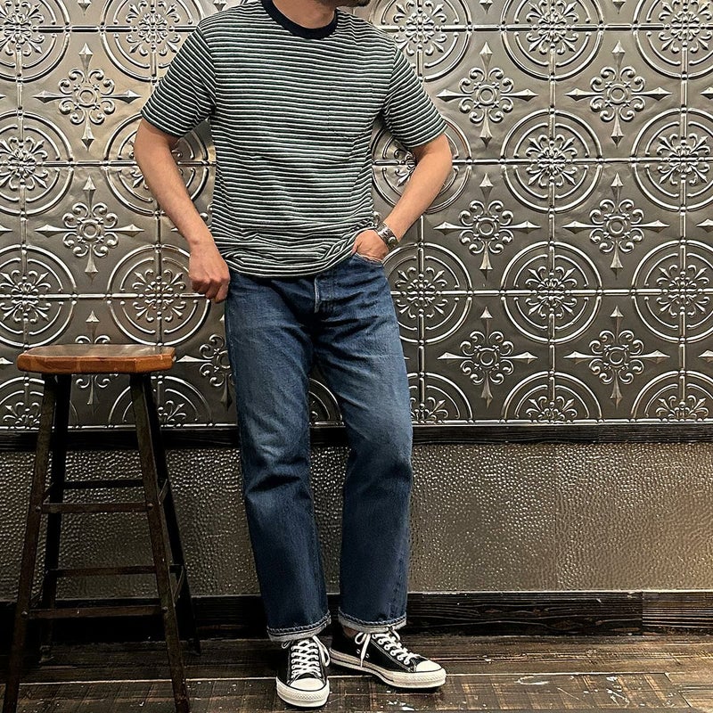 FELCO(フェルコ)のS/S CREW POCKET TEE RECYCLE MULTI STRIPE。クルーネックのボーダーポケットTシャツ。ネック部分はバインダー仕様。セットインスリーブ。左胸にパッチポケット。身幅にゆとりのあるボックスシルエット。生地は柔らかく肌触りの良いコットン素材。ミドルウェイト(中厚)で着心地も抜群。単体でもインナーとして活躍してしてくれる1着。 【25SS FELCO Stripe Tee】
