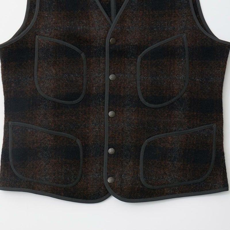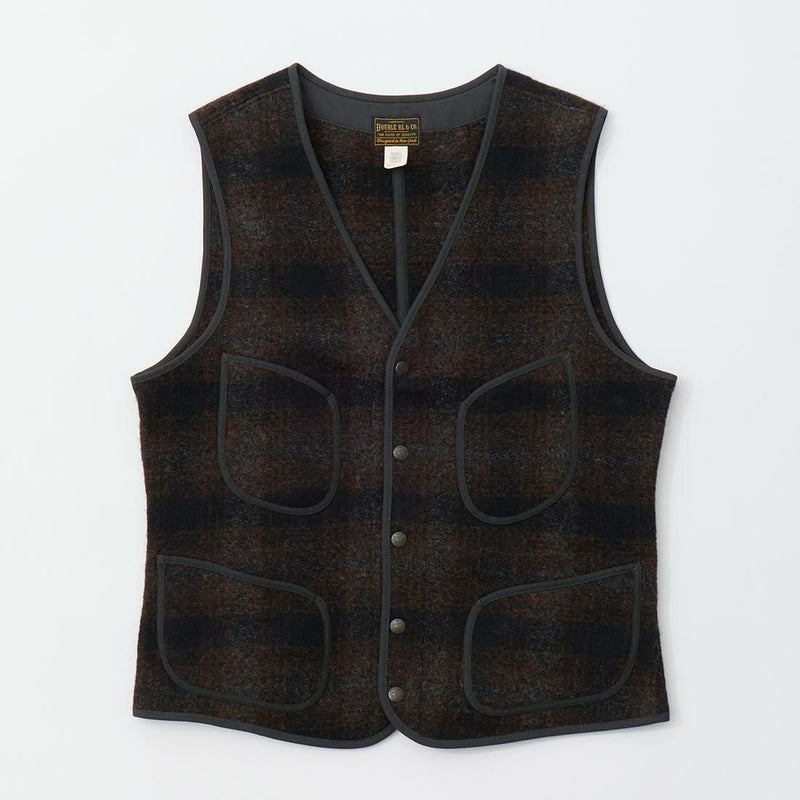 Double RL(ダブル アール エル)のMONROE VEST VEST WOOL/POLY JACQ。ウールとコットン混紡素材を使用したベスト。フロントに配置された4つのパッチポケット。背面にウエストのシルエット調節が可能なバックシンチ。前立てやアームホール、ポケットなどの縁はパイピング仕上げ。オリジナルのアンティークブラス仕上げのスナップボタン。素材はフェルトのようなダブルニットジャカード素材。落ち着いた色合いのオンブレチェックの雰囲気も良い1着。