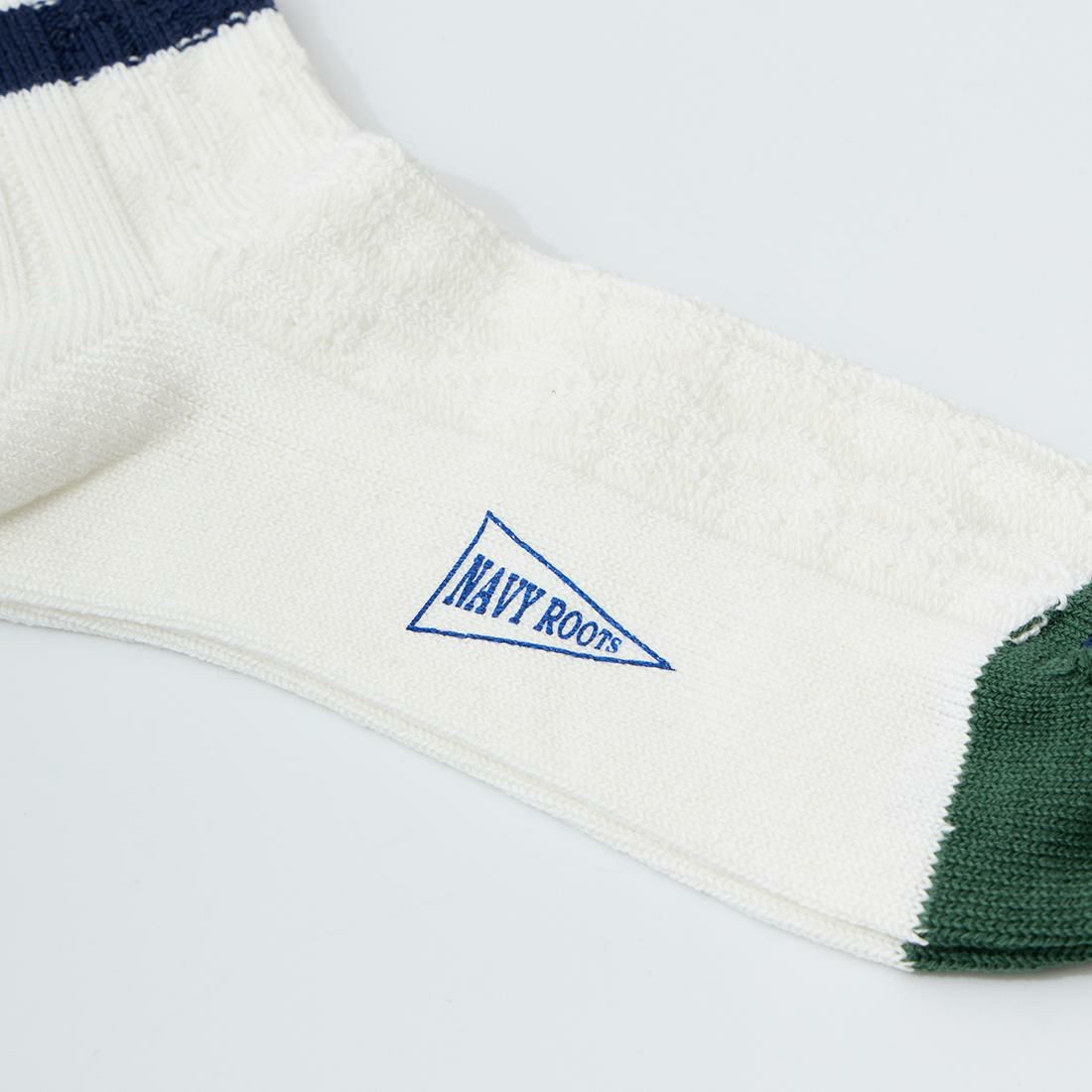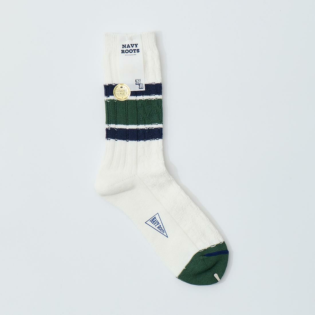 他の画像を見る ケーブル ボーダー ソックス 靴下 メンズ 日本製 NAVY ROOTS (ネイビールーツ) CABLE BORDER SOCKS - GREEN 販売価格 ¥ 1,980 税込 お気に入りに登録する