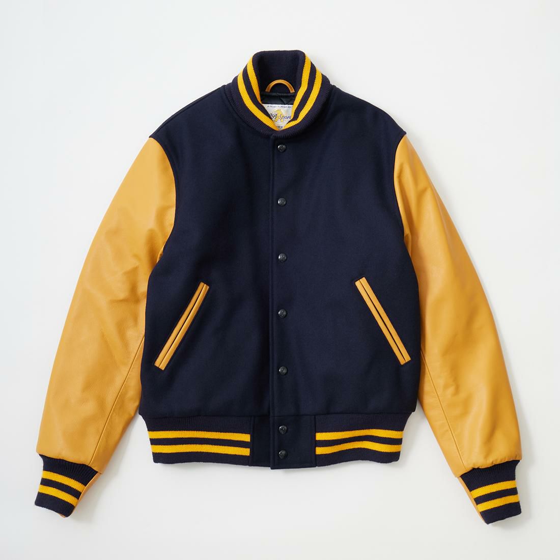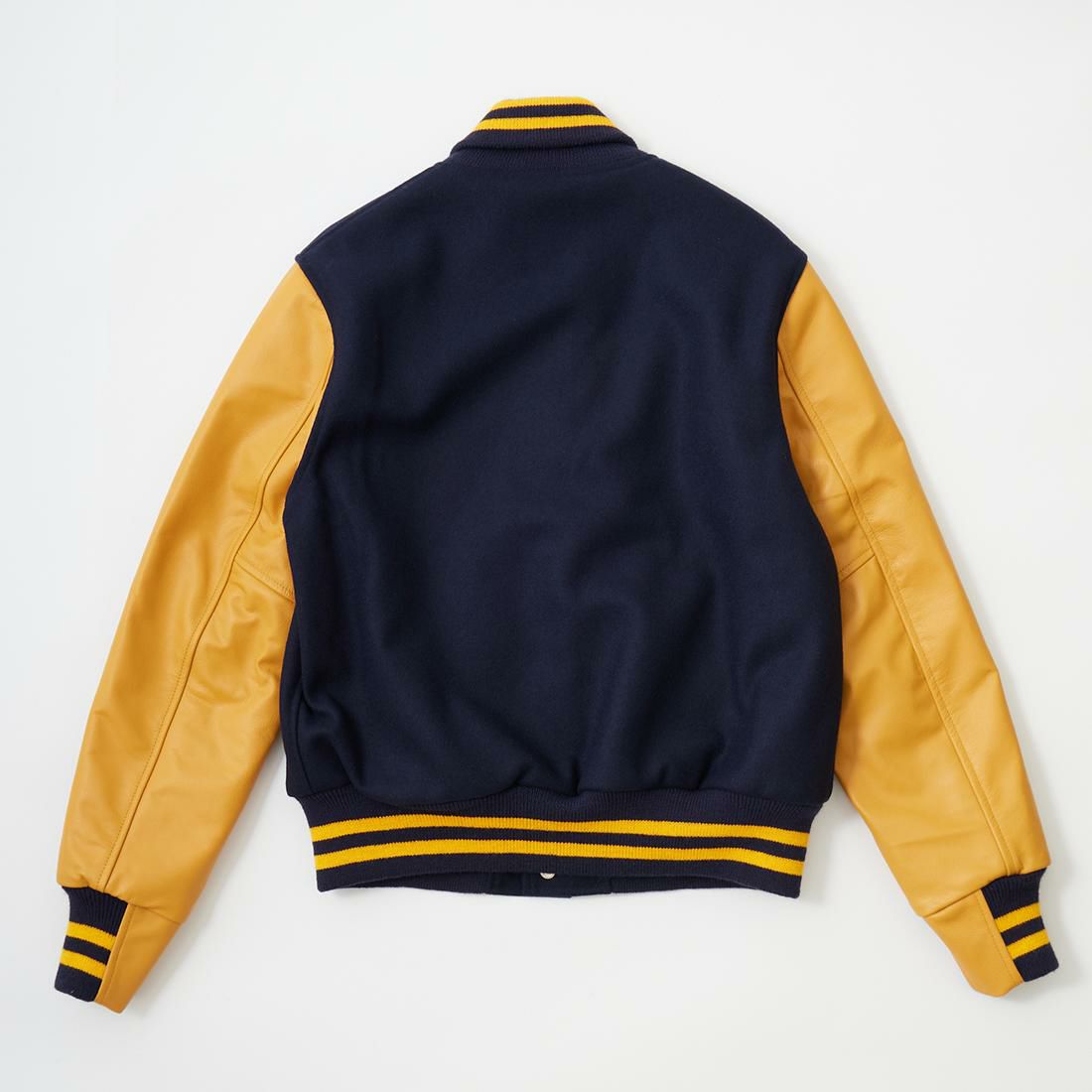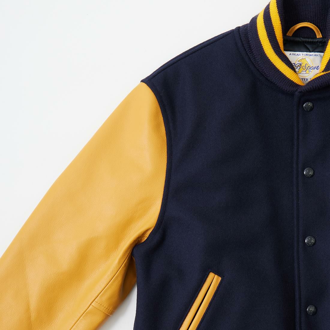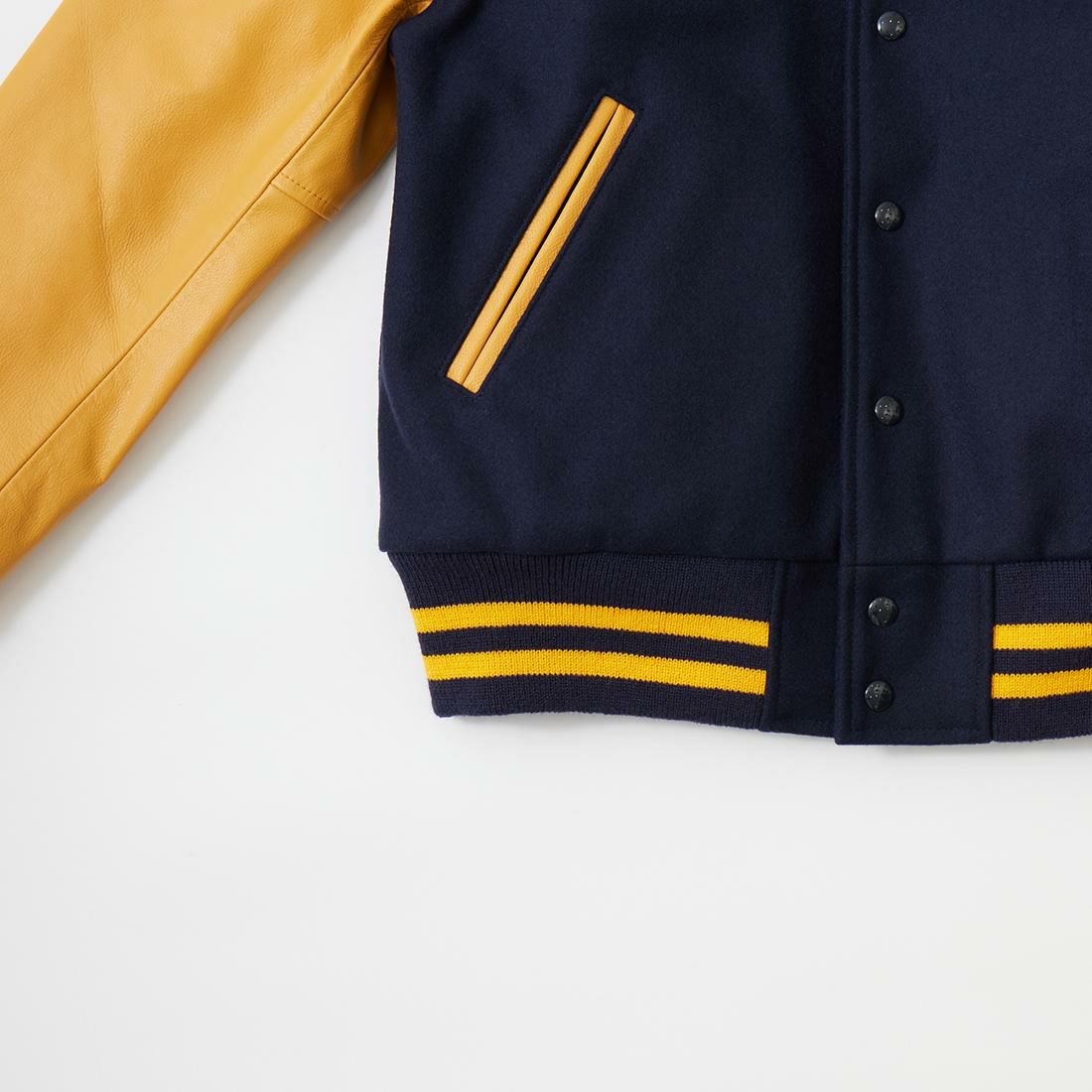 他の画像を見る メンズ アウター スタジャン アメリカ製 アメカジ GB SPORTS (ジービースポーツ) THE ALBANY - CONTEMPORARY FIT SNAP FRONT WOOL LEATHER VARSITY JACKET QUILT LINING - NAVY MELTON_GOLD COW LEATHER 販売価格 ¥ 129,800 税込 お気に入りに登録する